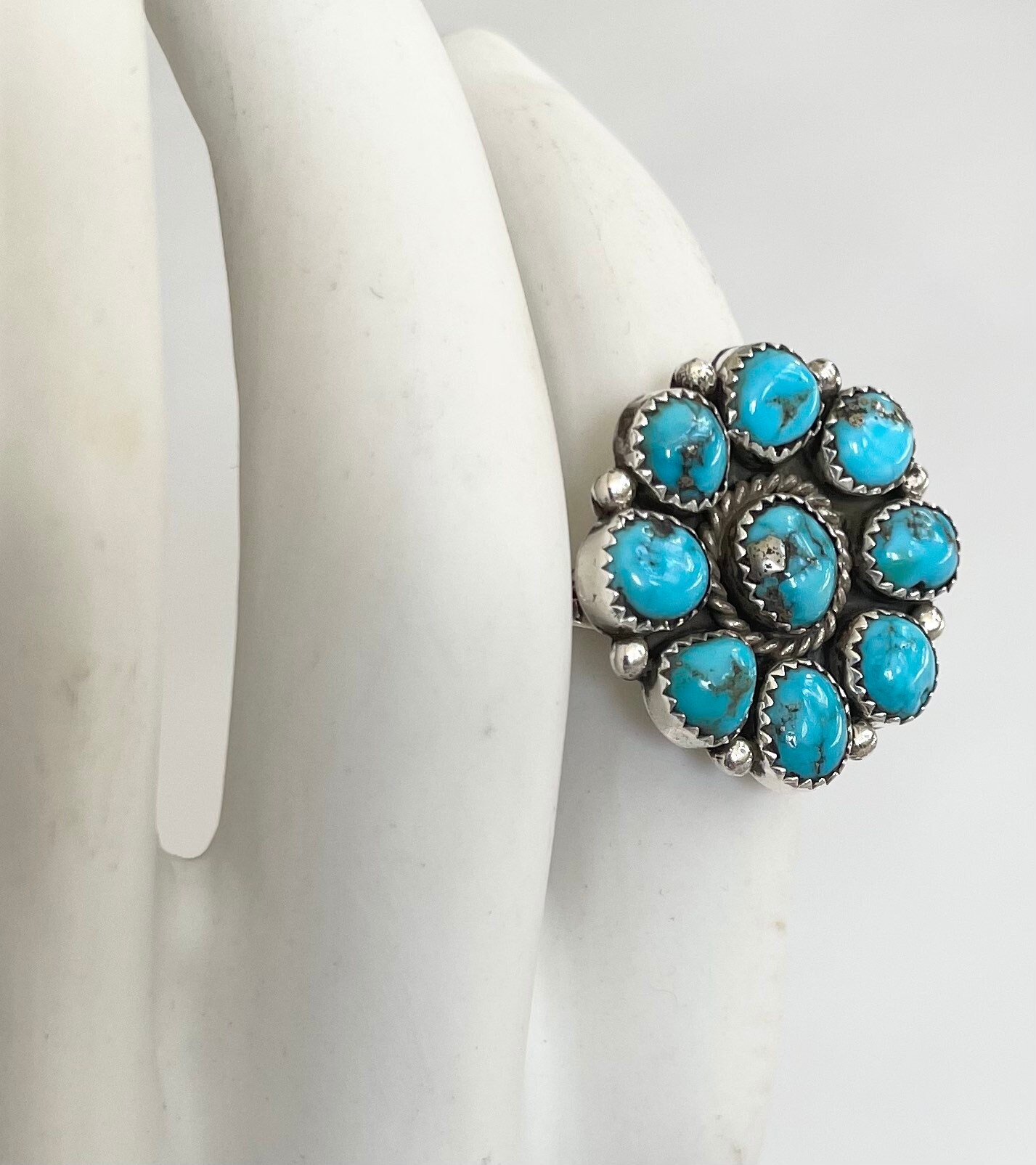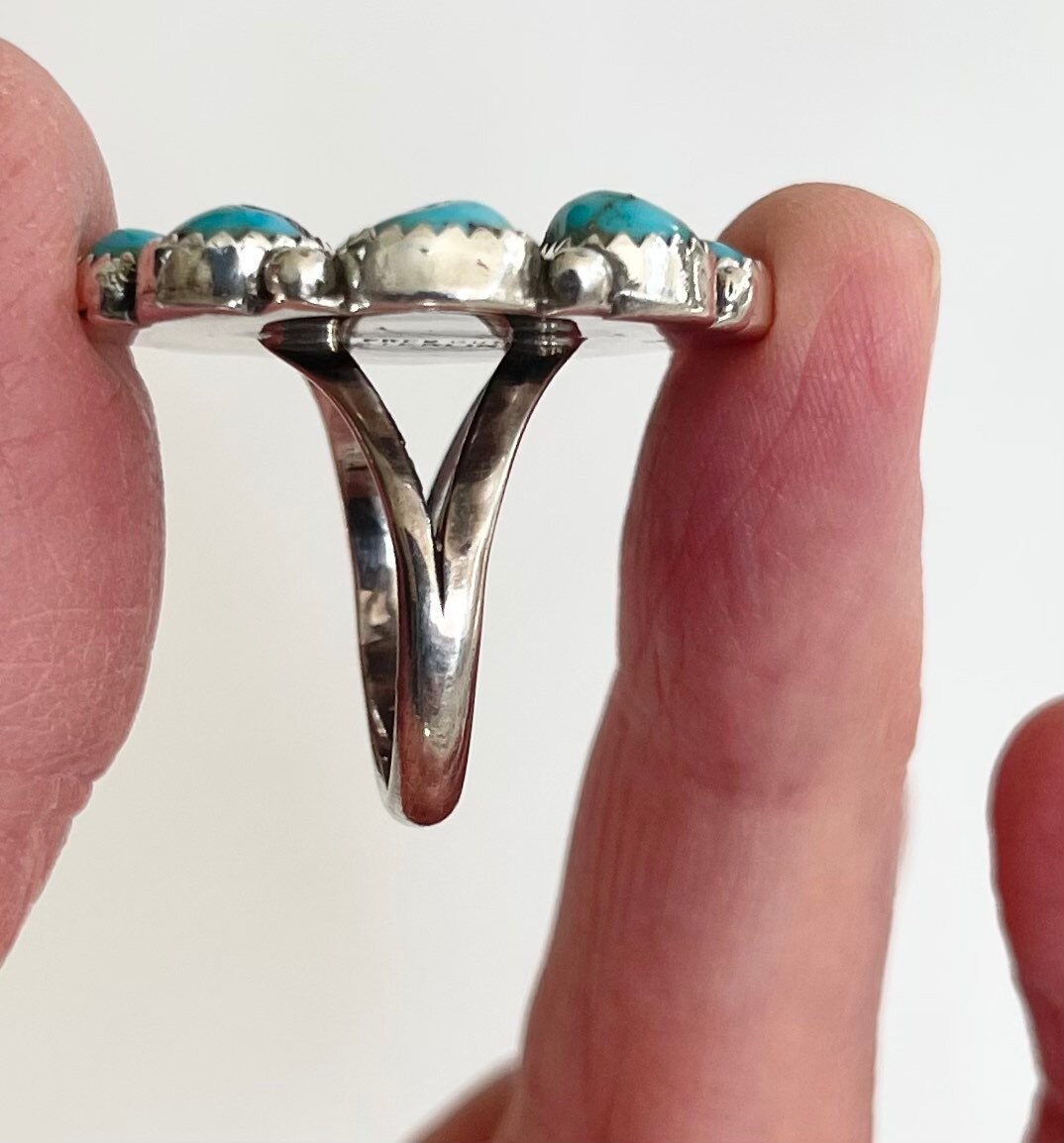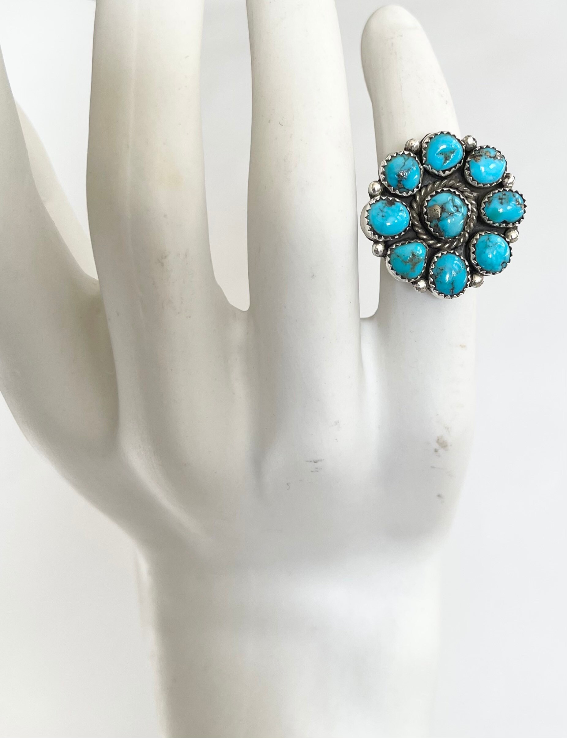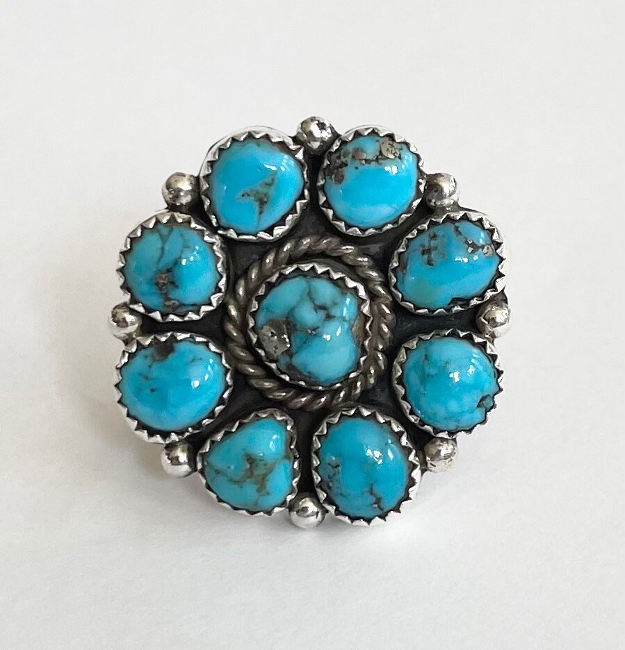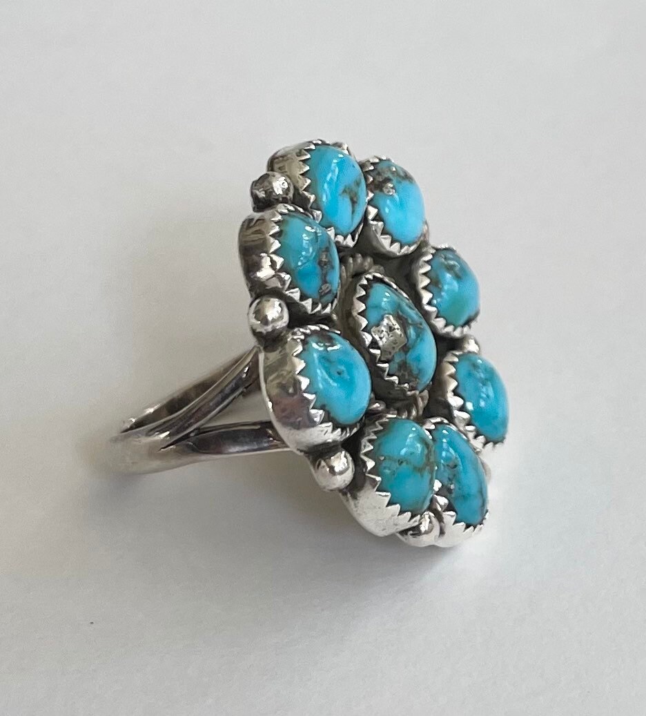 Solidly crafted vintage Native American Navajo sterling silver and turquoise cluster ring made by Navajo silversmith, Fred Guerrero