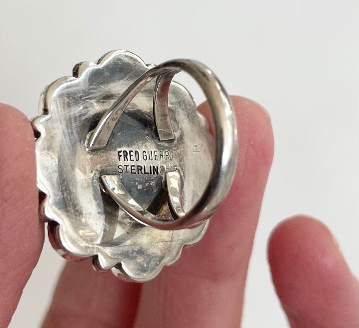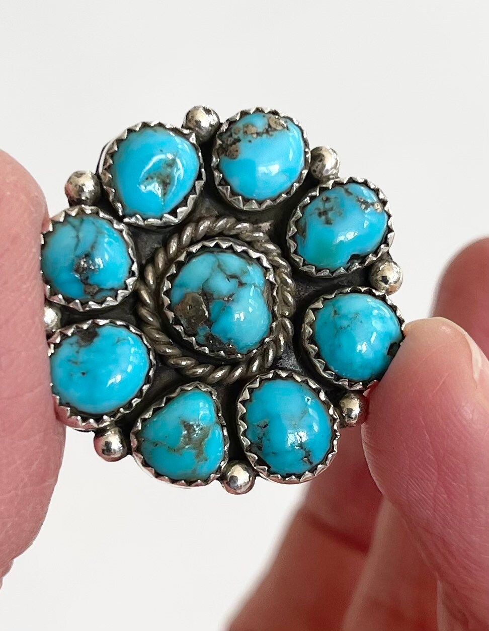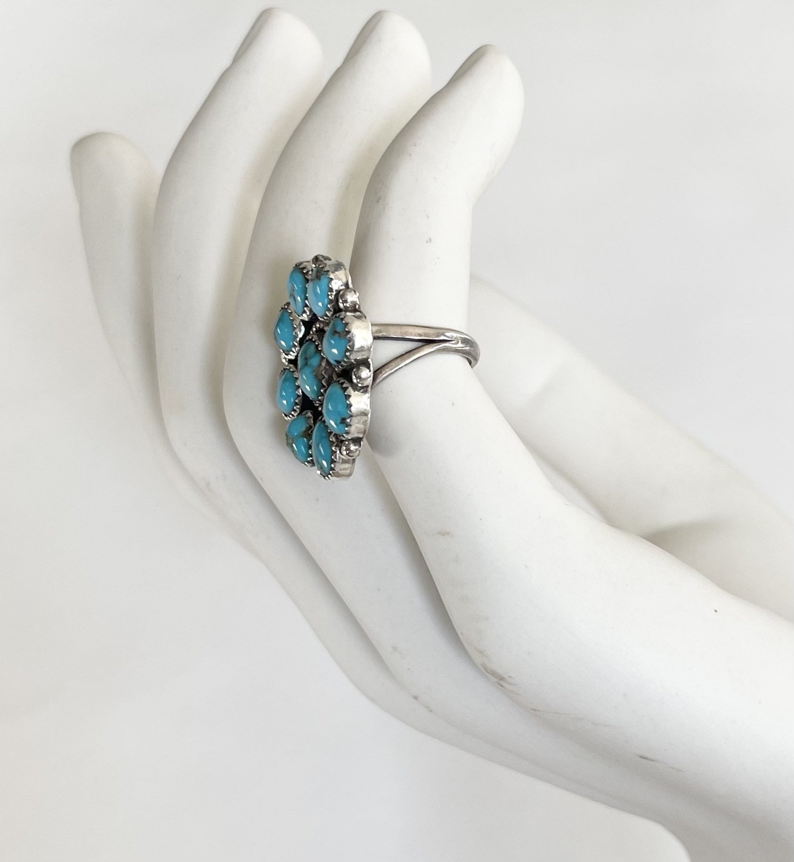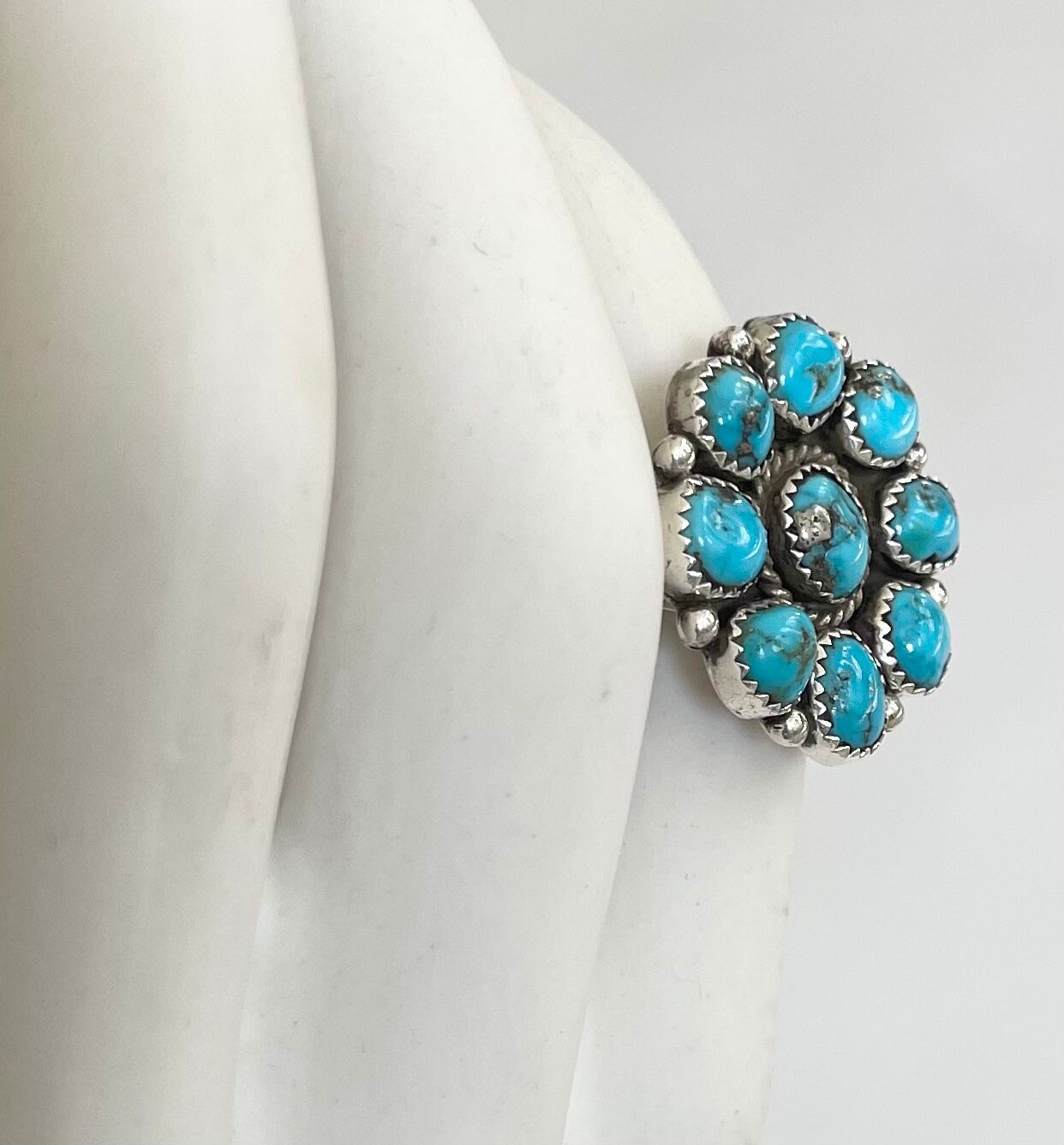 Solidly crafted vintage Native American Navajo sterling silver and turquoise cluster ring made by Navajo silversmith, Fred Guerrero