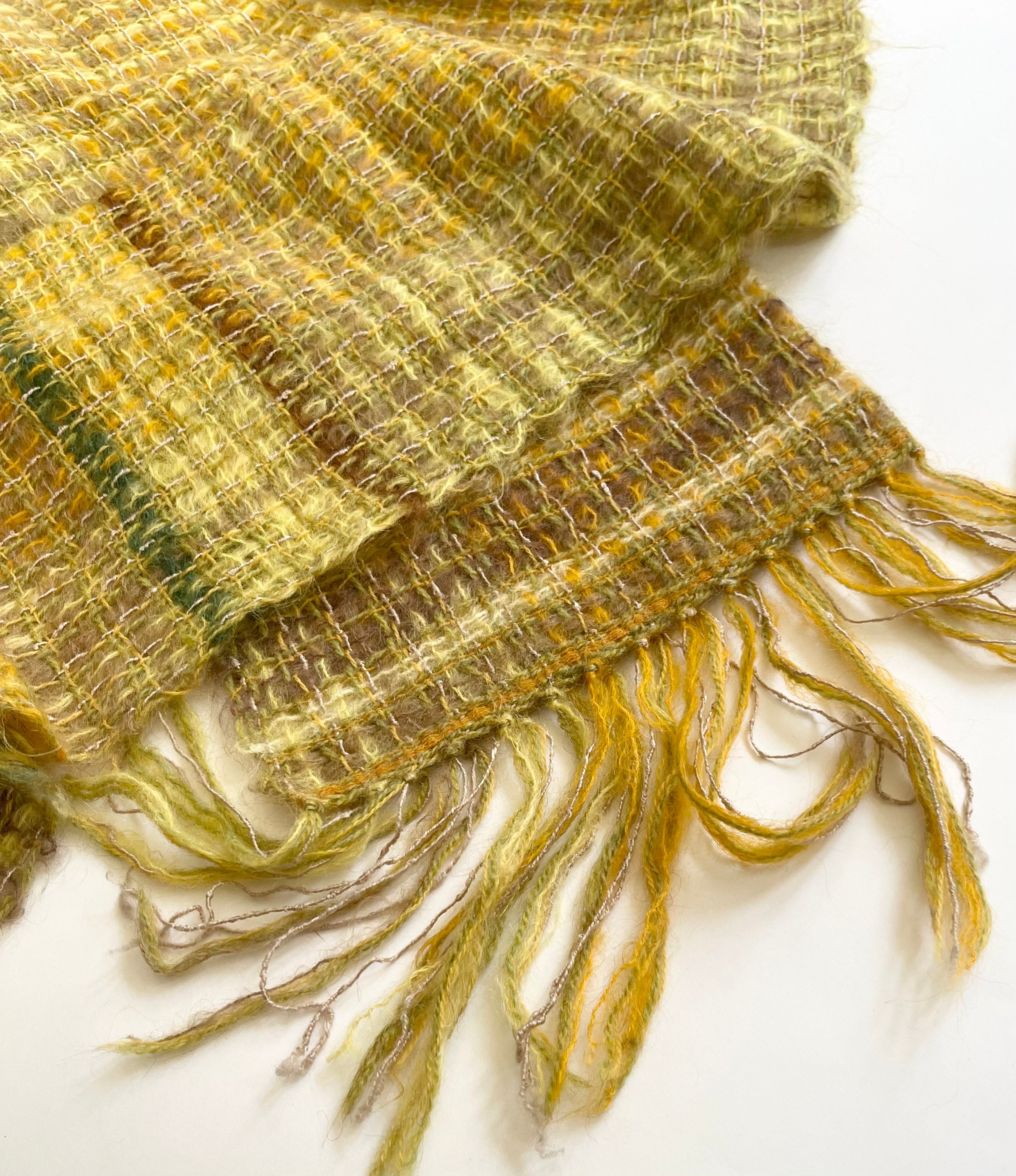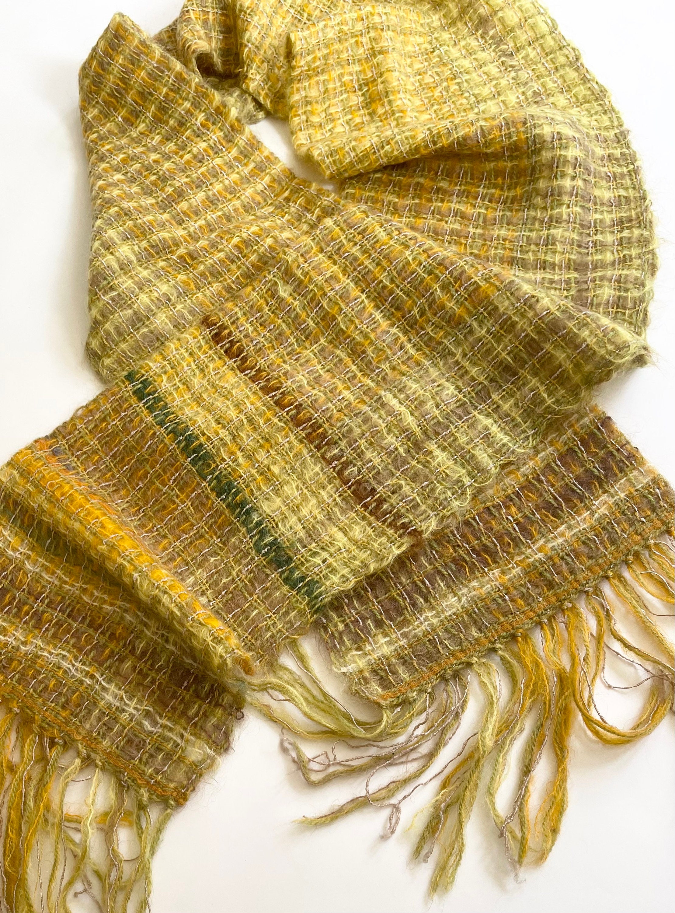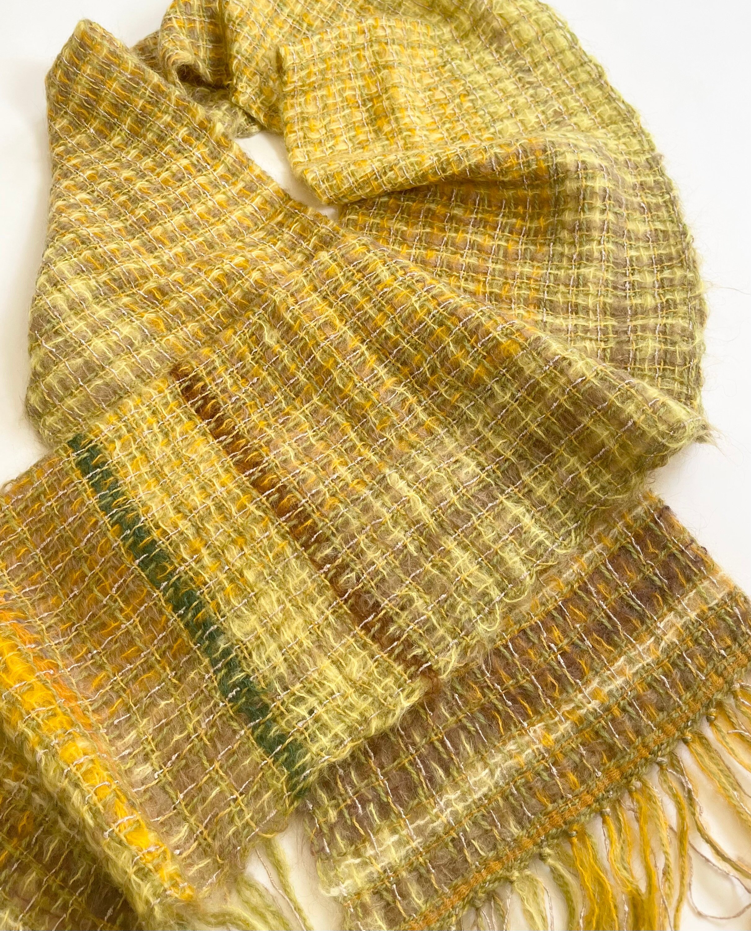 Fluffy vintage handwoven mohair scarf with fringe edges