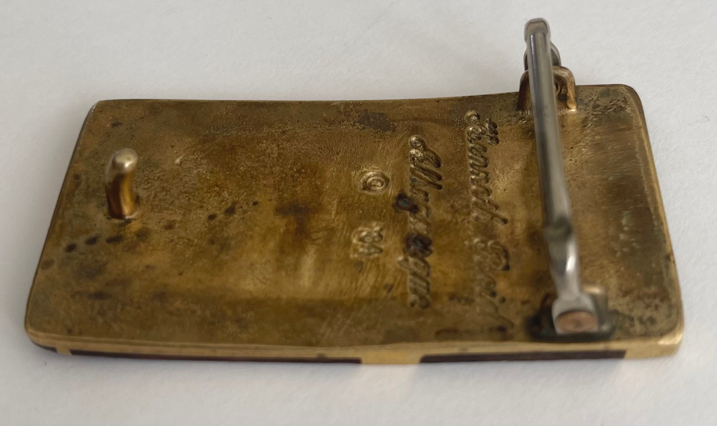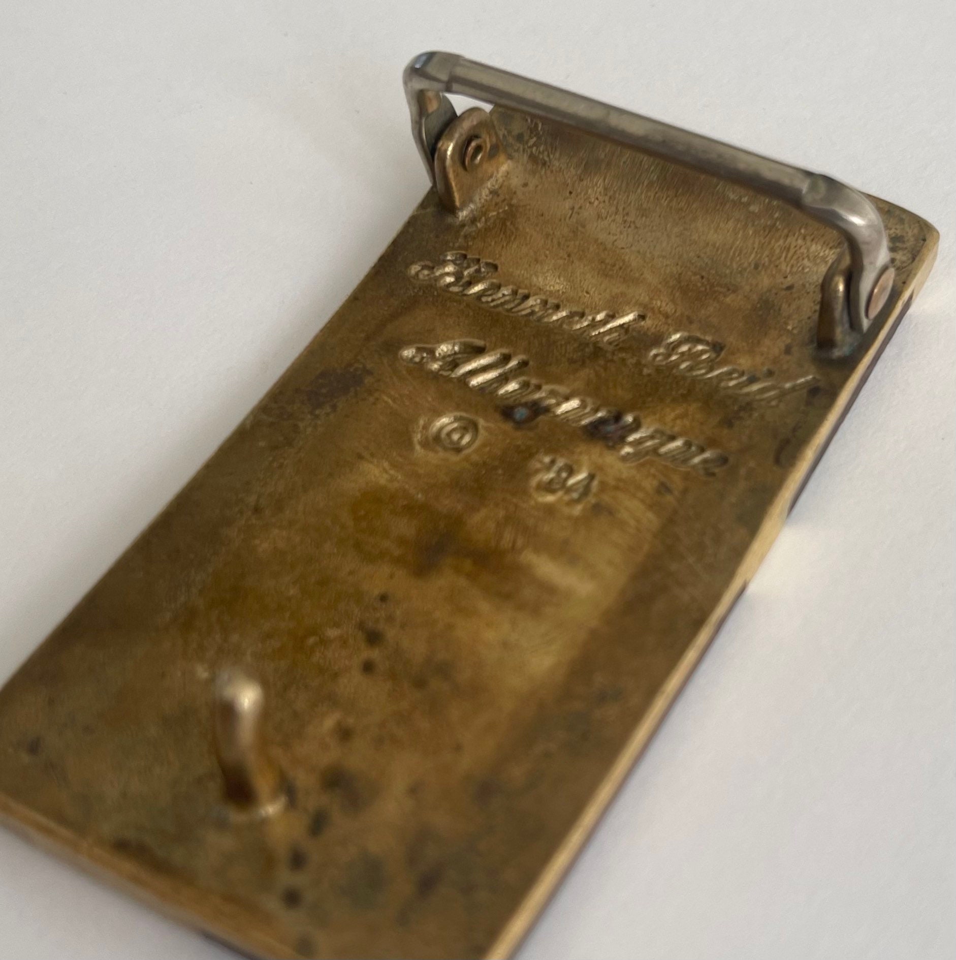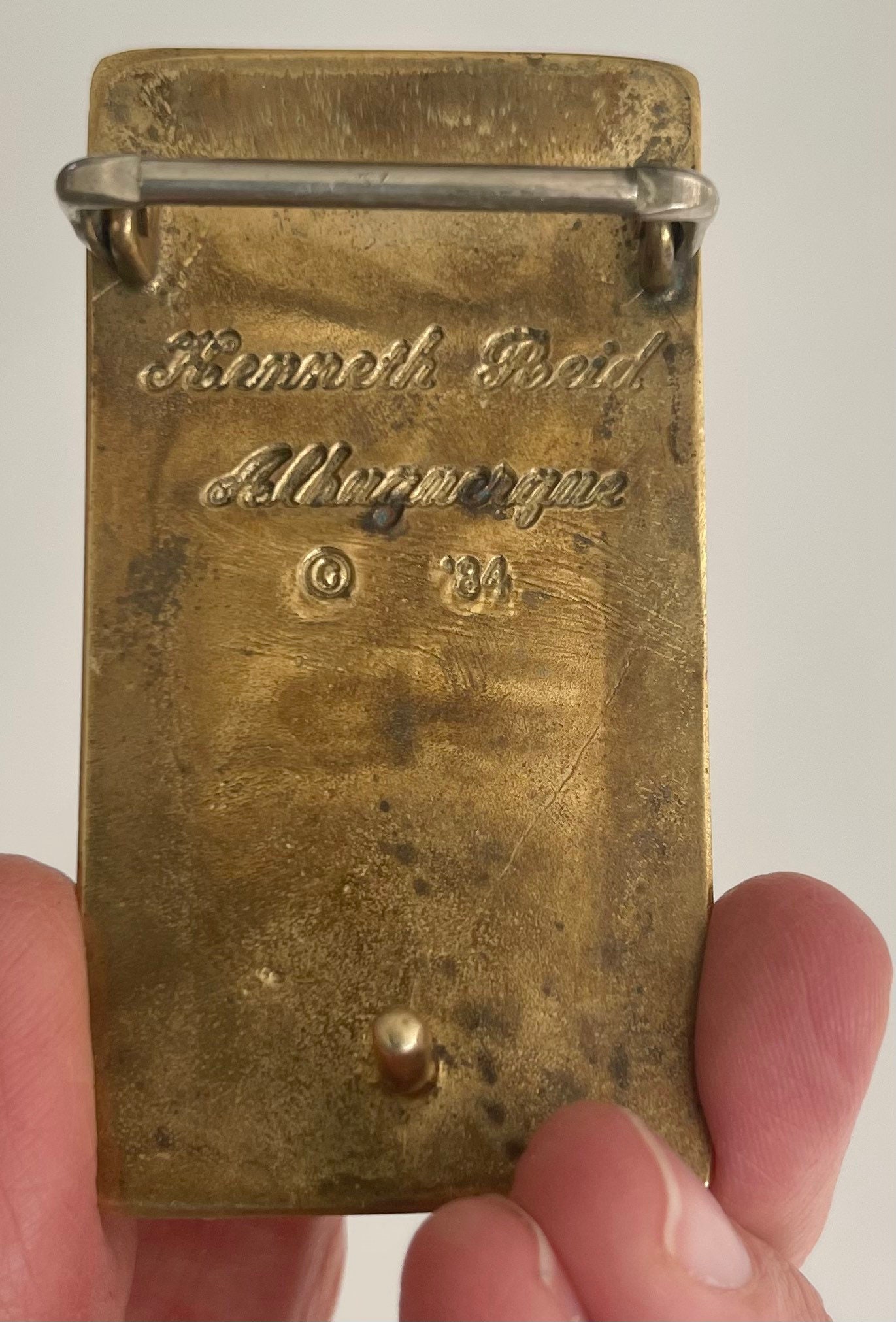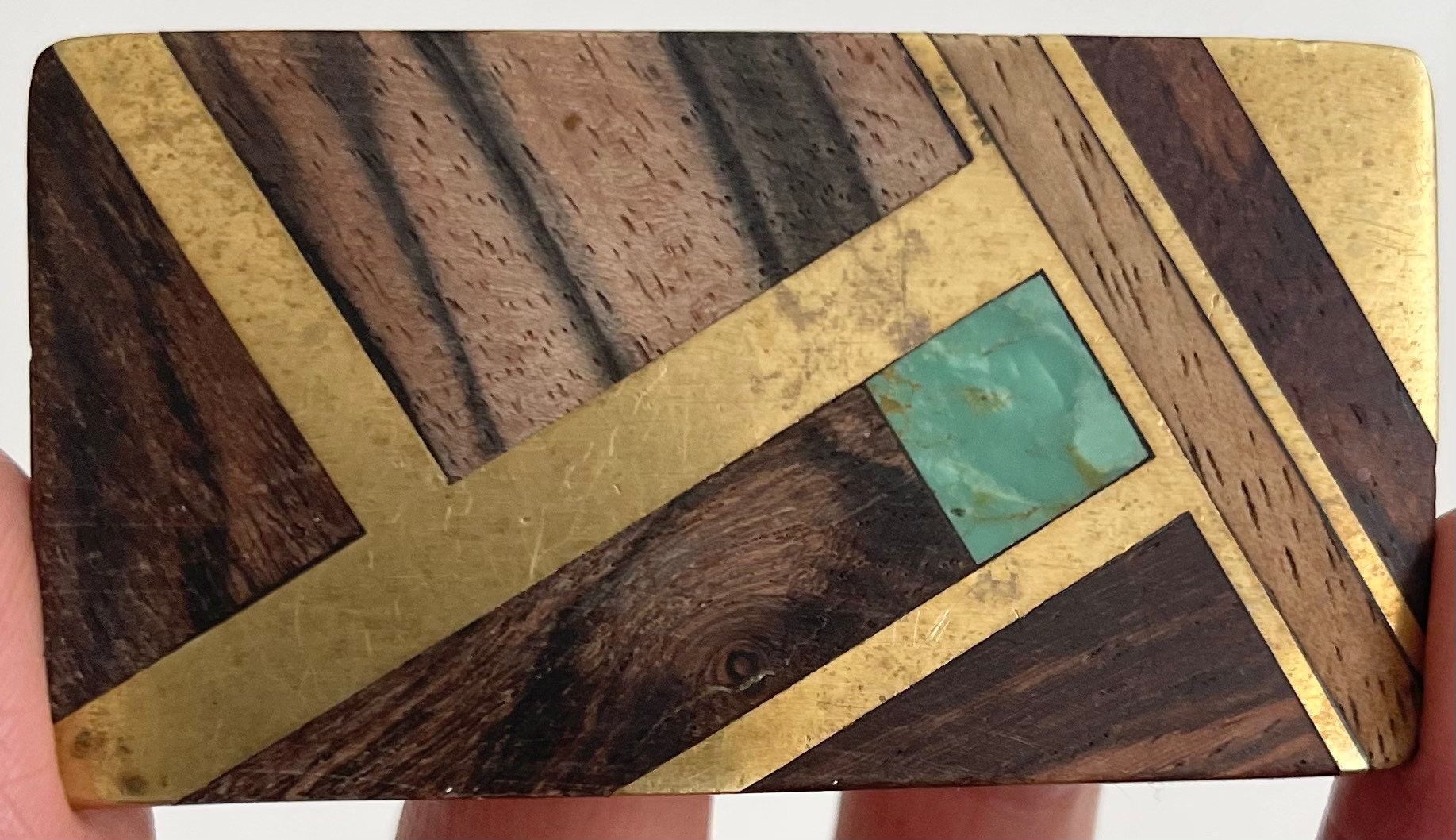 Handsome vintage 80's solid brass, wood and turquoise inlay belt buckle crafted by Kenneth Reid, Albuquerque, NM