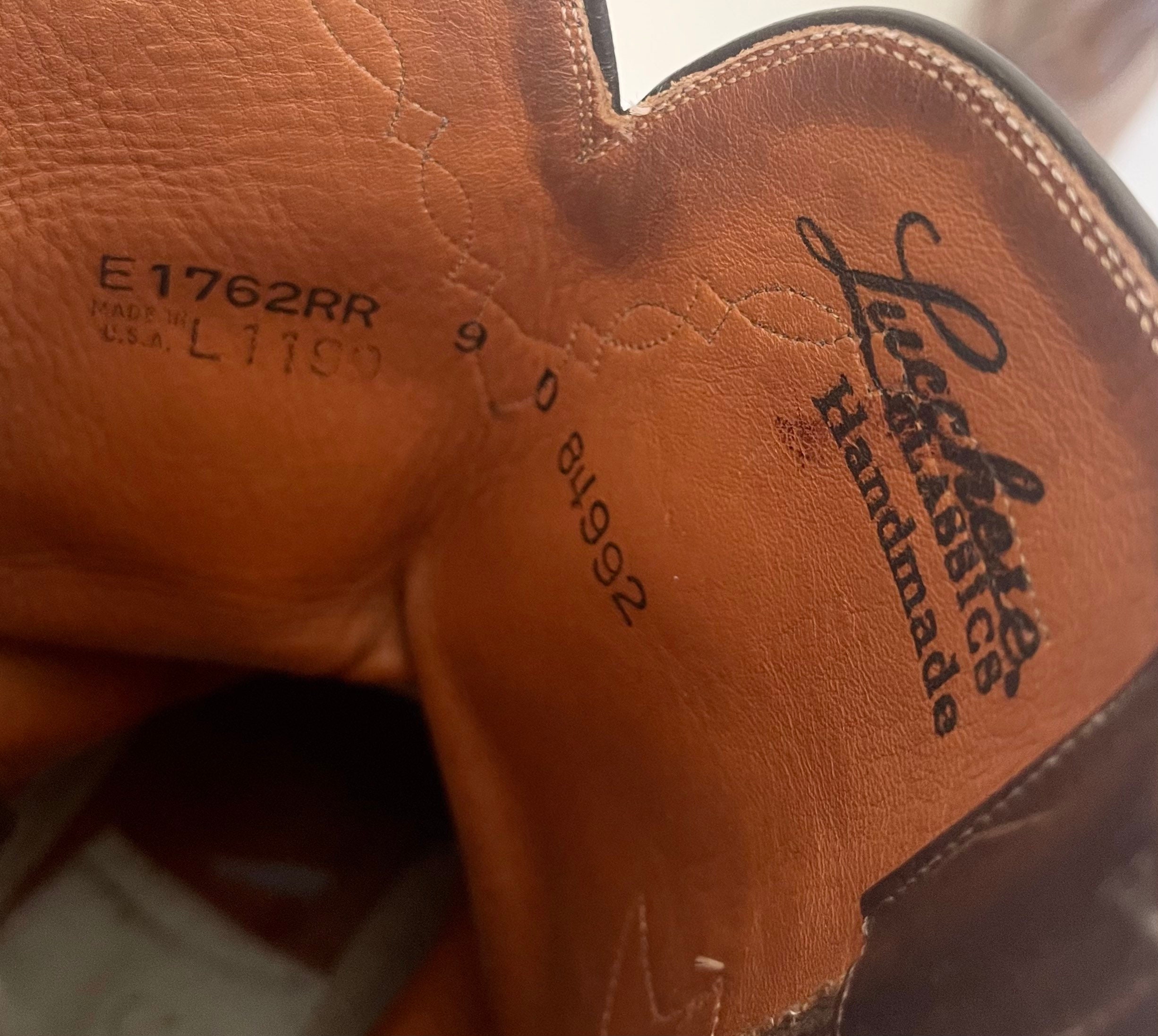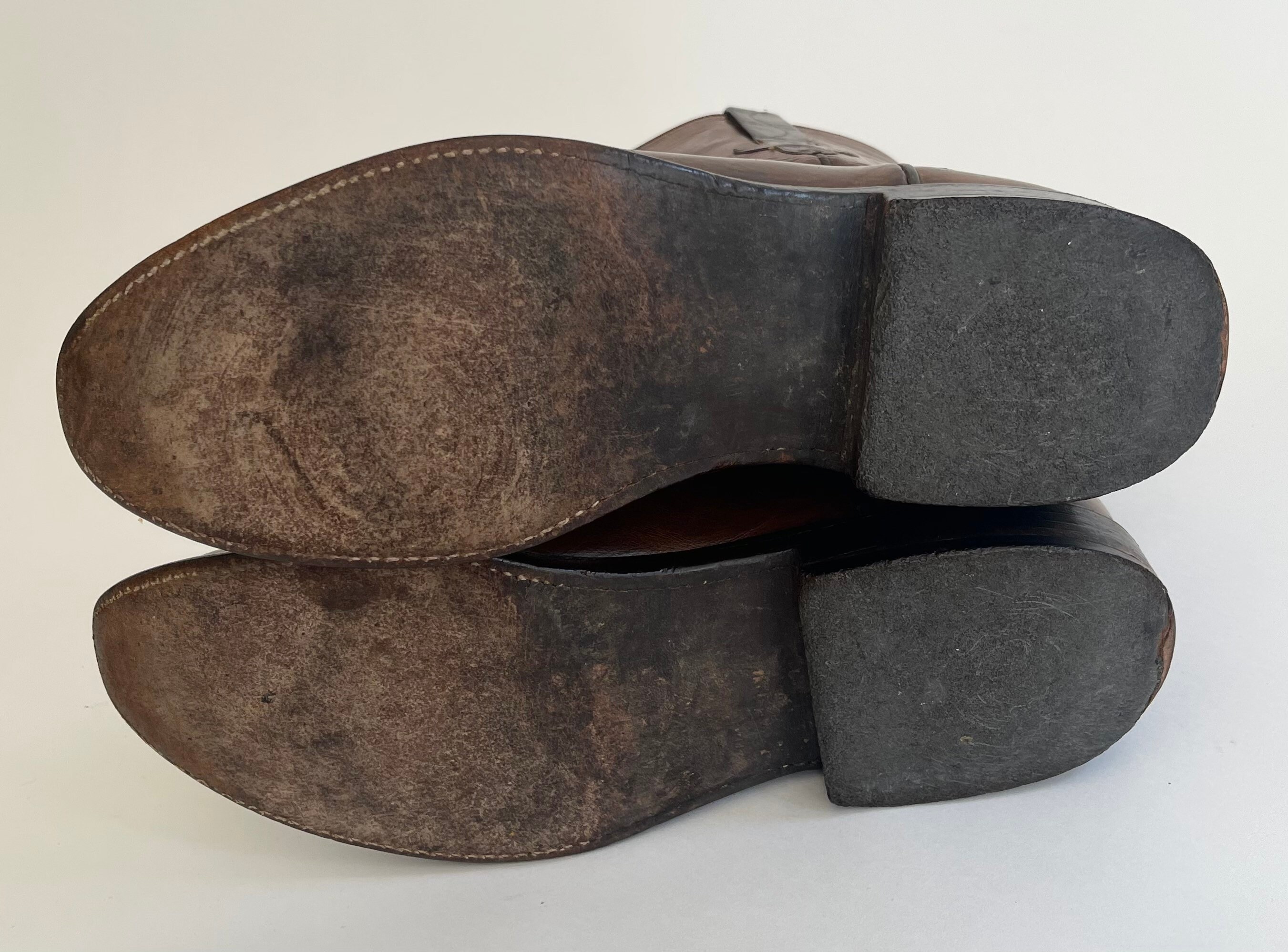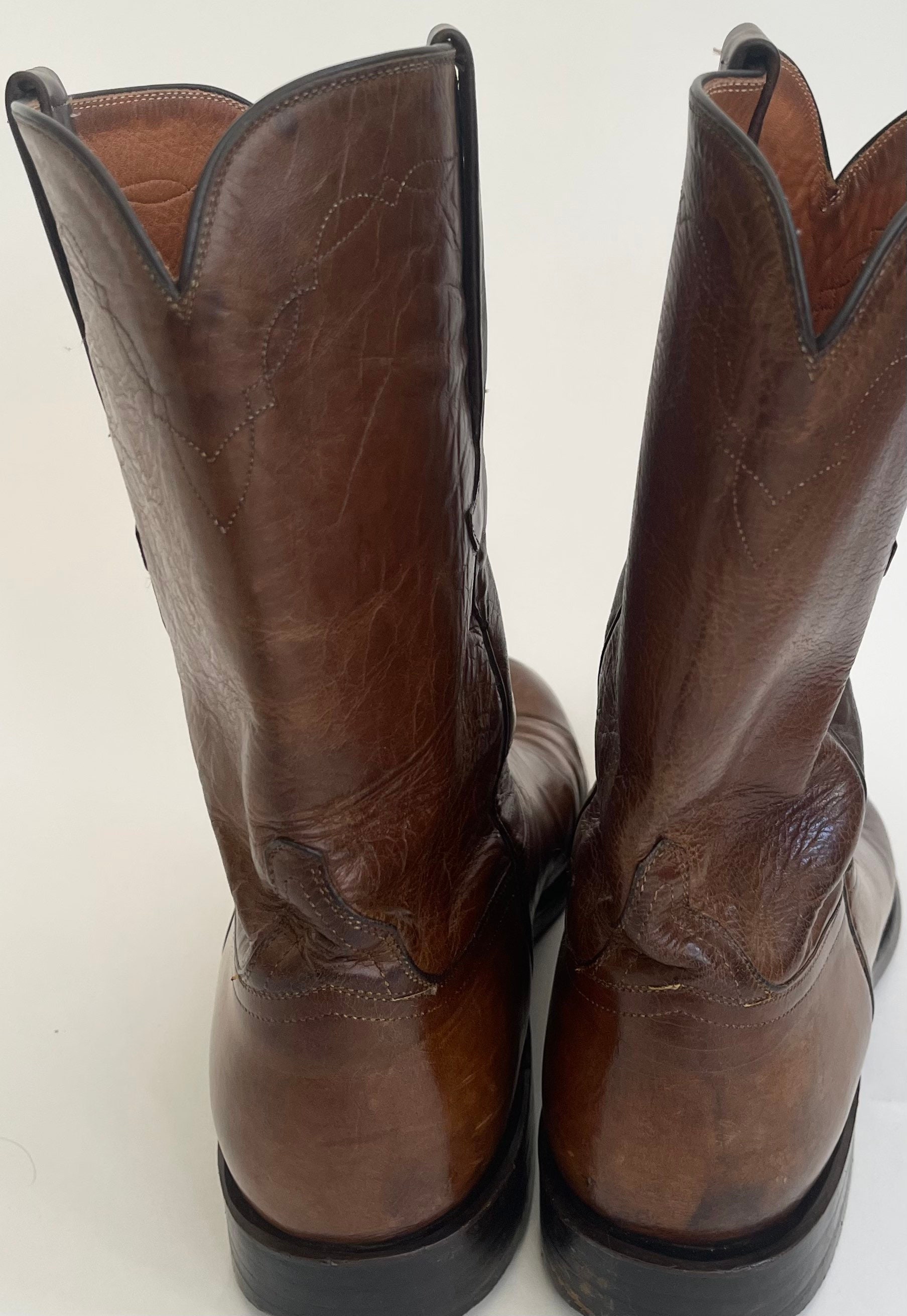 Handsome vintage handmade Lucchese dark brown leather cowboy boots with subtle Western detailing at sides