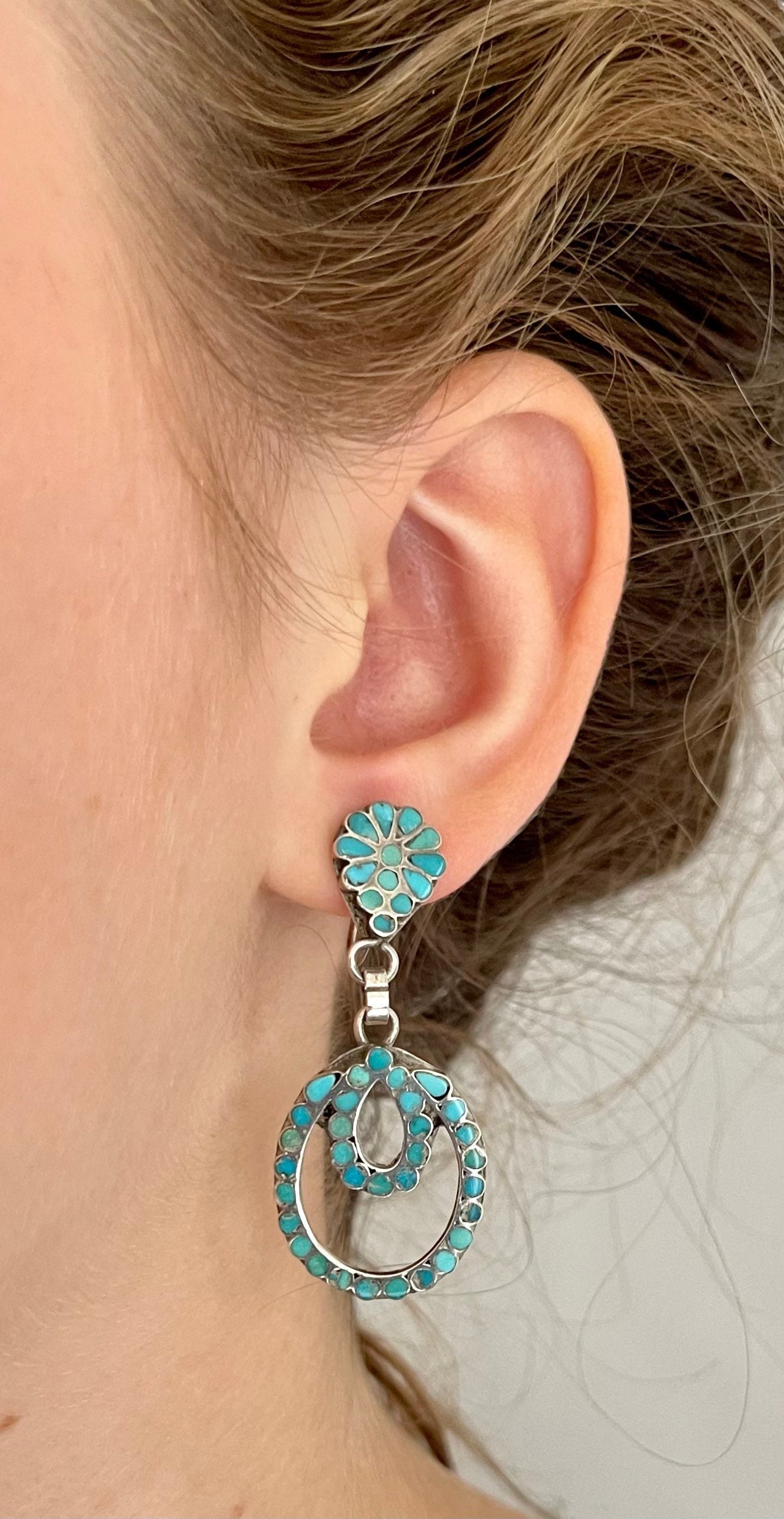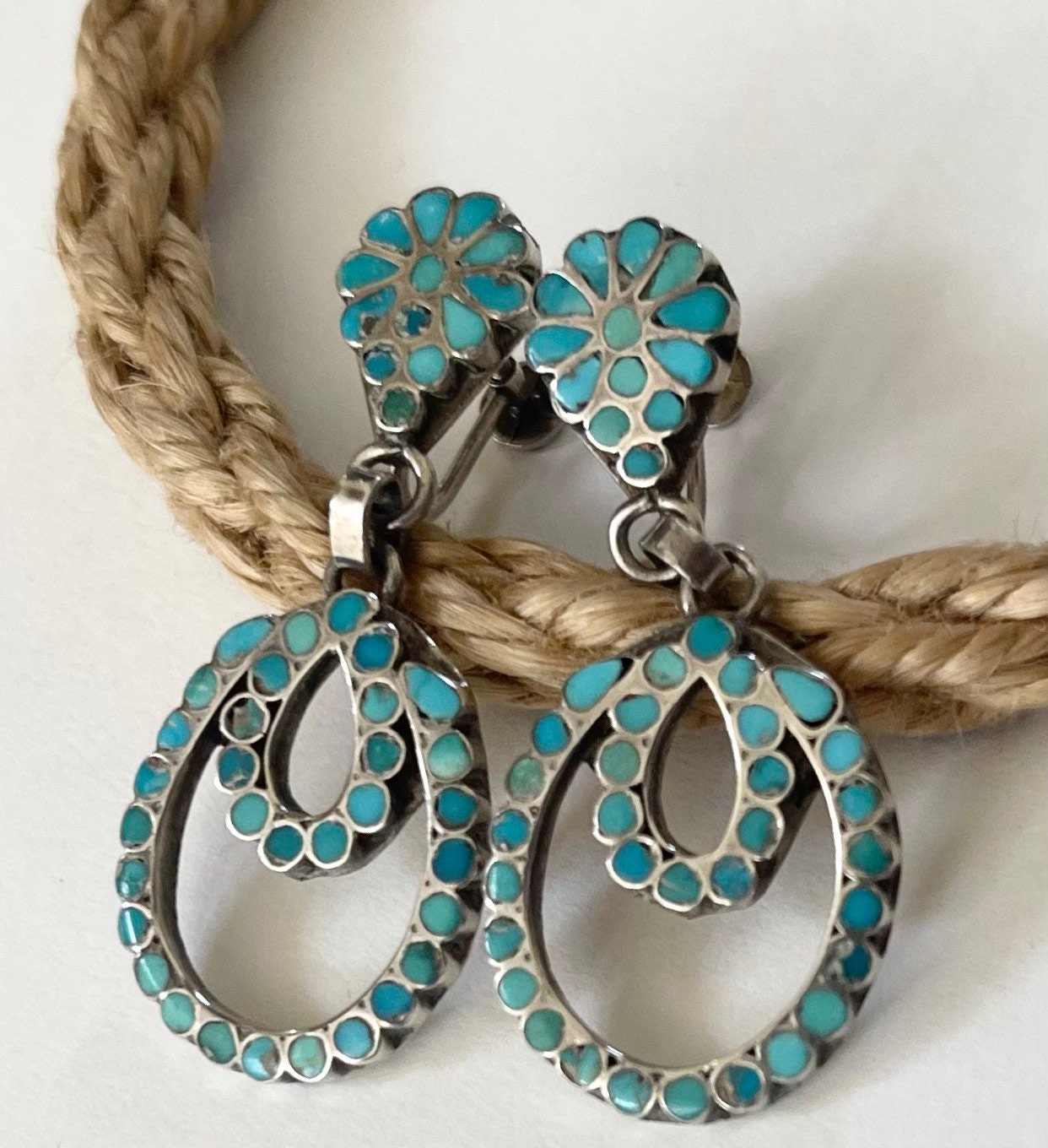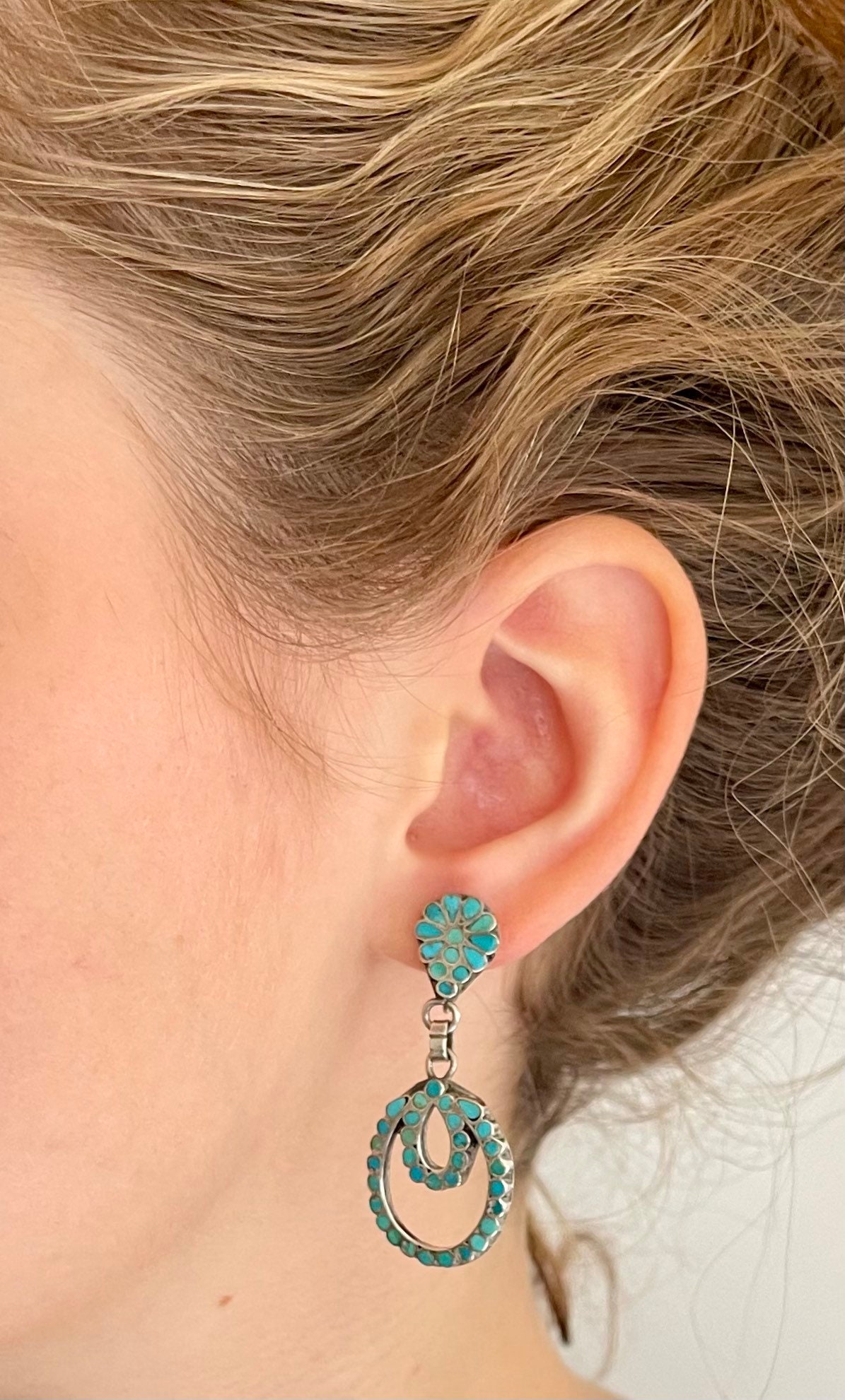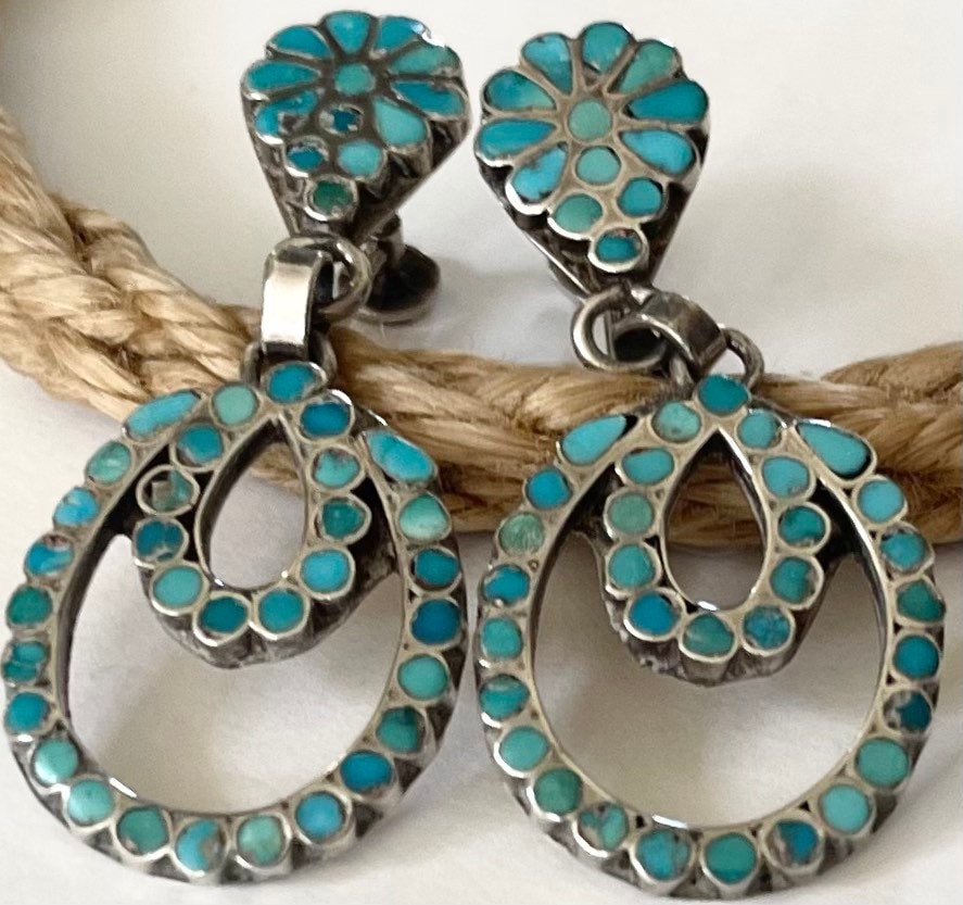 Fantastic antique Native American Dishta sterling silver and flush turquoise inlay dangle arrings