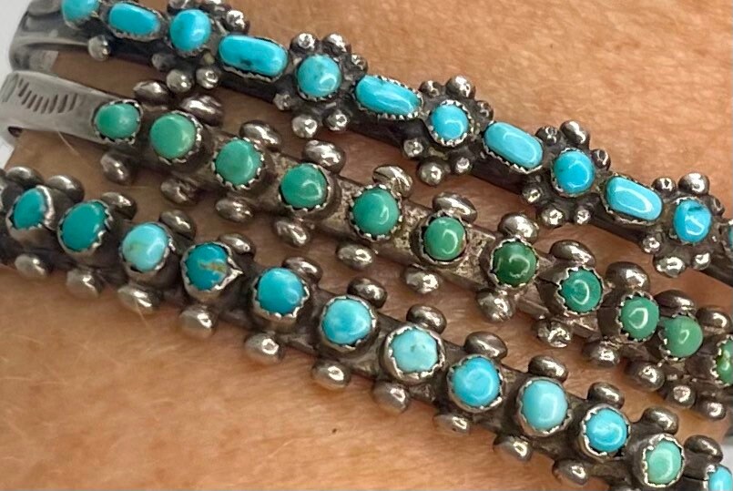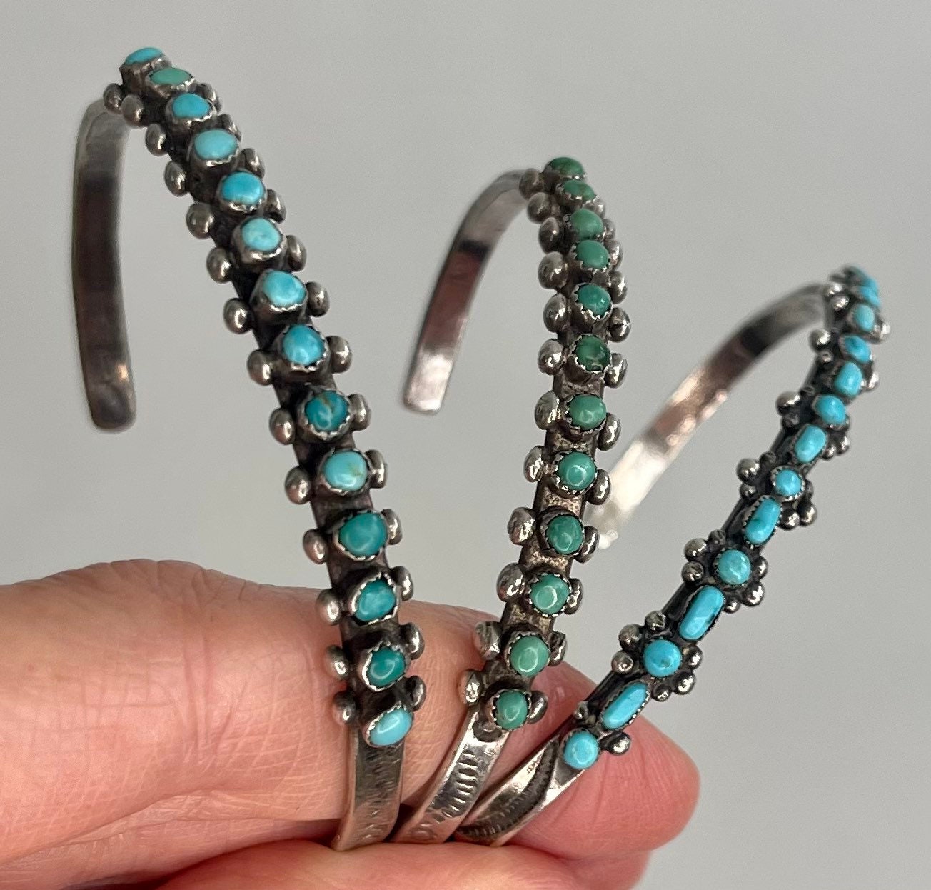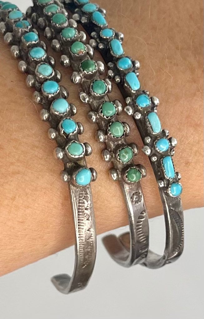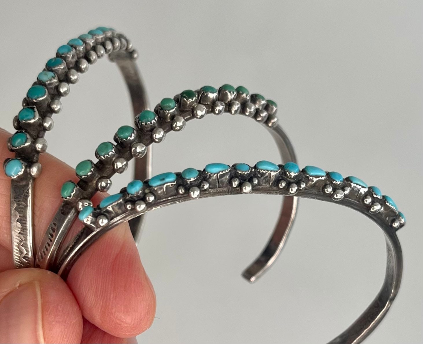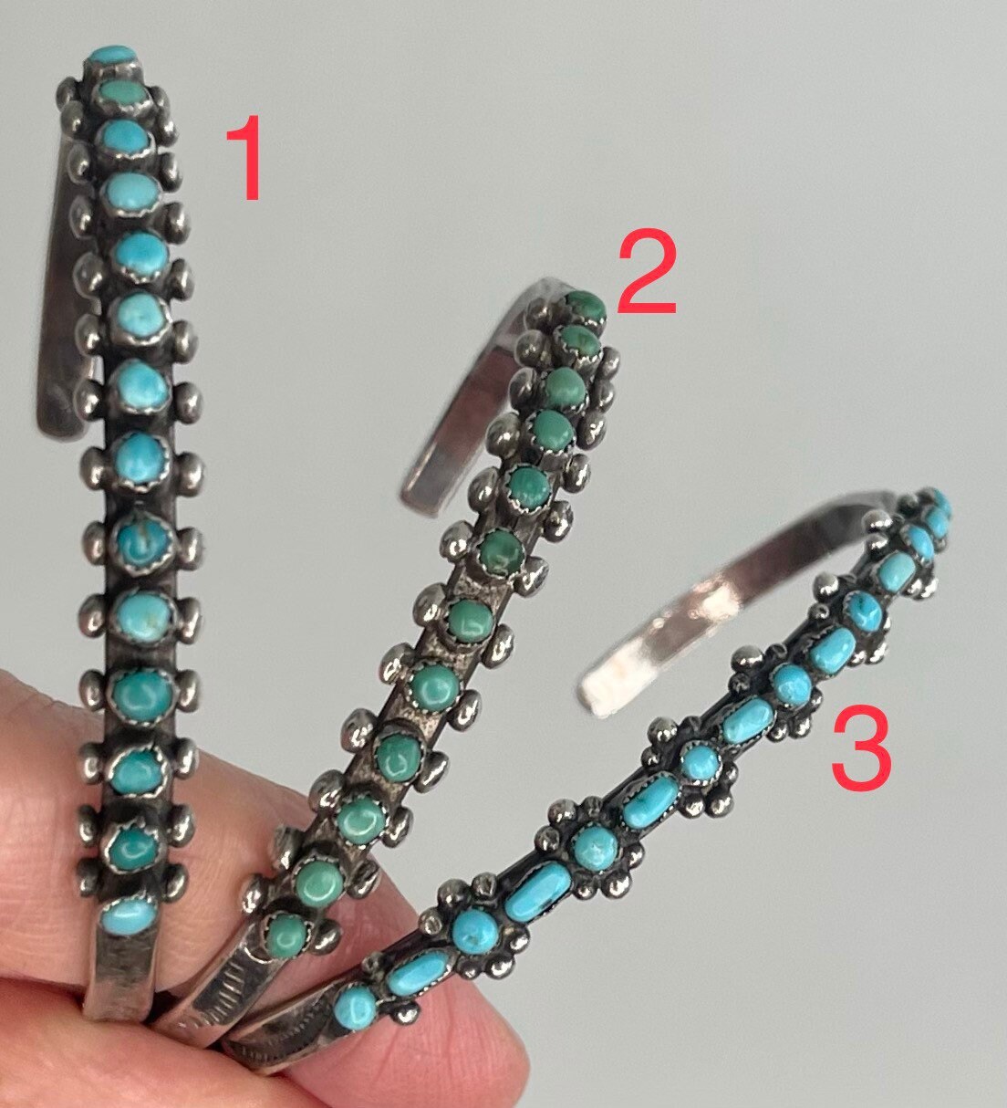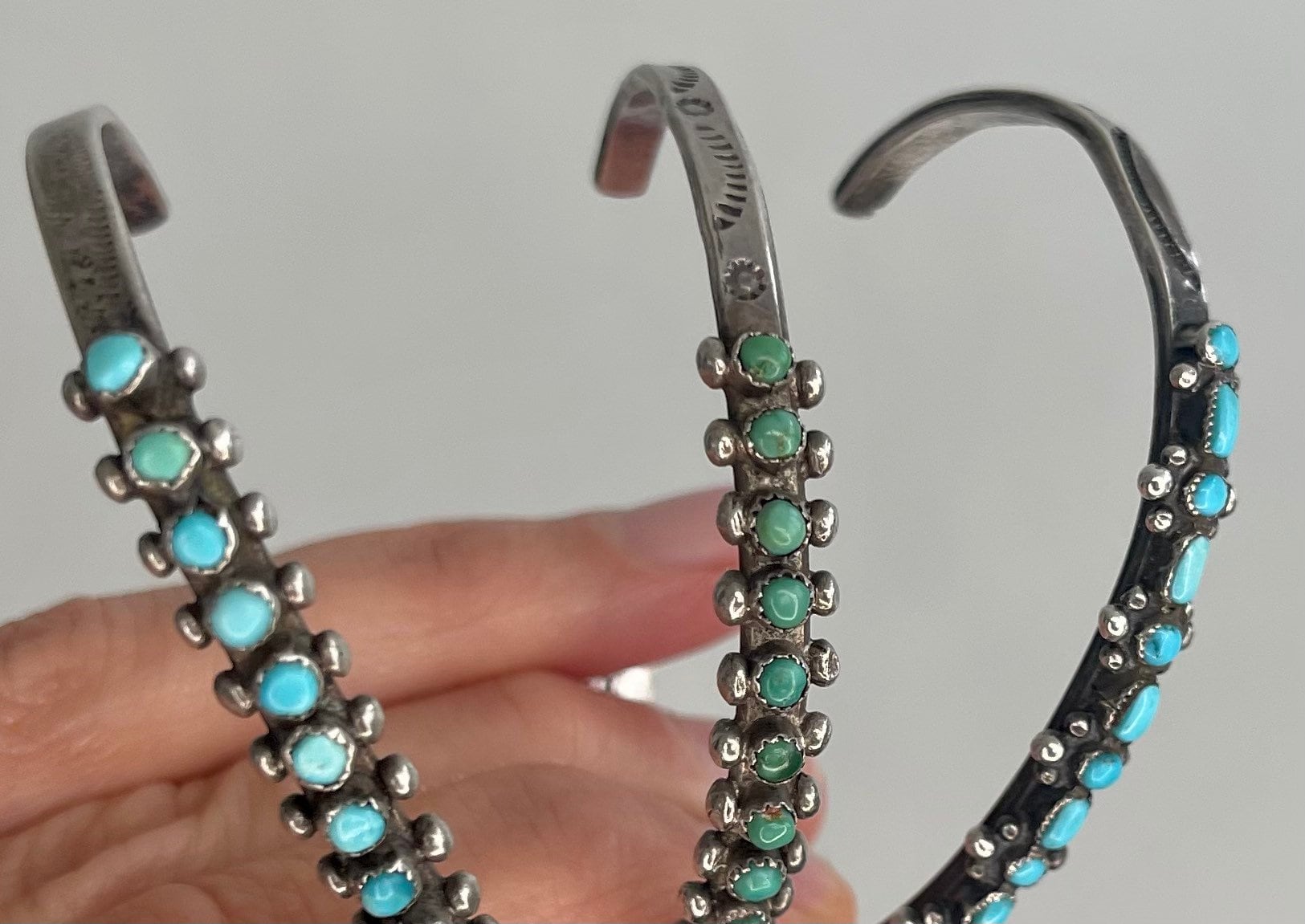 Vintage old pawn Native American Zuni sterling silver cuff bracelets with snake eye set natural turquoise stones