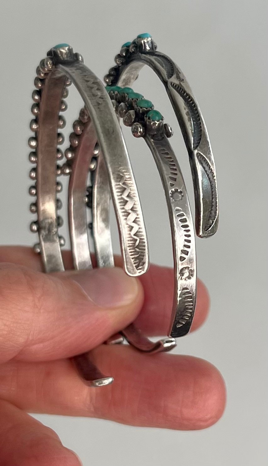 STYLE #1: Lightly stamped band with 14 blue turquoise stones. Measures 5-9/16" long with an opening of 1-1/8". Total interior circumference is 6-11/16" and most suitable for a medium/large ladies or small men's wrist. Good vintage condition with aged patina and minor asymmetry in the band.
