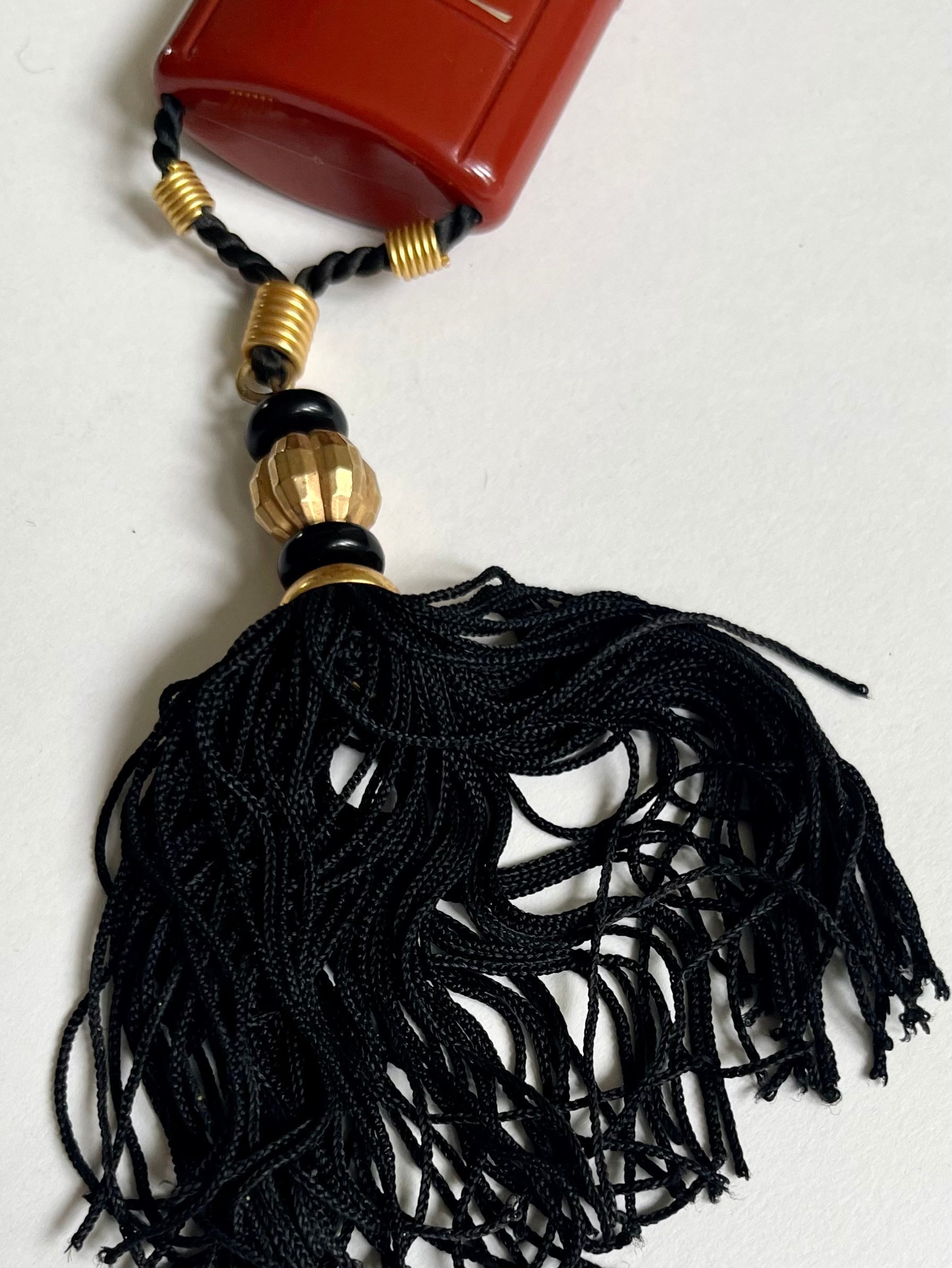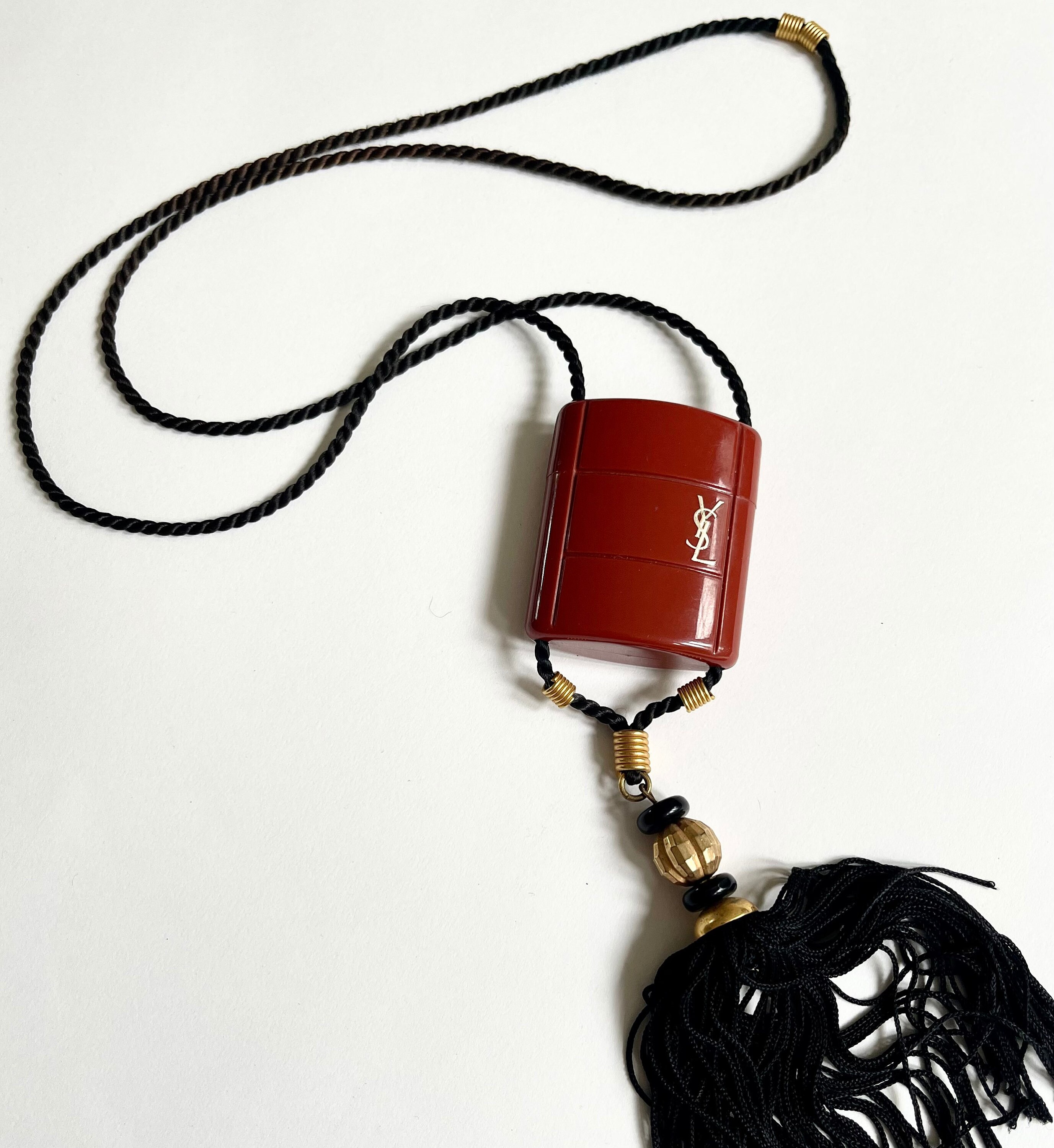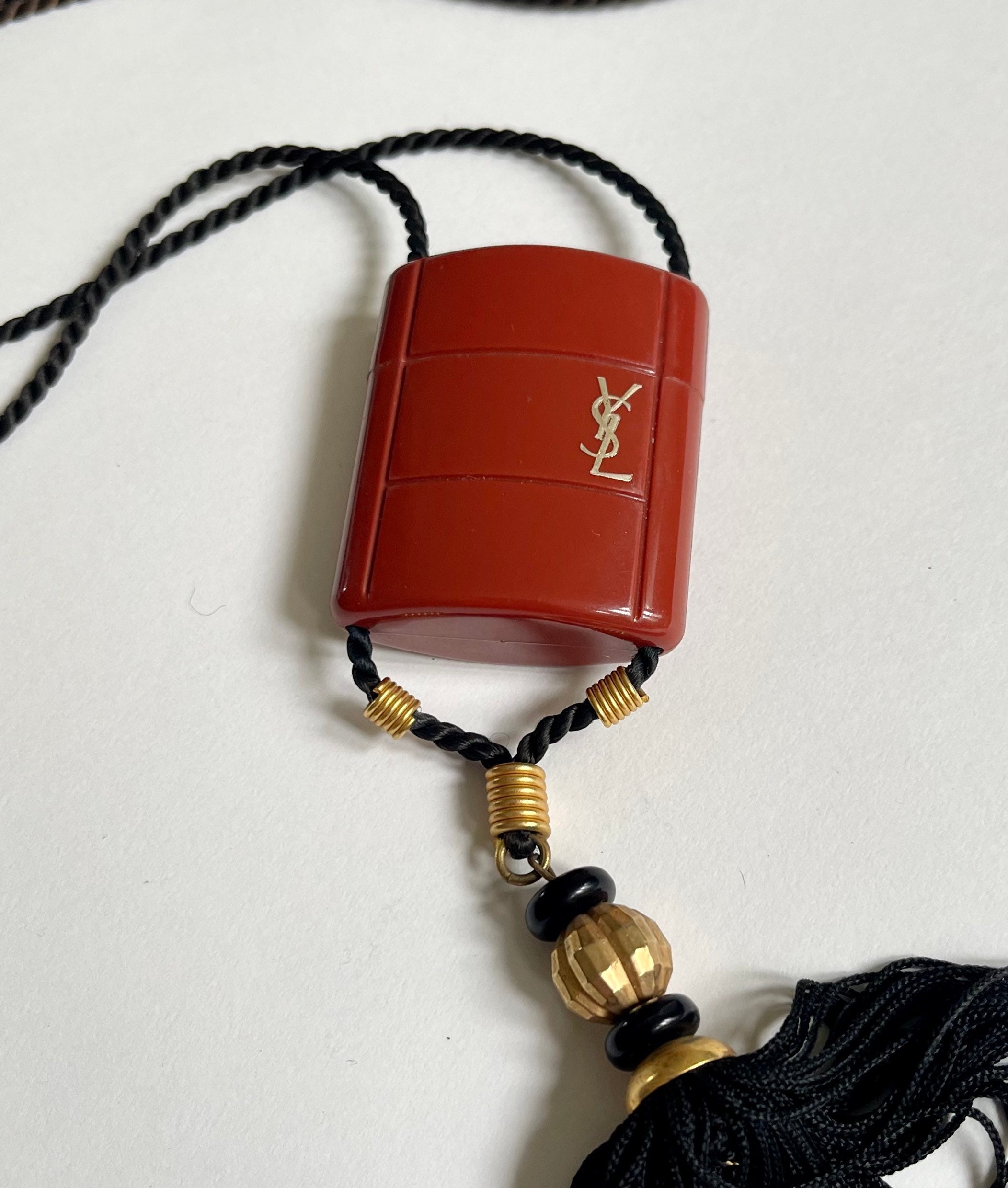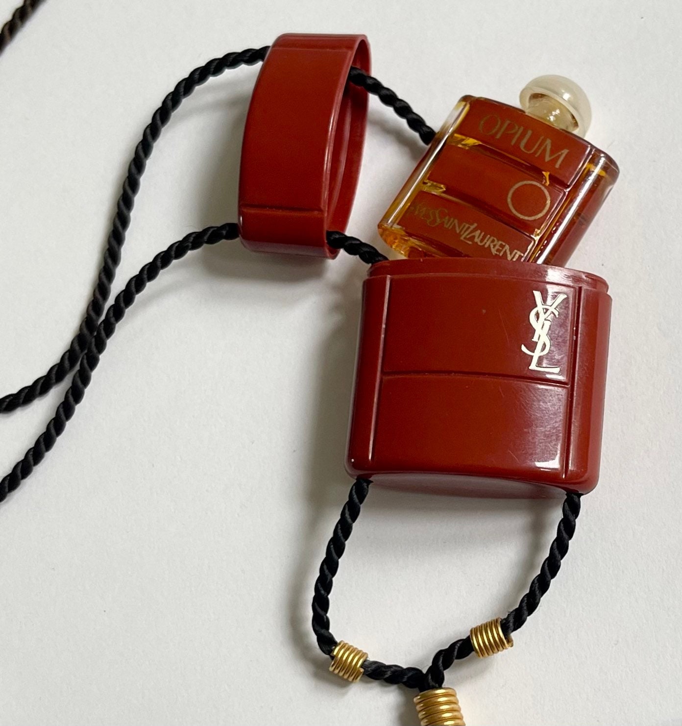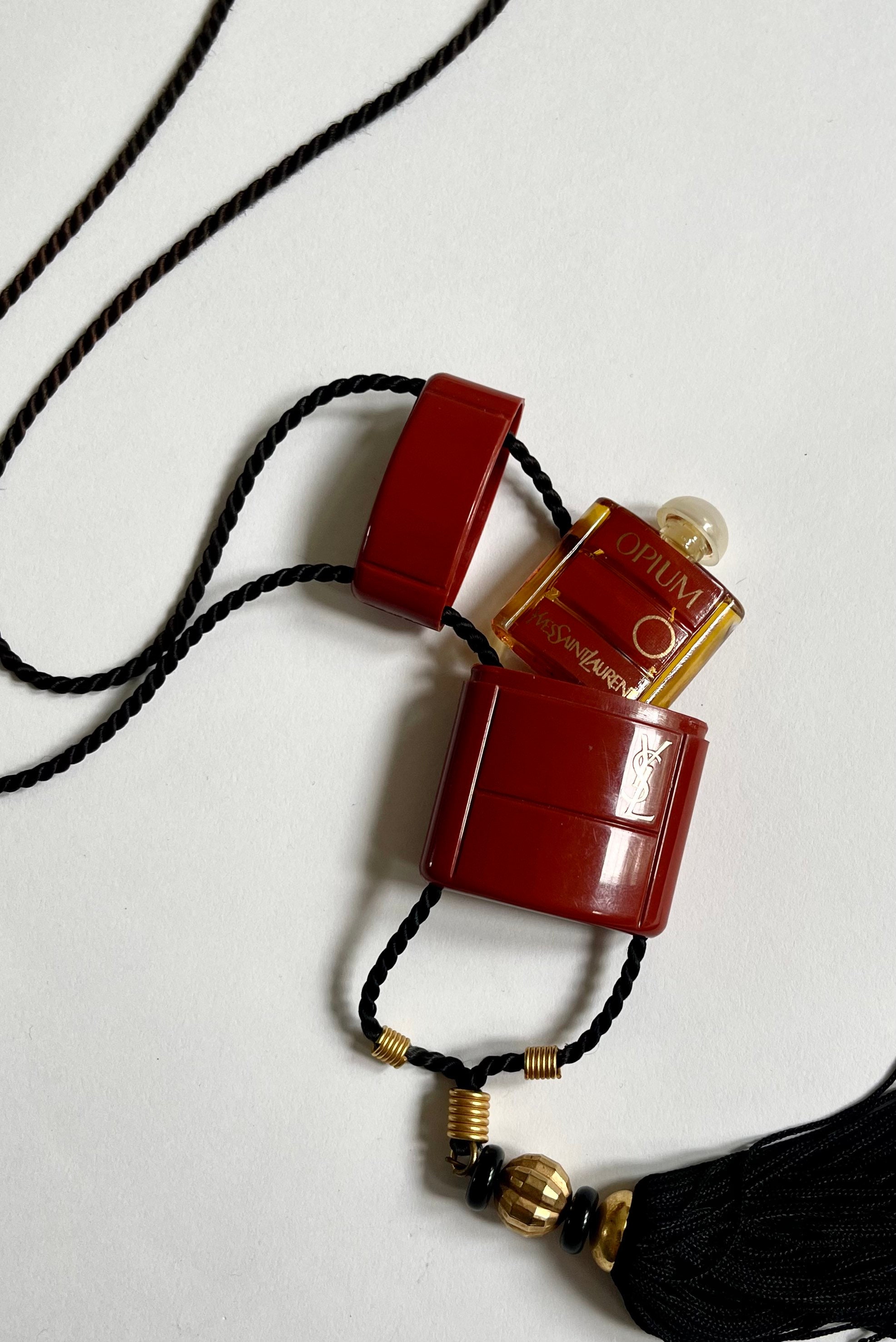 Rare vintage 80's YSL Opium perfume bottle housed in a logo embossed red plastic necklace