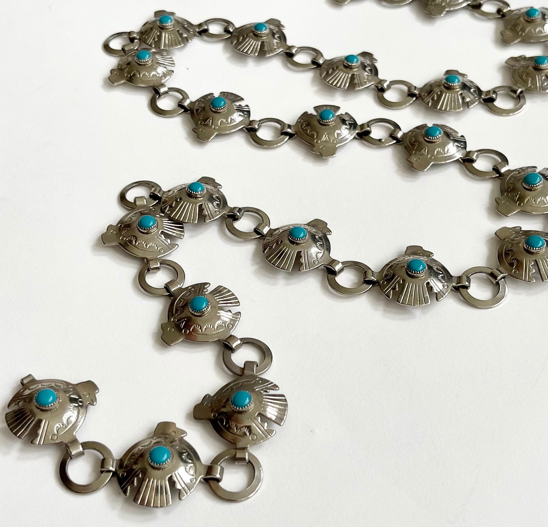 Vintage 80's Fred Harvey Era-style silver tone metal chain link thunderbird concho belt with faux turquoise detail on each thunderbird.