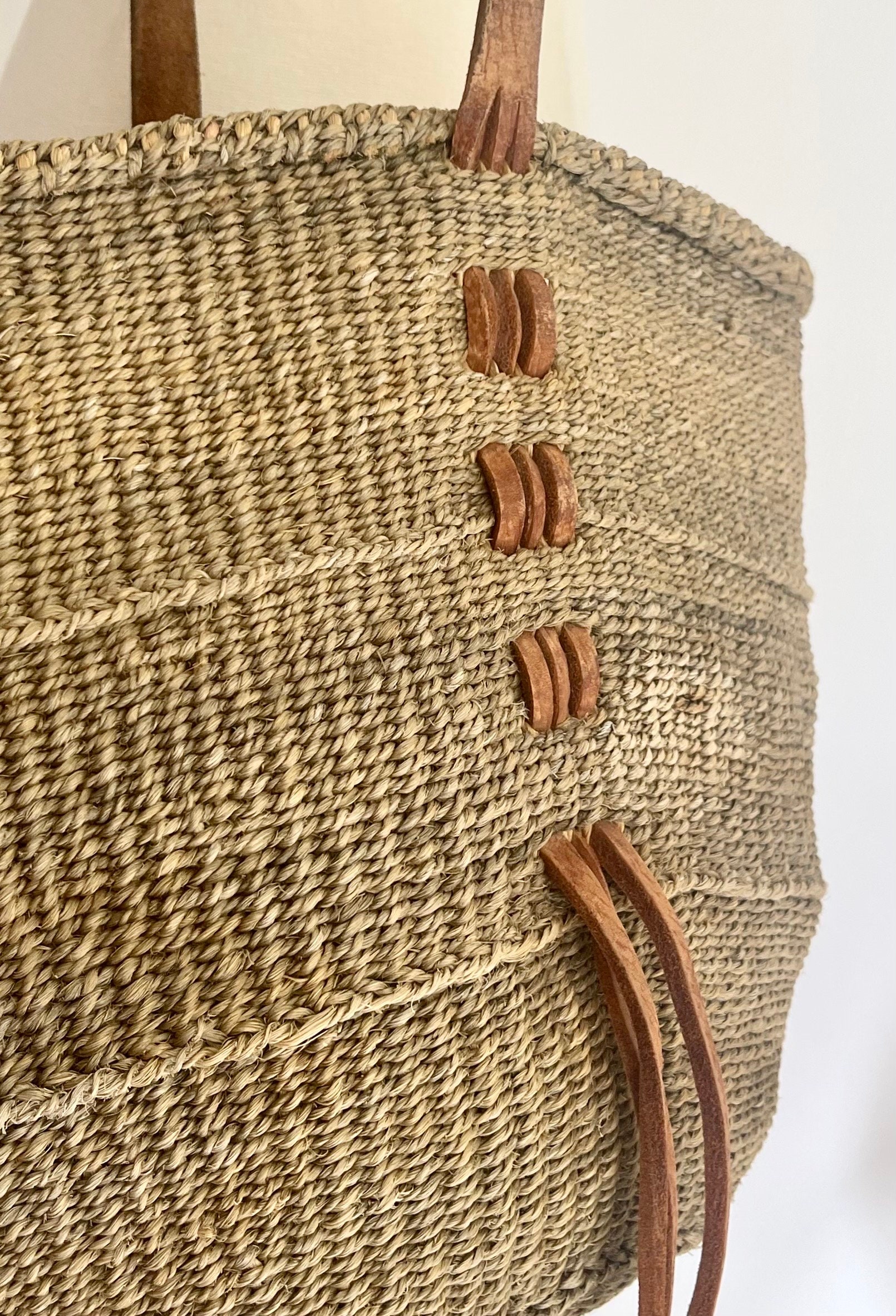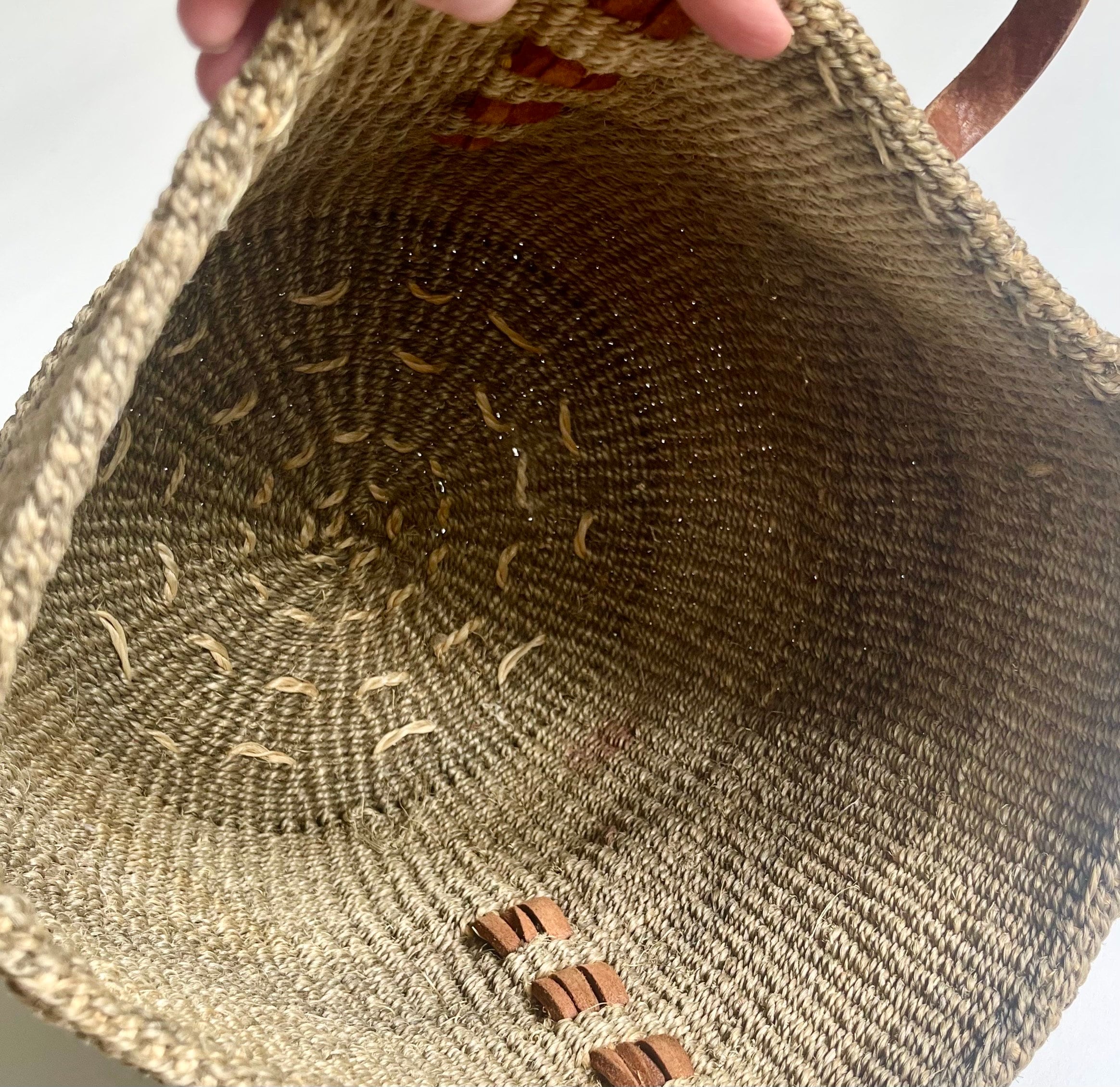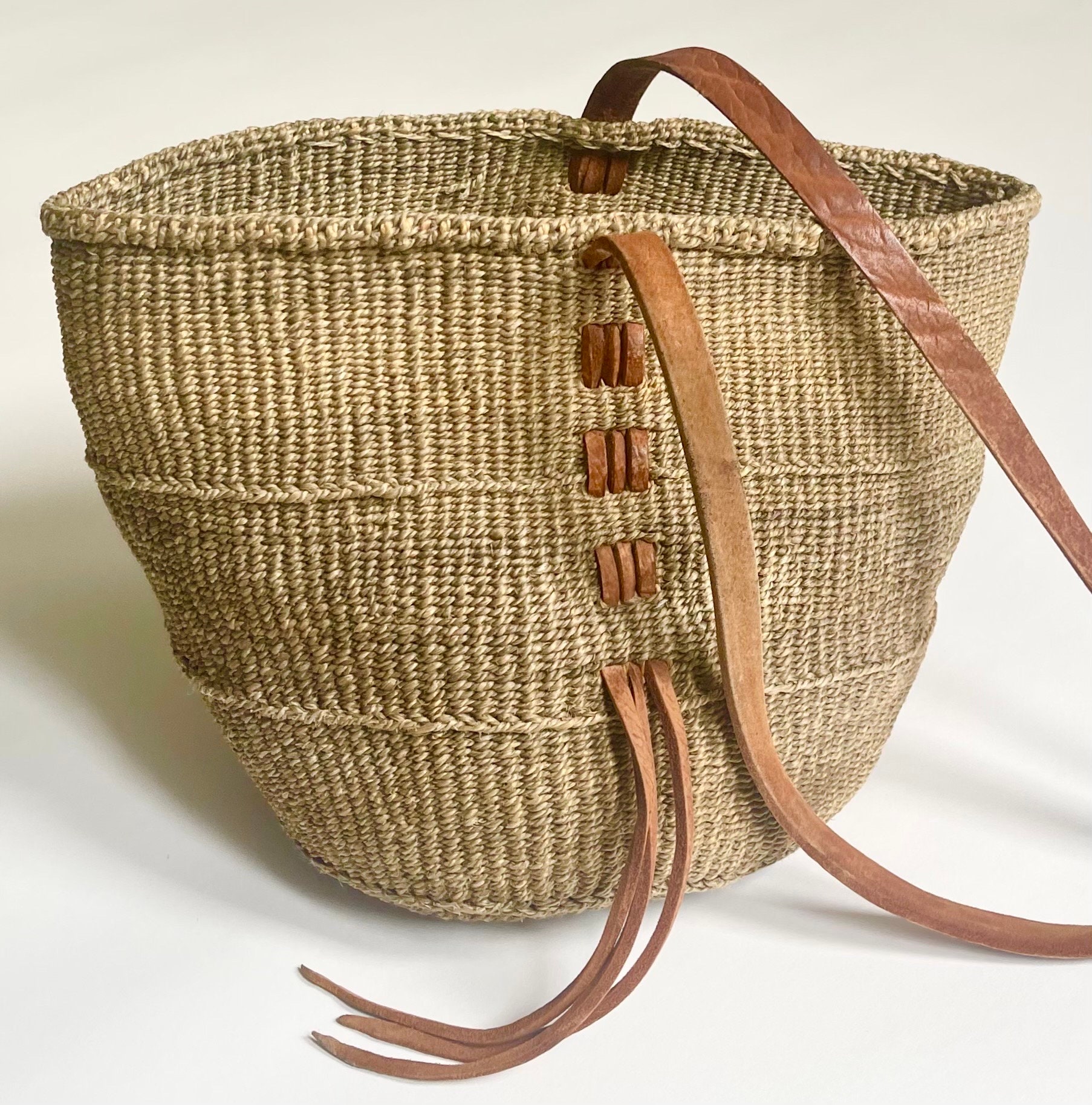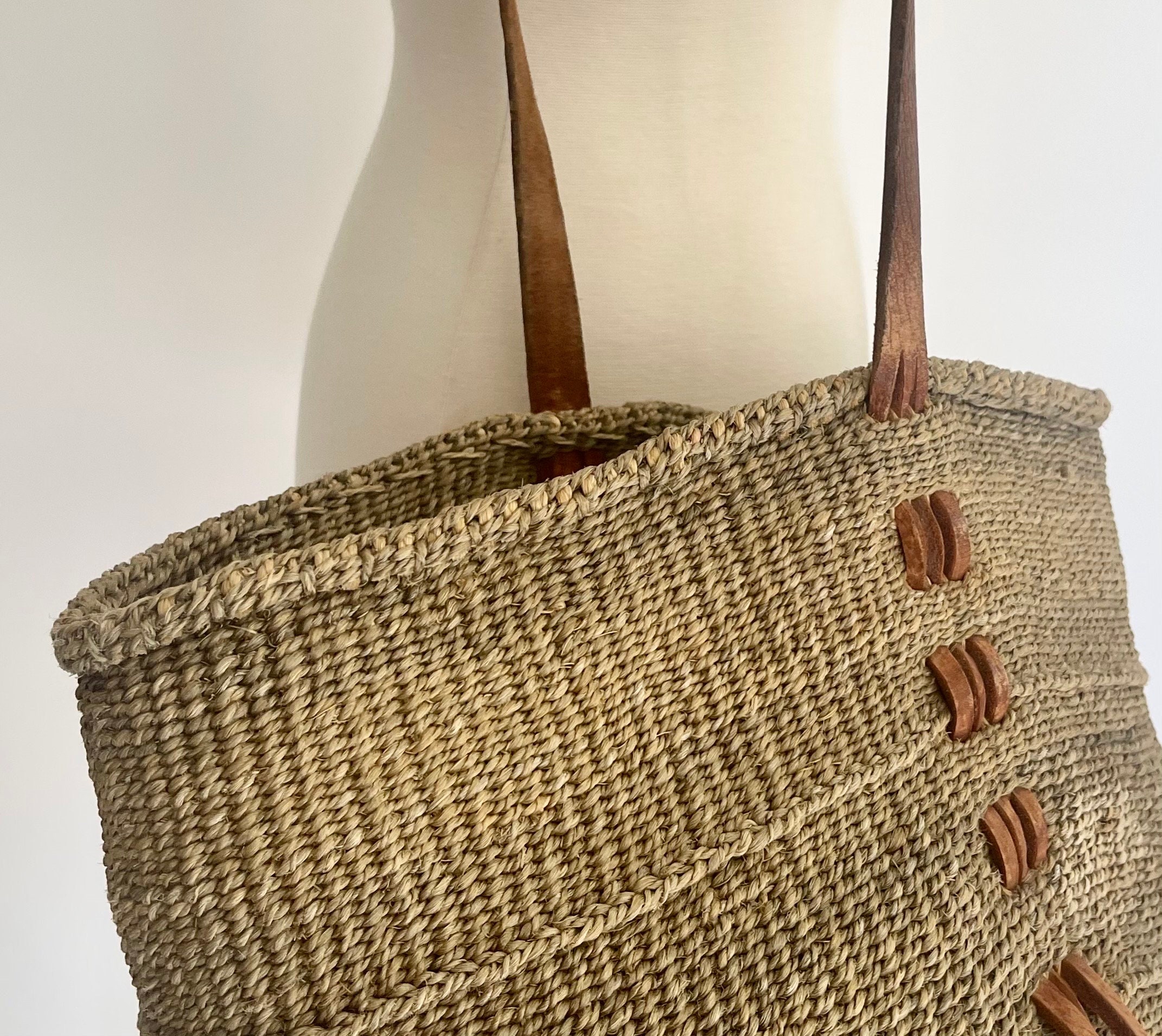 Vintage woven sisal market bag with leather strap and leather fringe detail on both sides