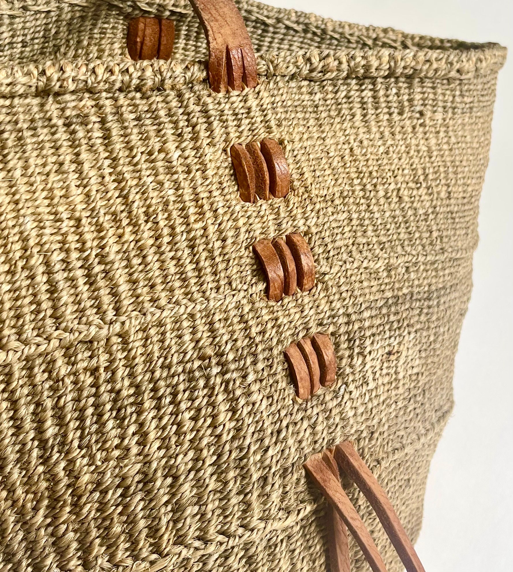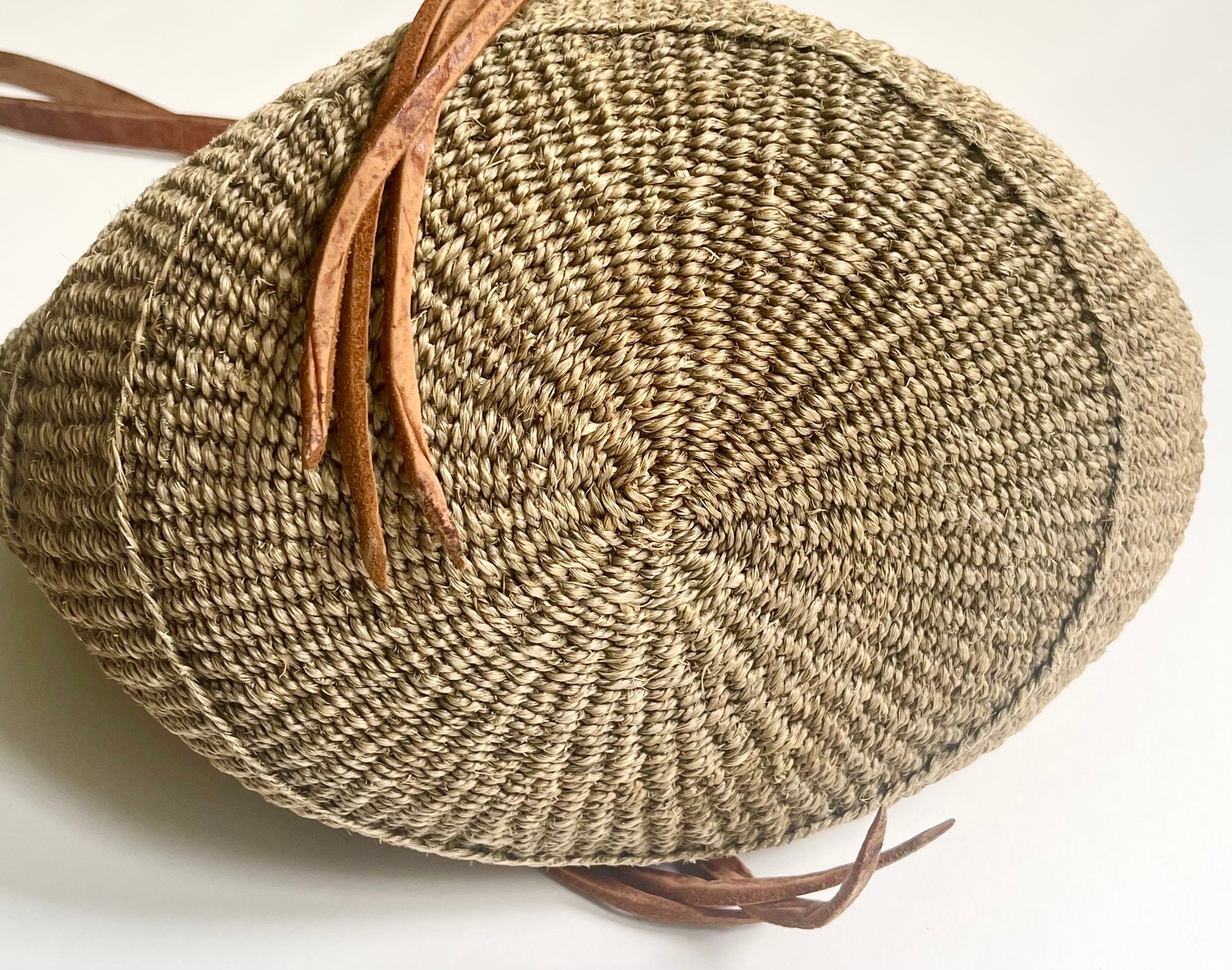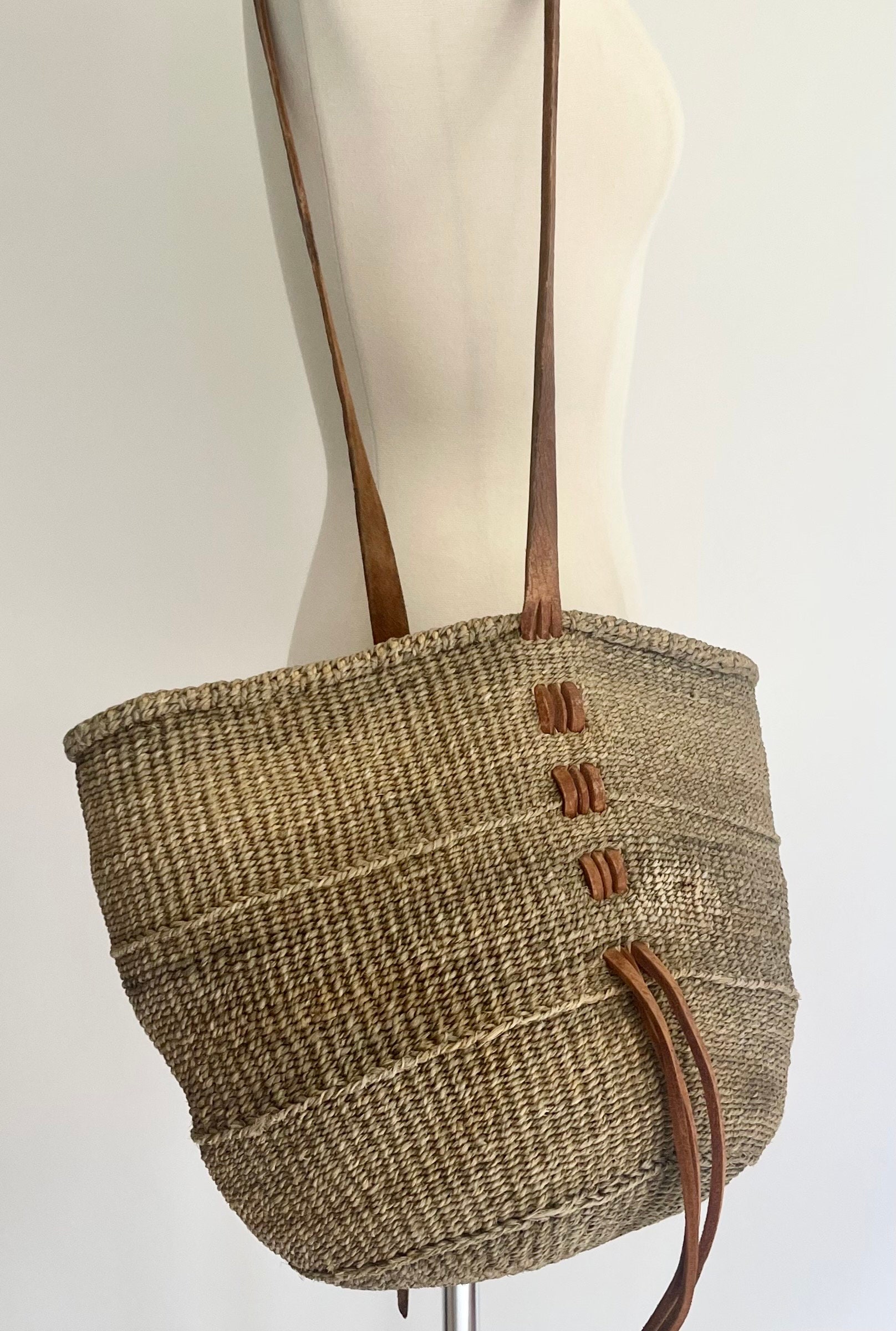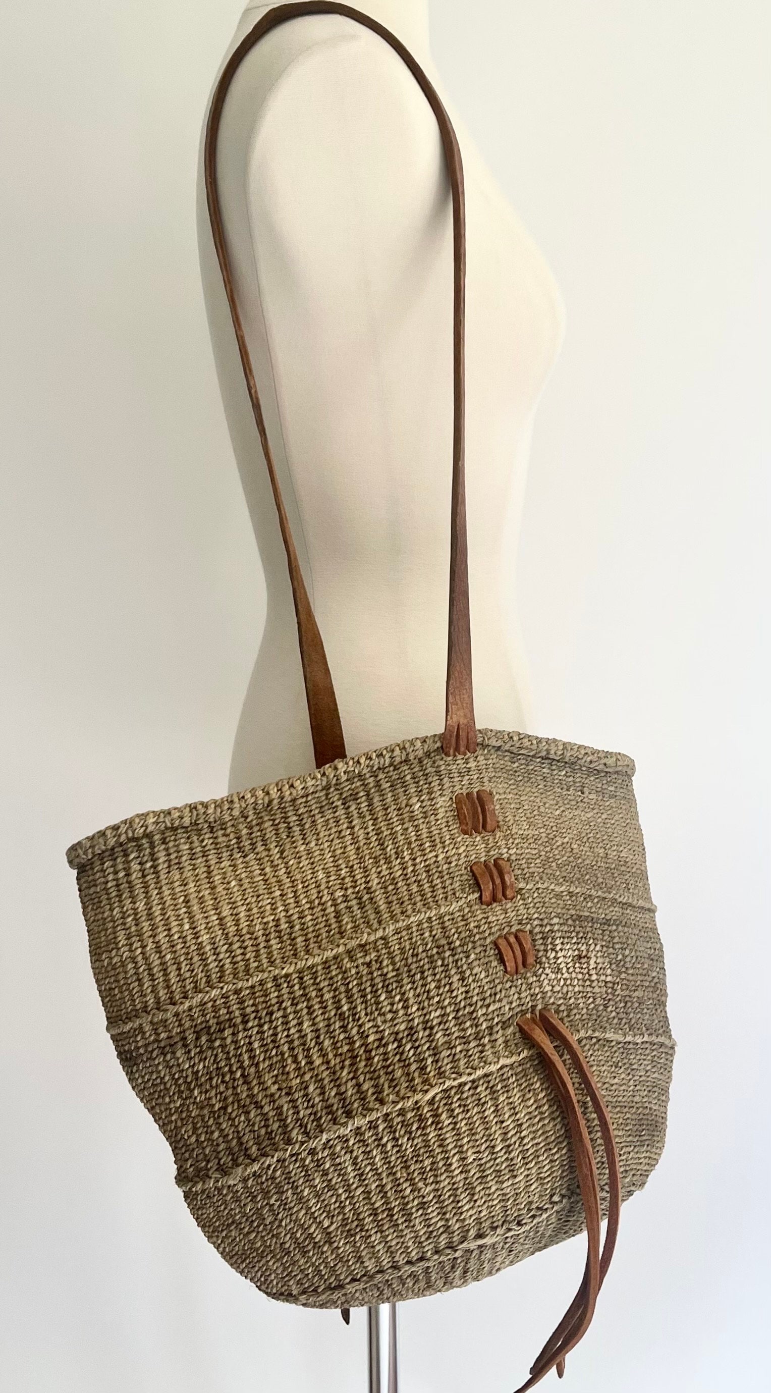 Vintage woven sisal market bag with leather strap and leather fringe detail on both sides