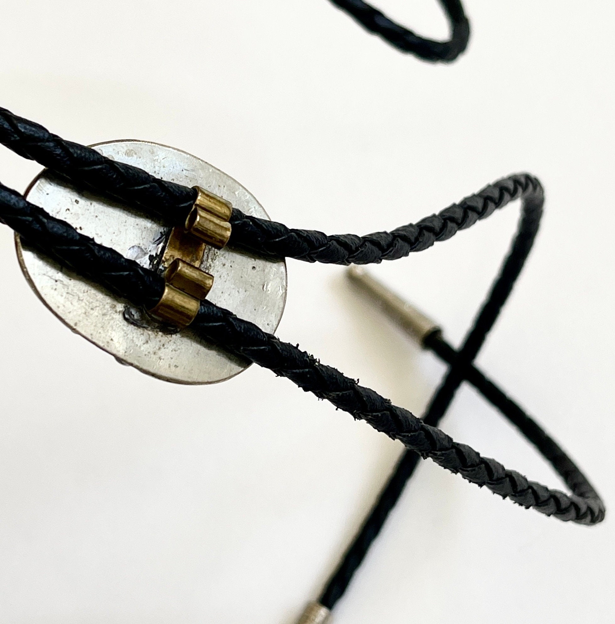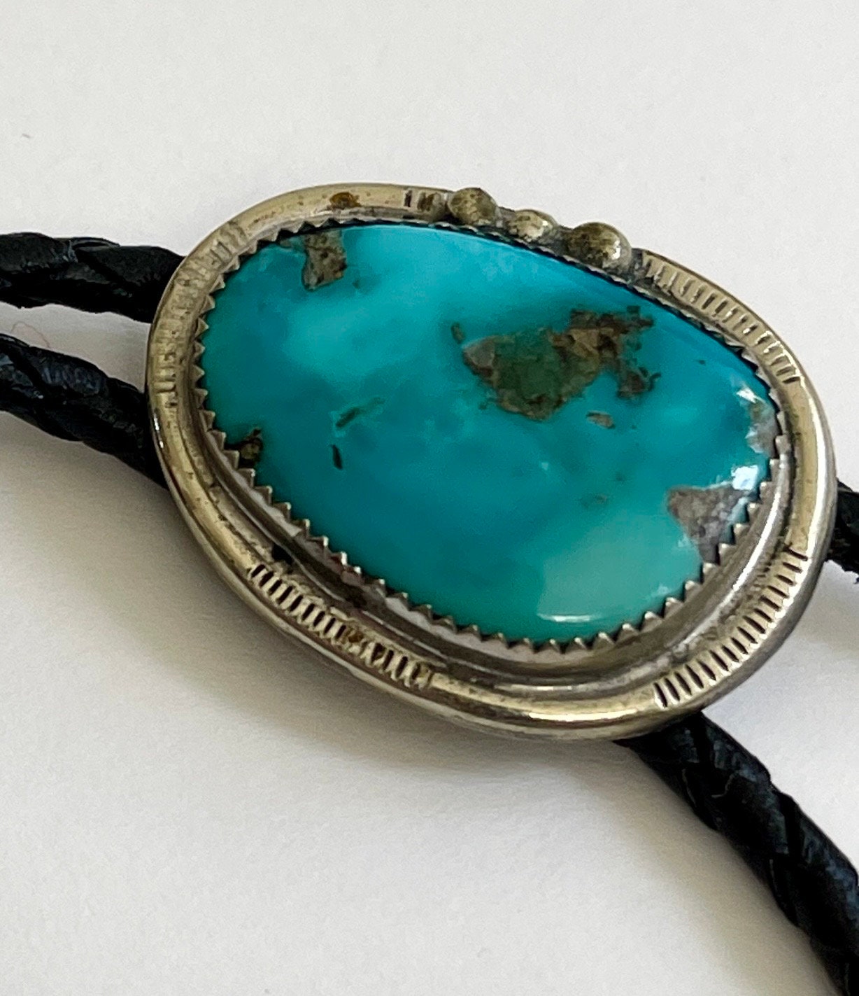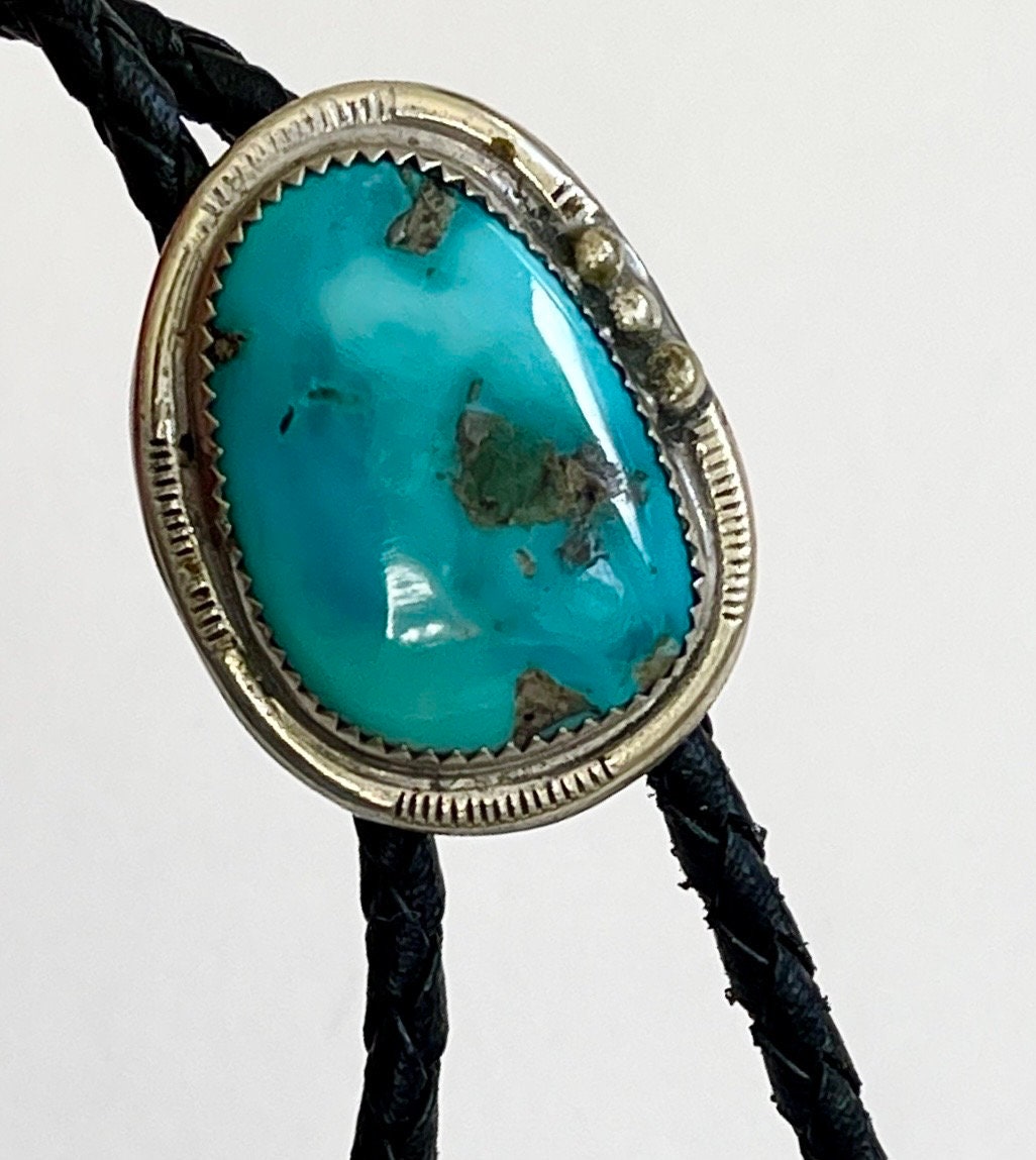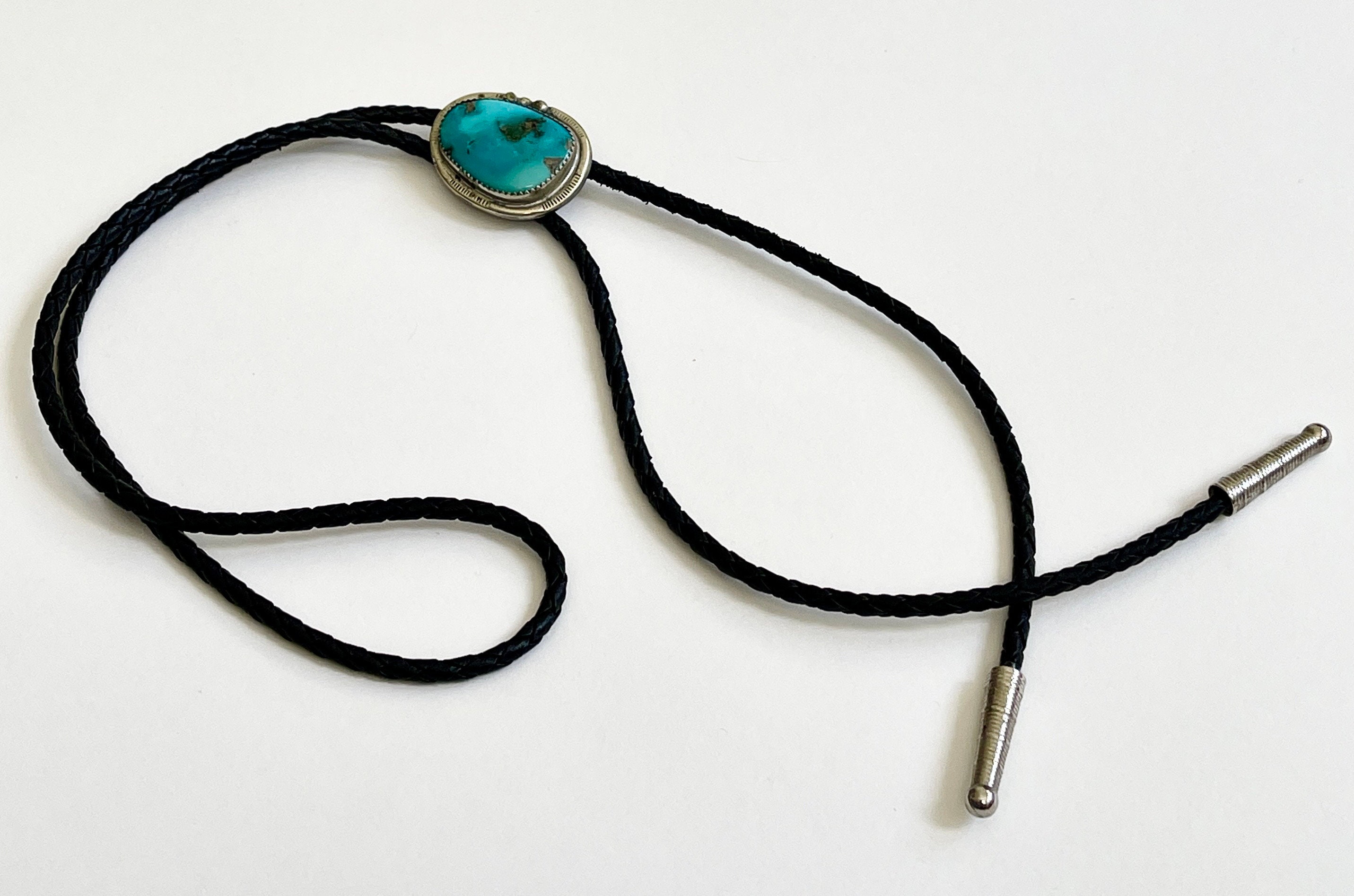 Vintage Navajo handmade turquoise bolo tie with braided black leather straps