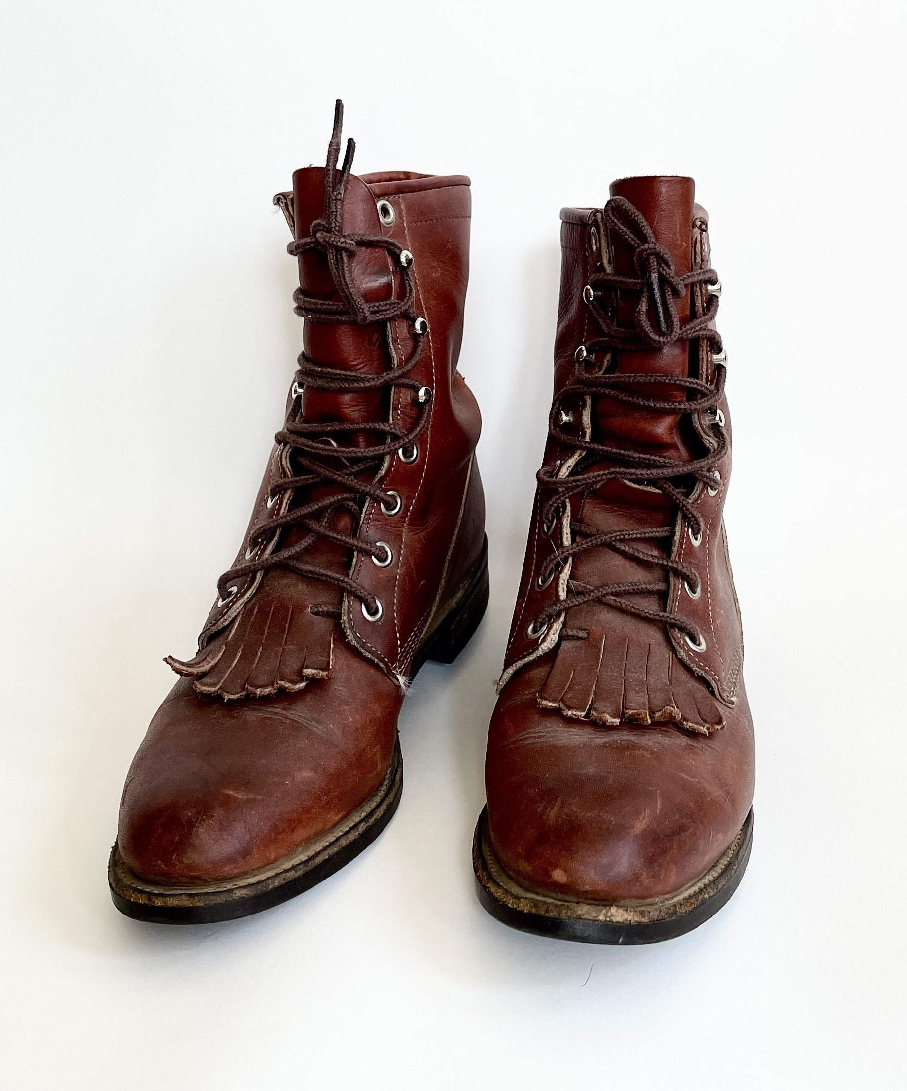 Super stylish vintage Justin lace up riding boots with fringe detail