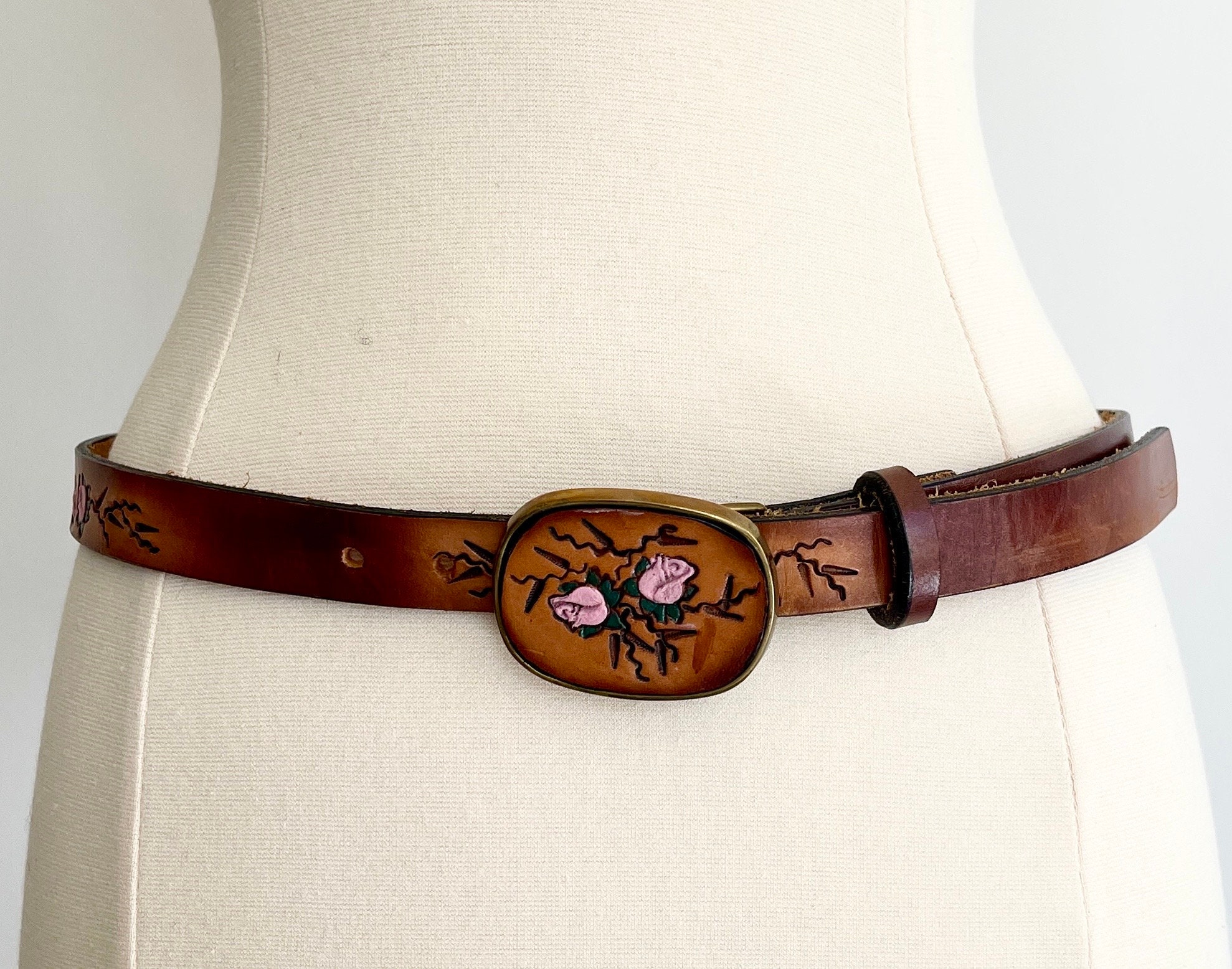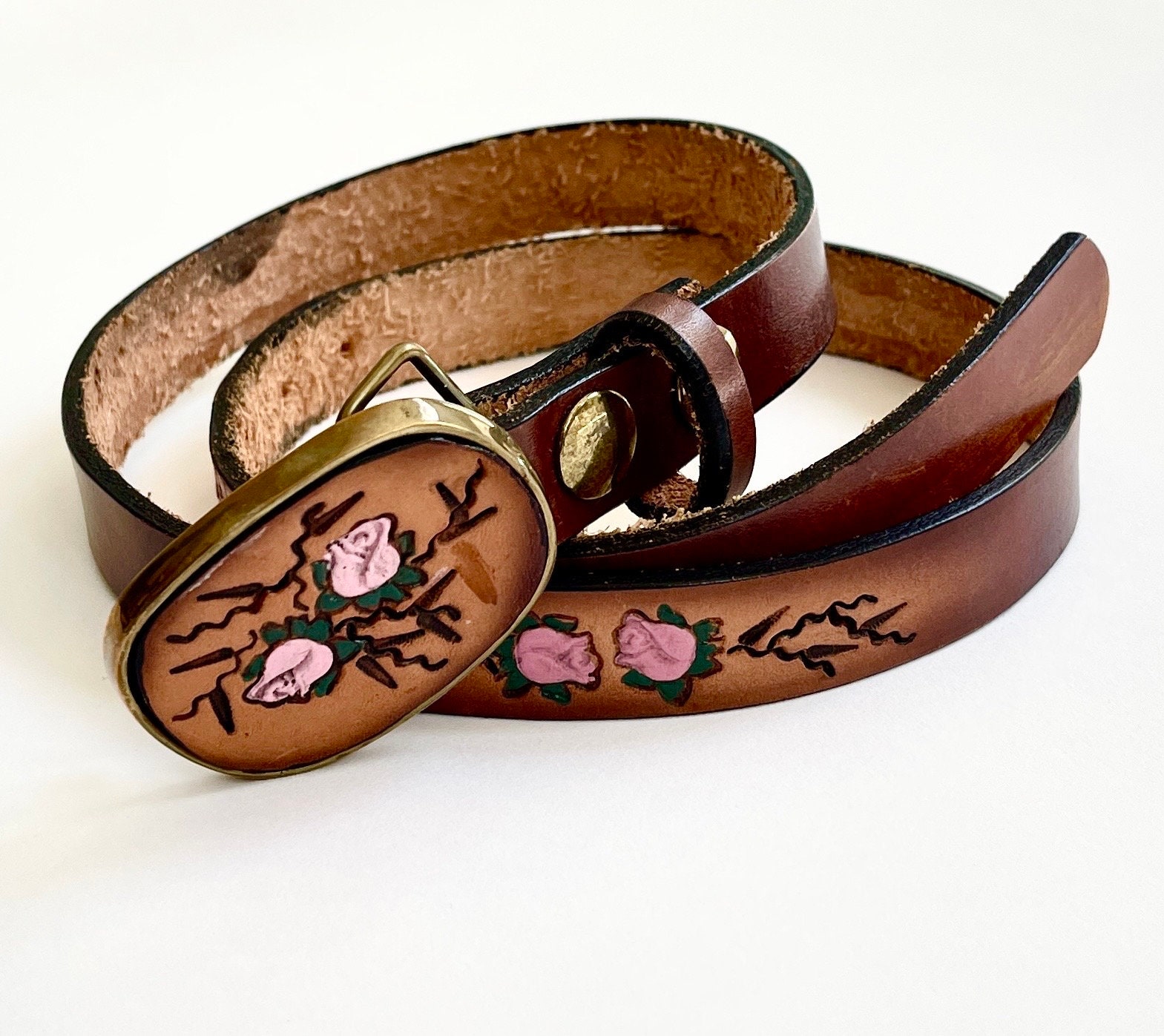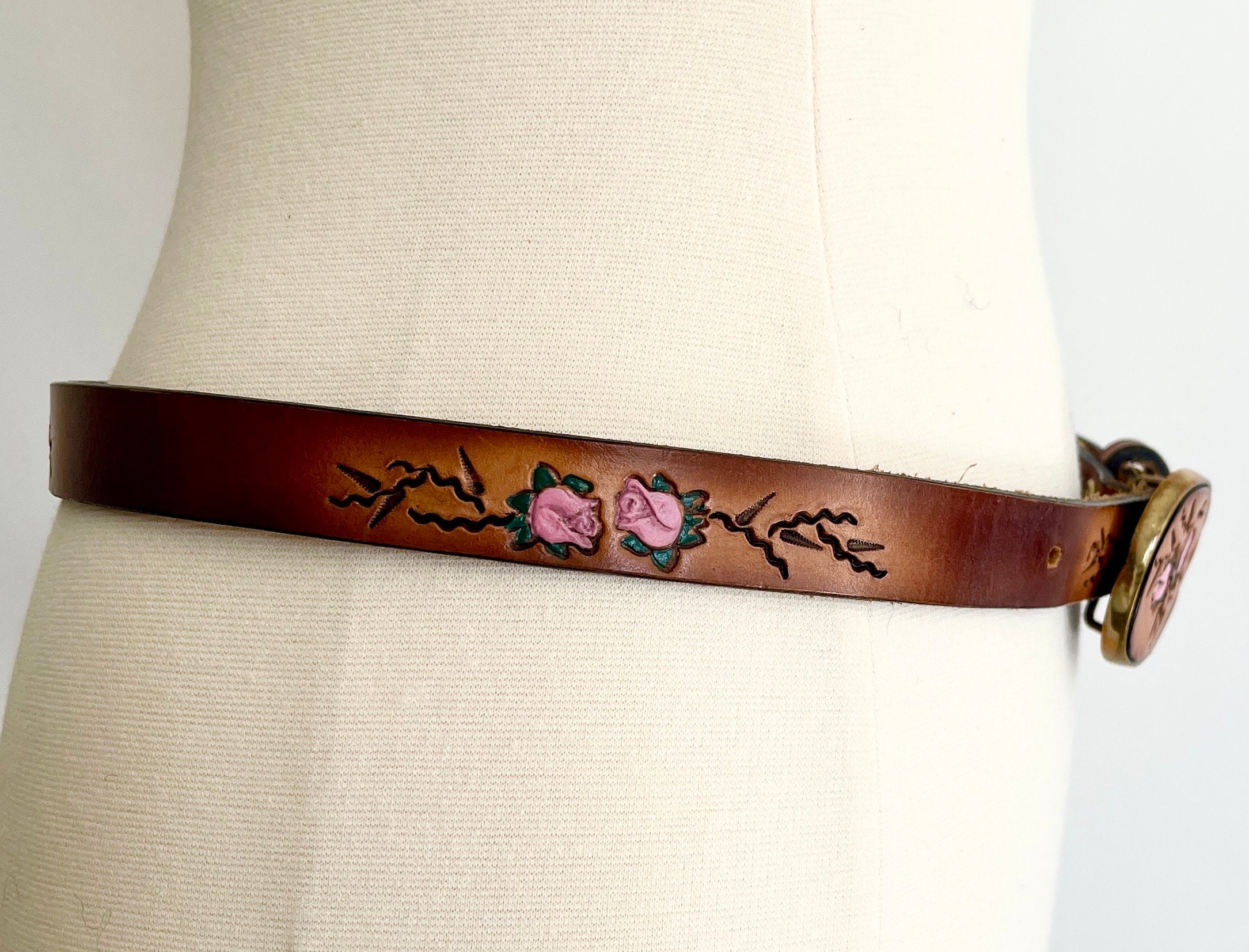 Adorable vintage rose tooled leather belt with matching buckle