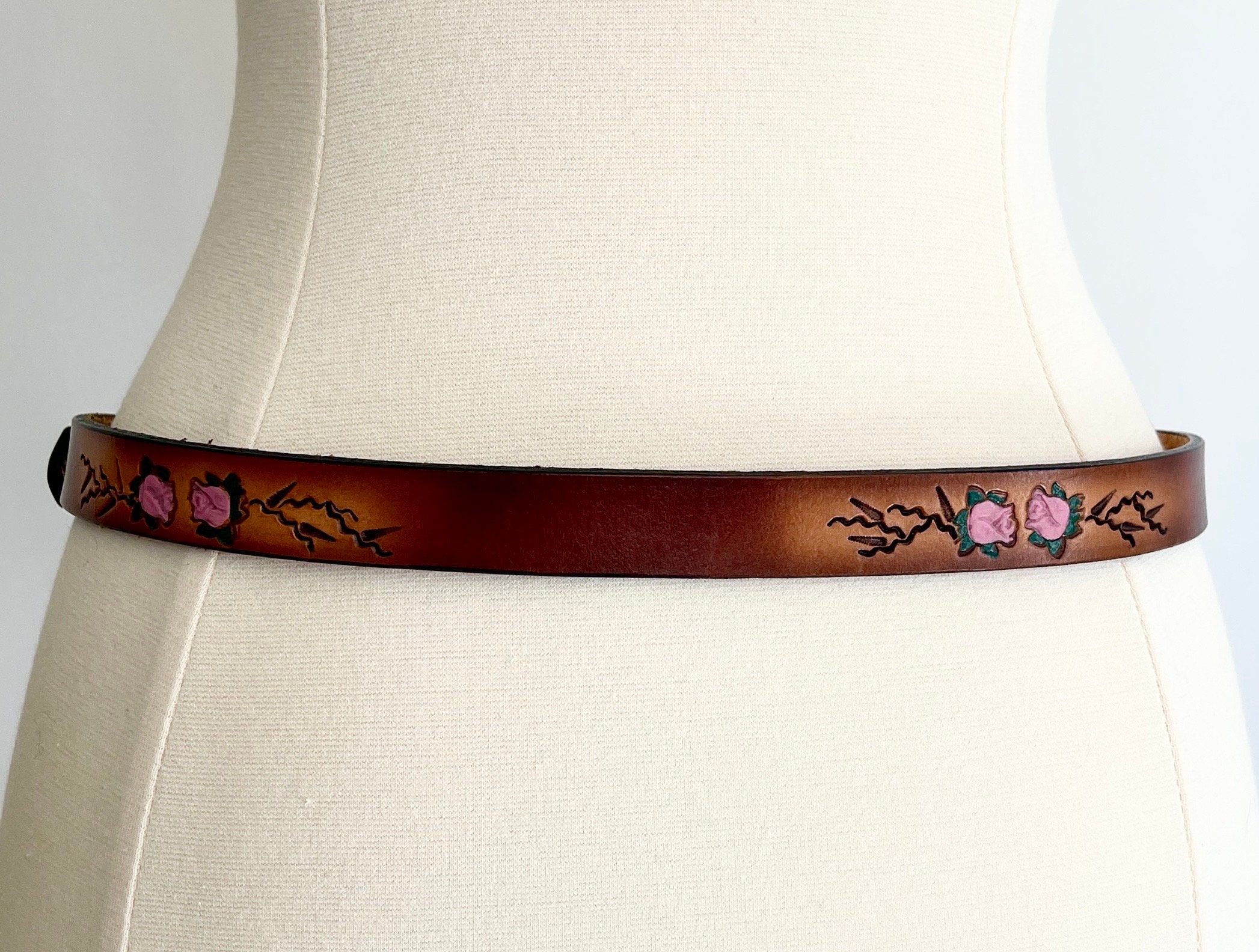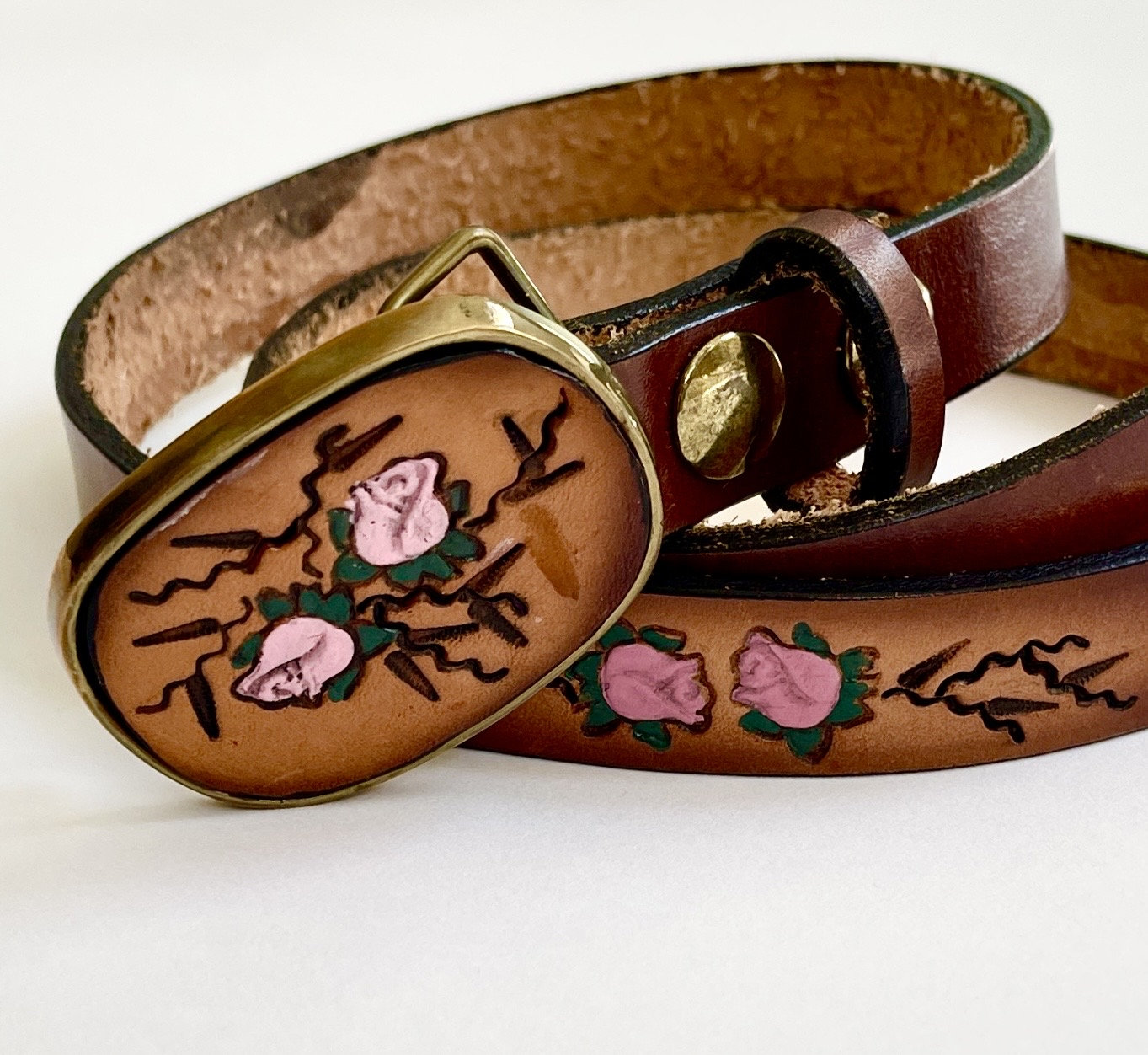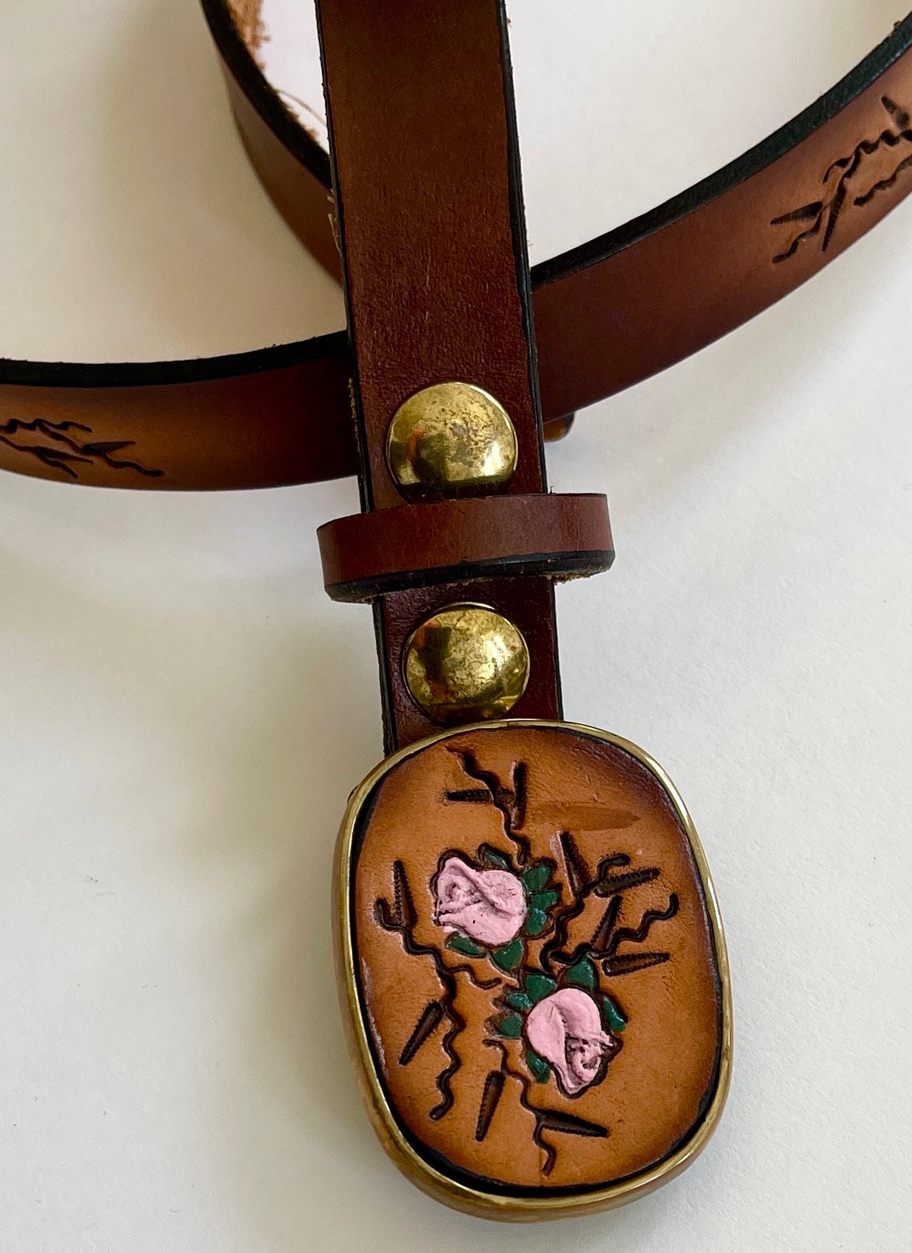 Adorable vintage rose tooled leather belt with matching buckle