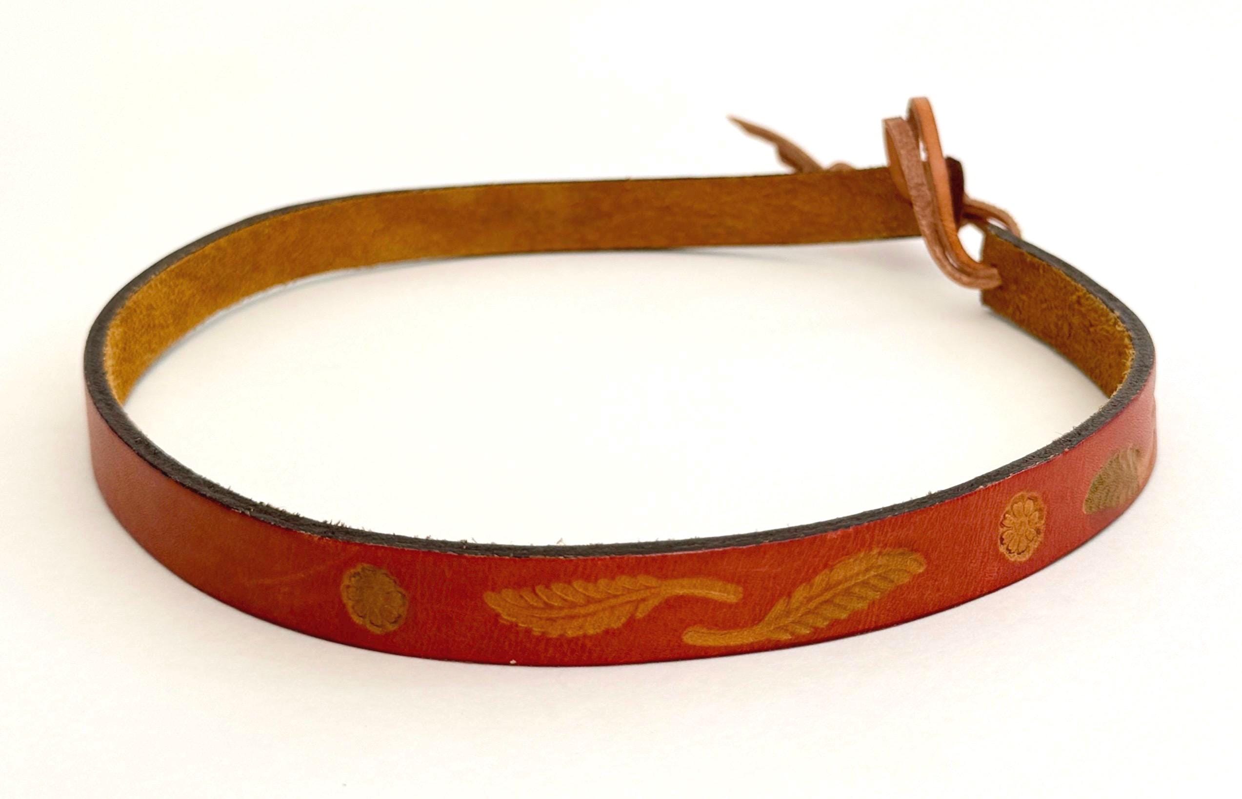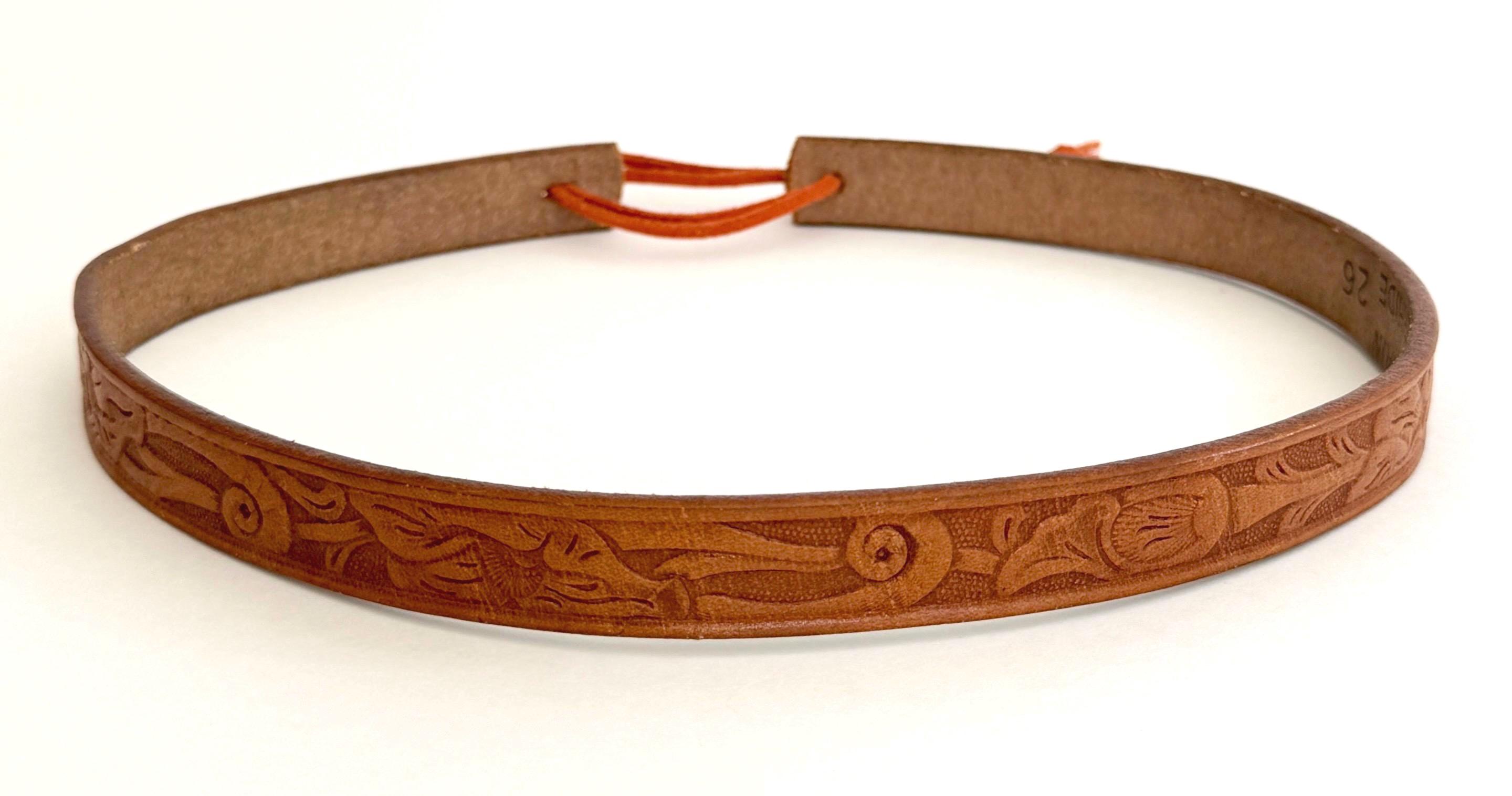 STYLE #5: Tan botanical tooled top grain steerhide band with burnt orange leather adjuster. Width: 11/16"