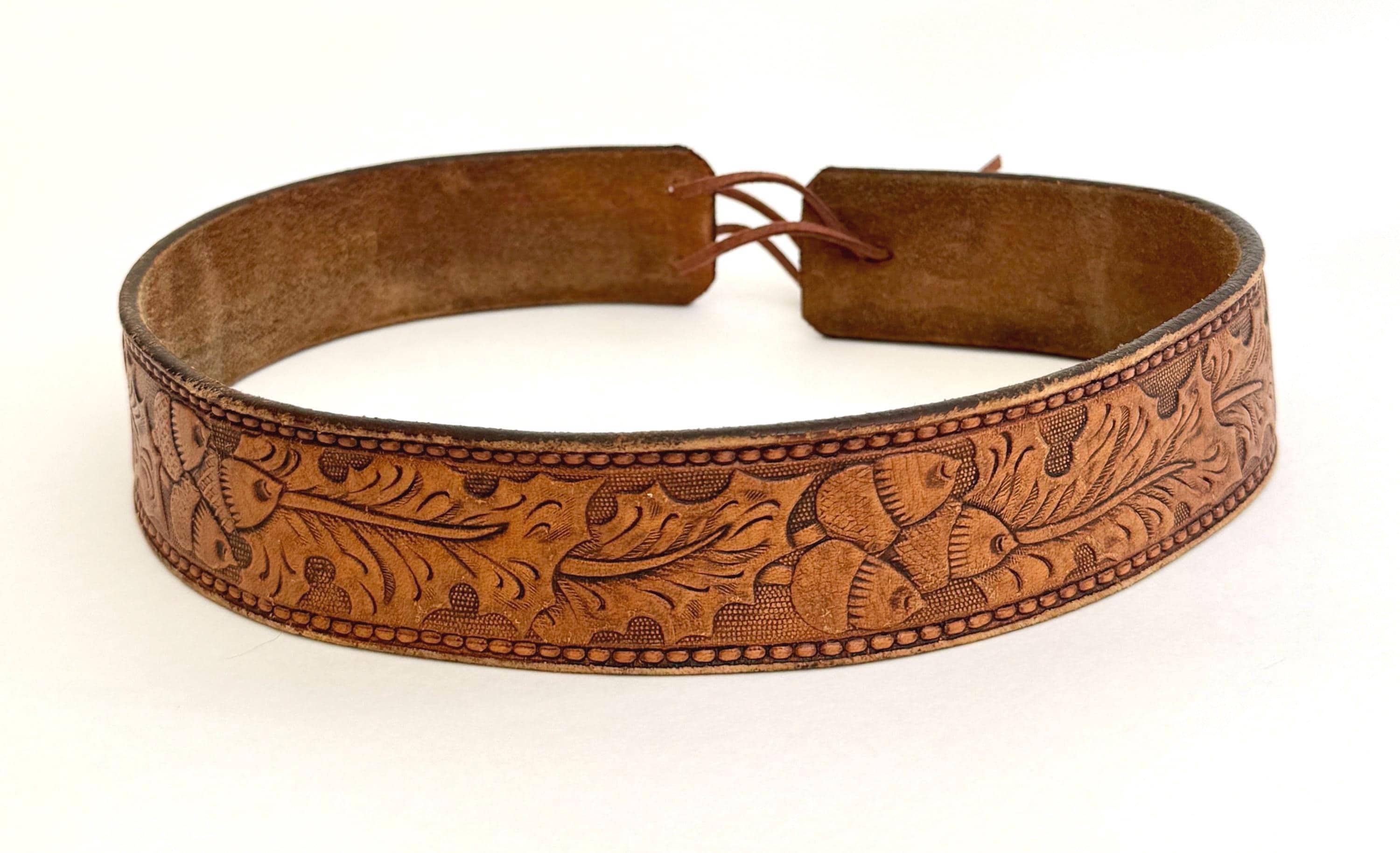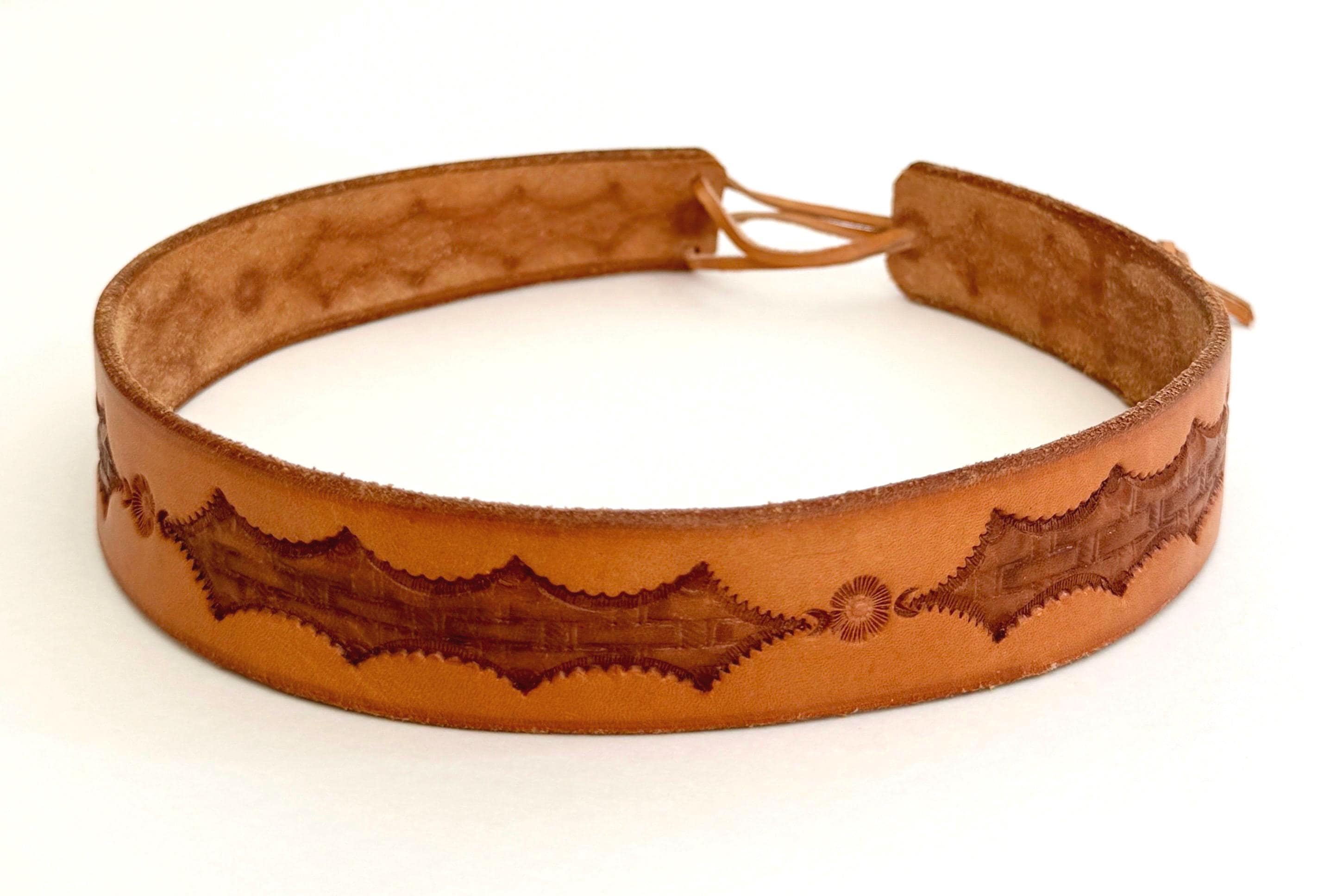 STYLE #4: Brown leaf & acorn tooled leather band with brown leather adjuster. Width: 1-1/2"
