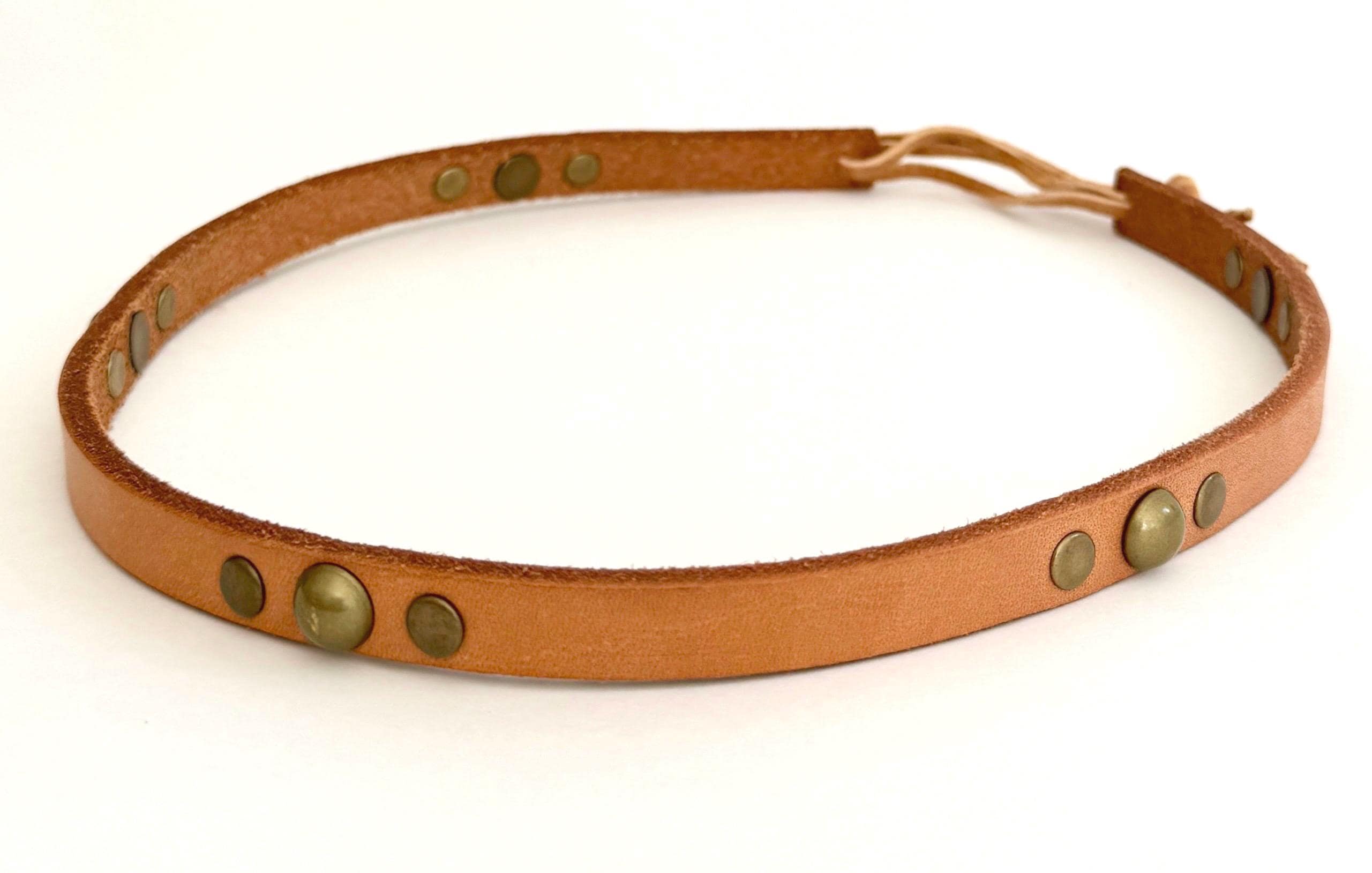 STYLE #3: Tan leather band with brass studs and tan leather adjuster. Width: 1/2"