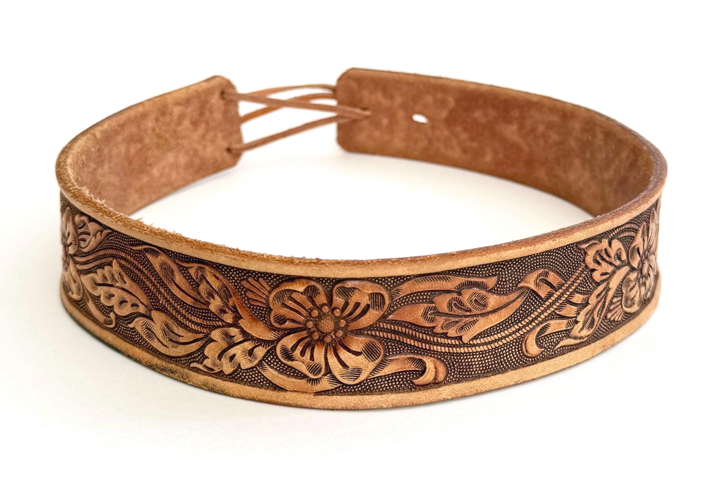 STYLE #1: Two tone brown leather band with stamped leaf & flower accents and tan leather adjuster. Width: 5/8"