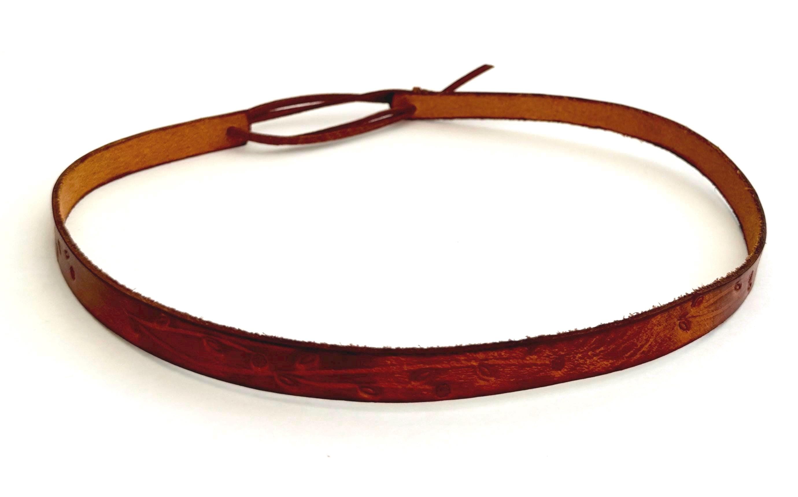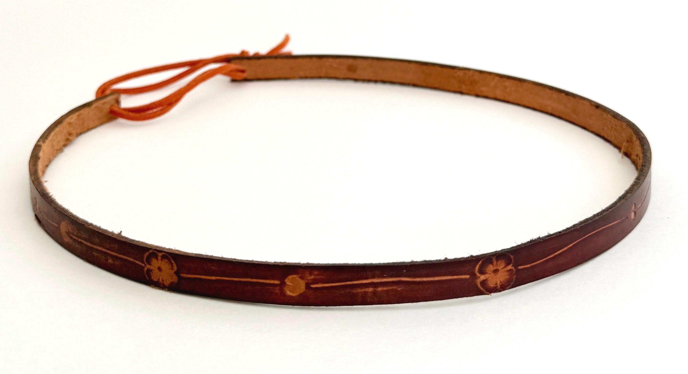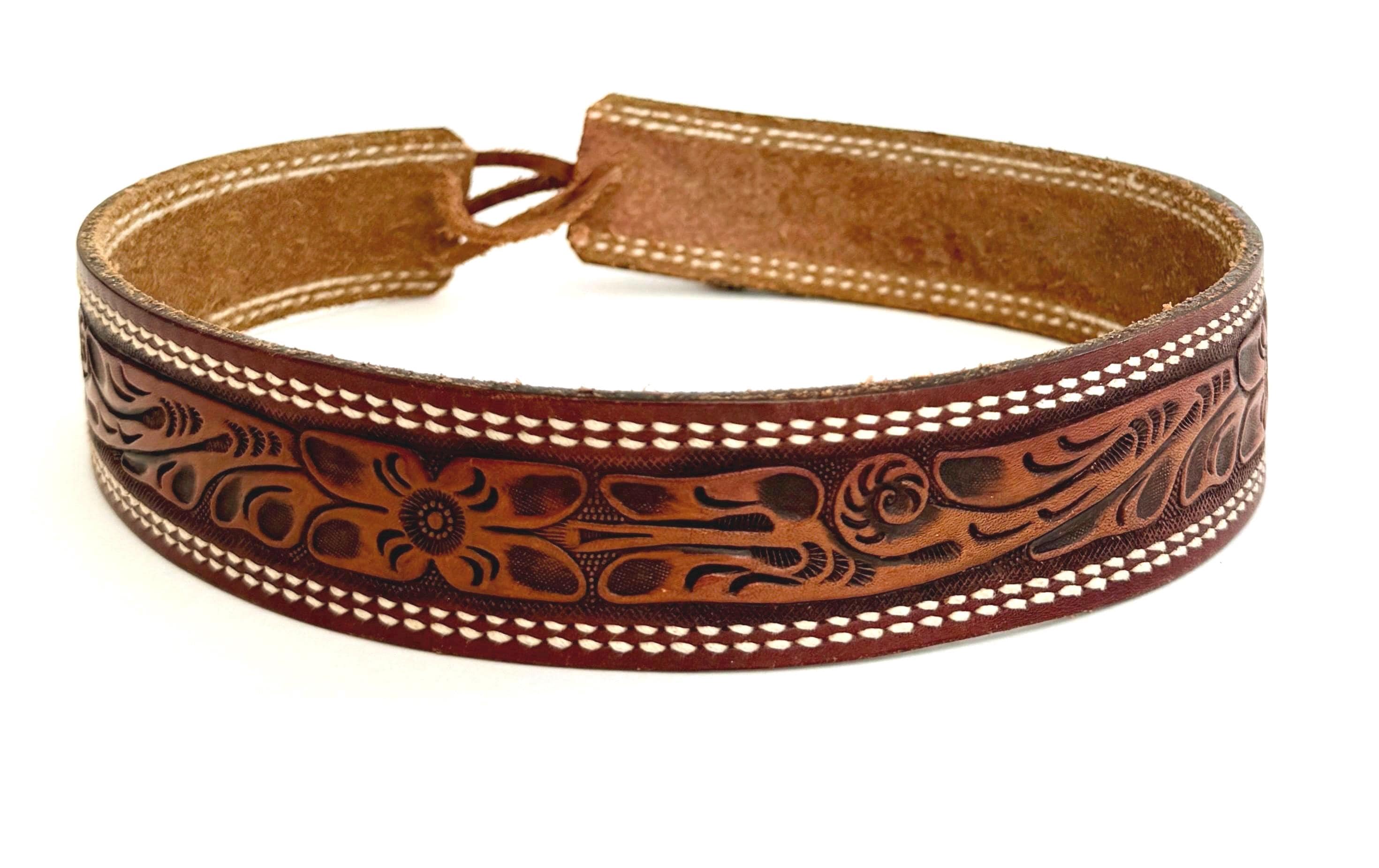 STYLE #6: Thin floral tooled leather band with brown leather adjuster. Width: 1/2"