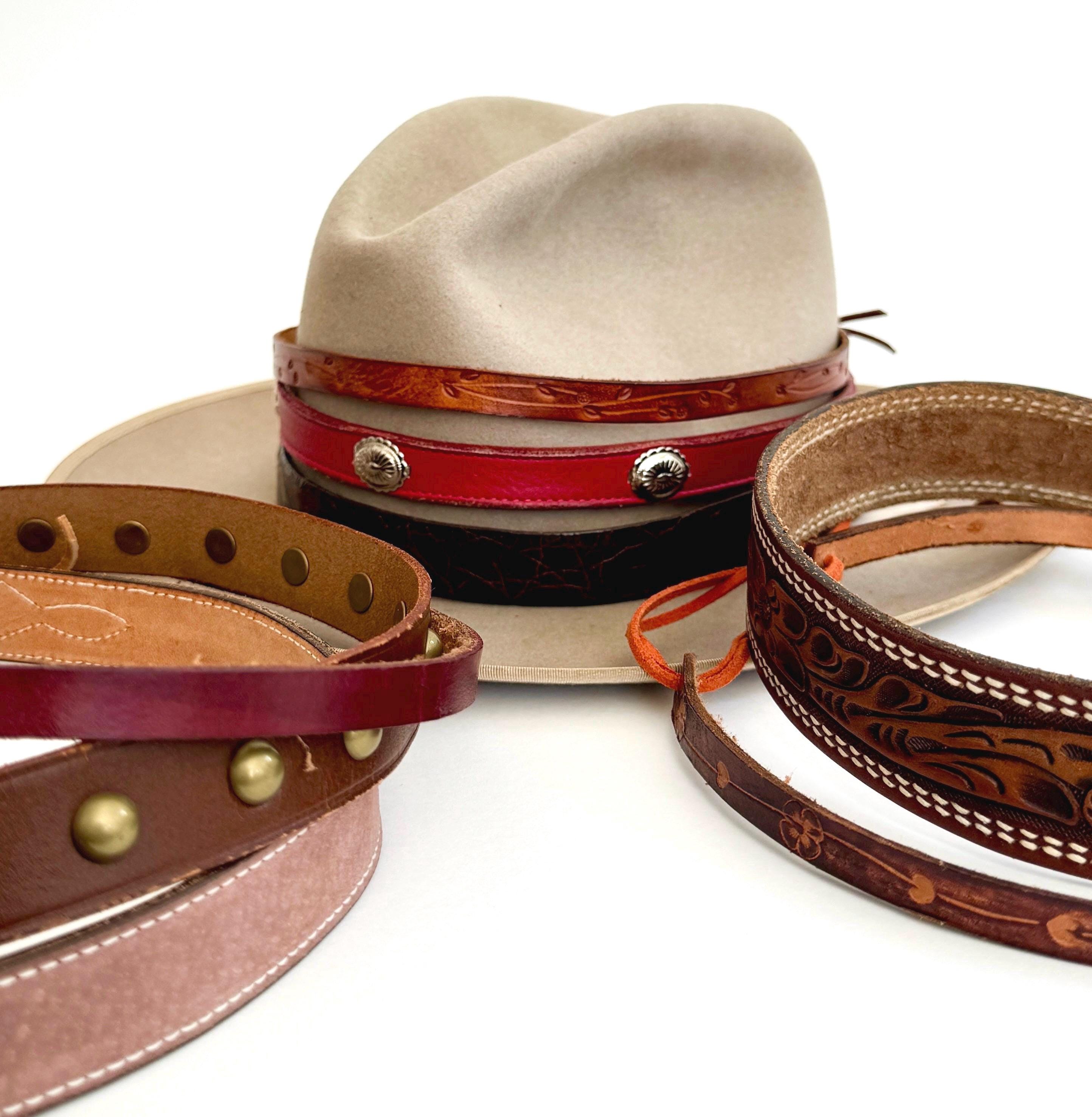 We partnered with our favorite local leather artisan to bring you an exclusive line of one-of-a-kind handmade Western hat bands repurposed from soft & worn vintage leather belts