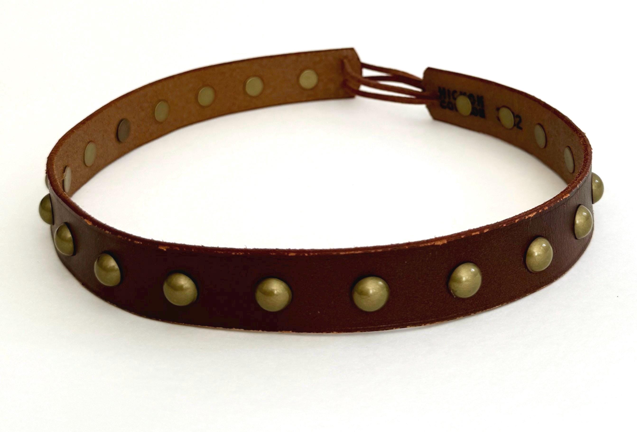STYLE #7: Dark brown leather band with brass studs and dark brown leather adjuster. Width: 1"