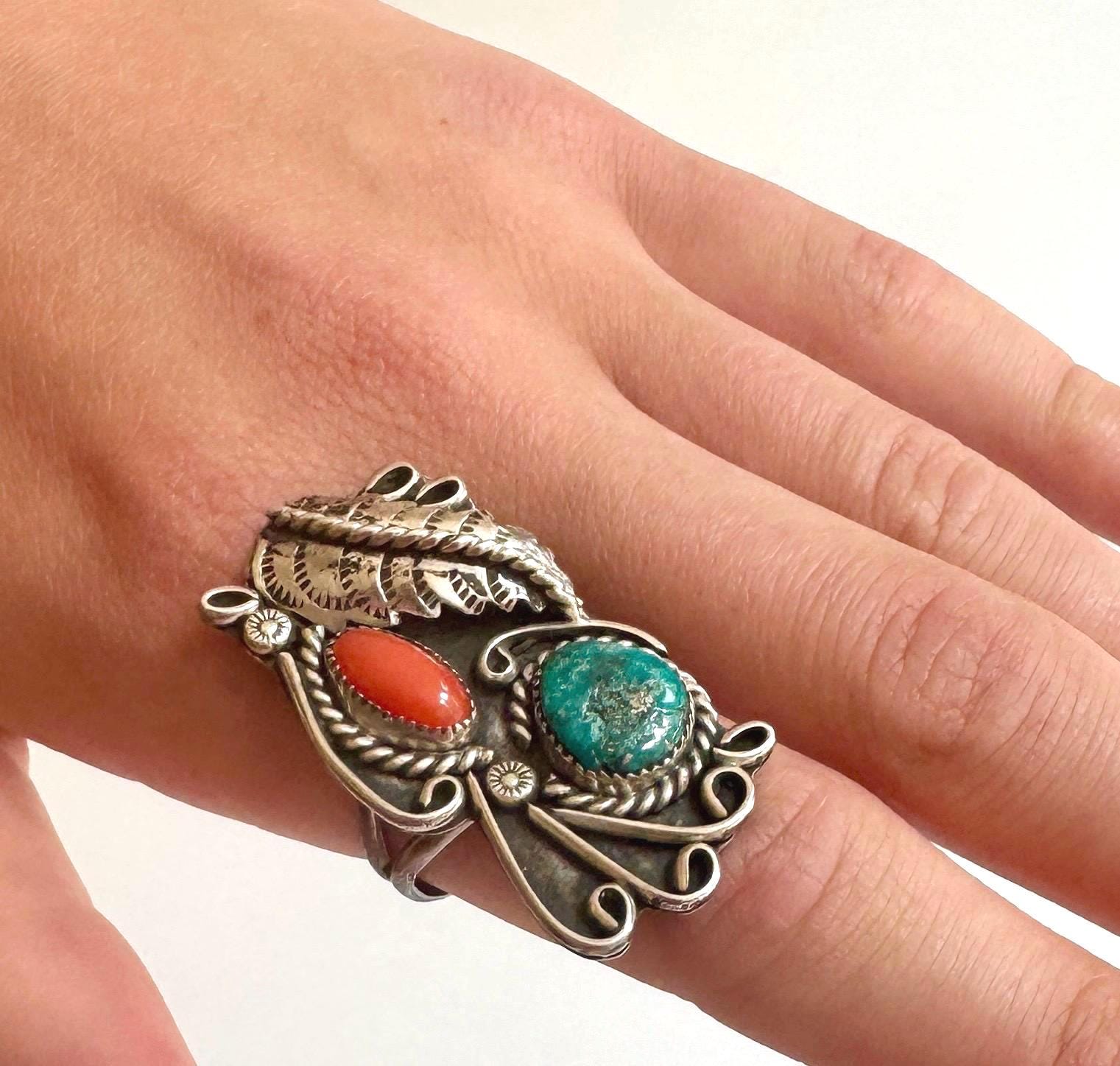 Vintage 60's/70's Native American Navajo sterling silver, turquoise and red coral ring