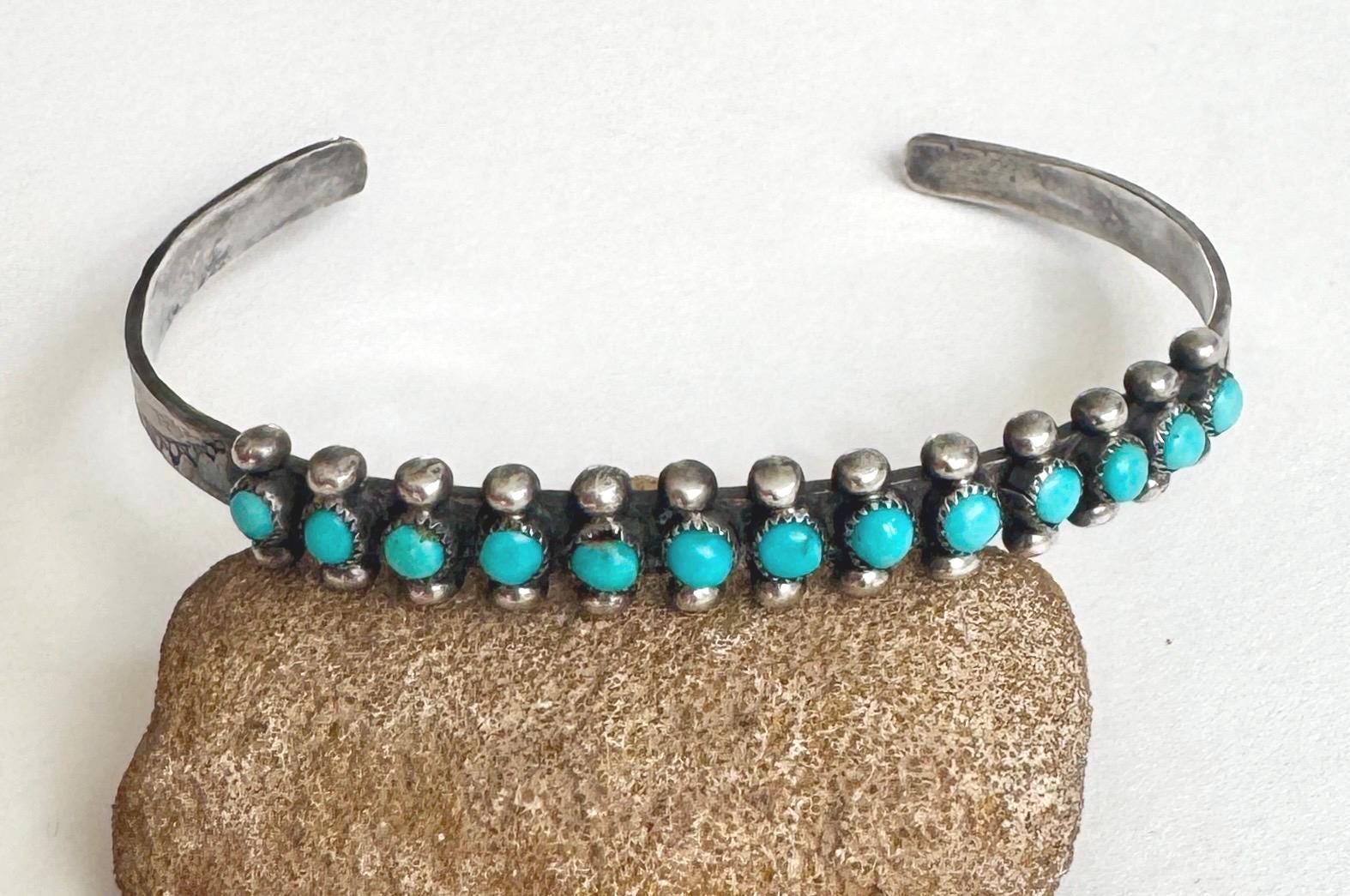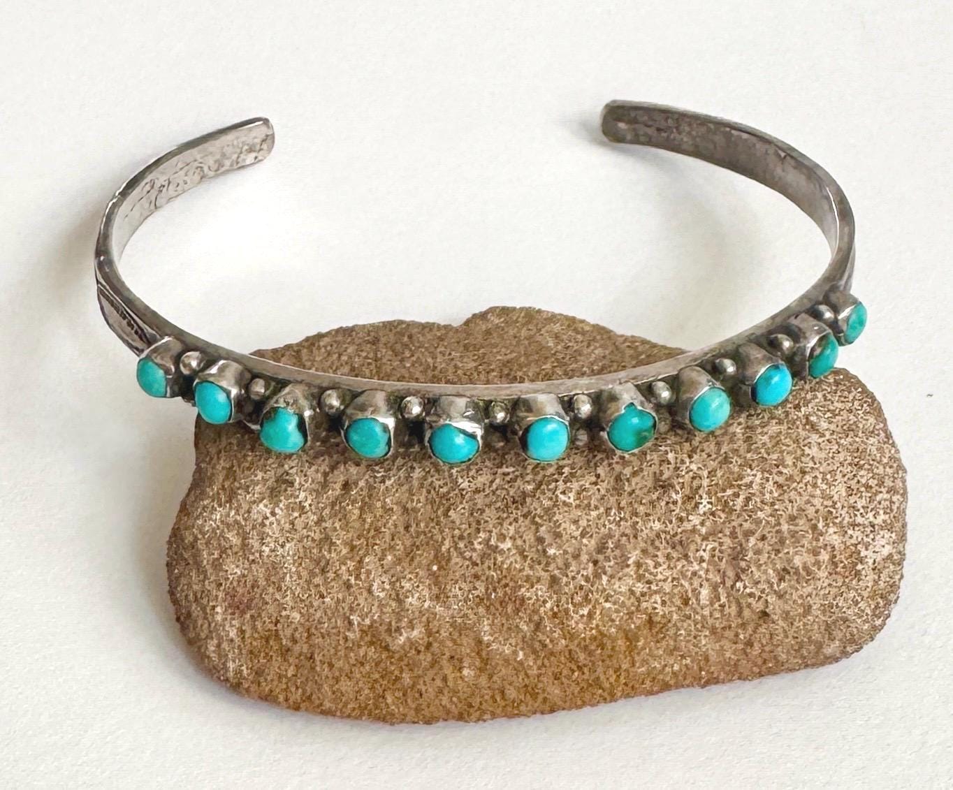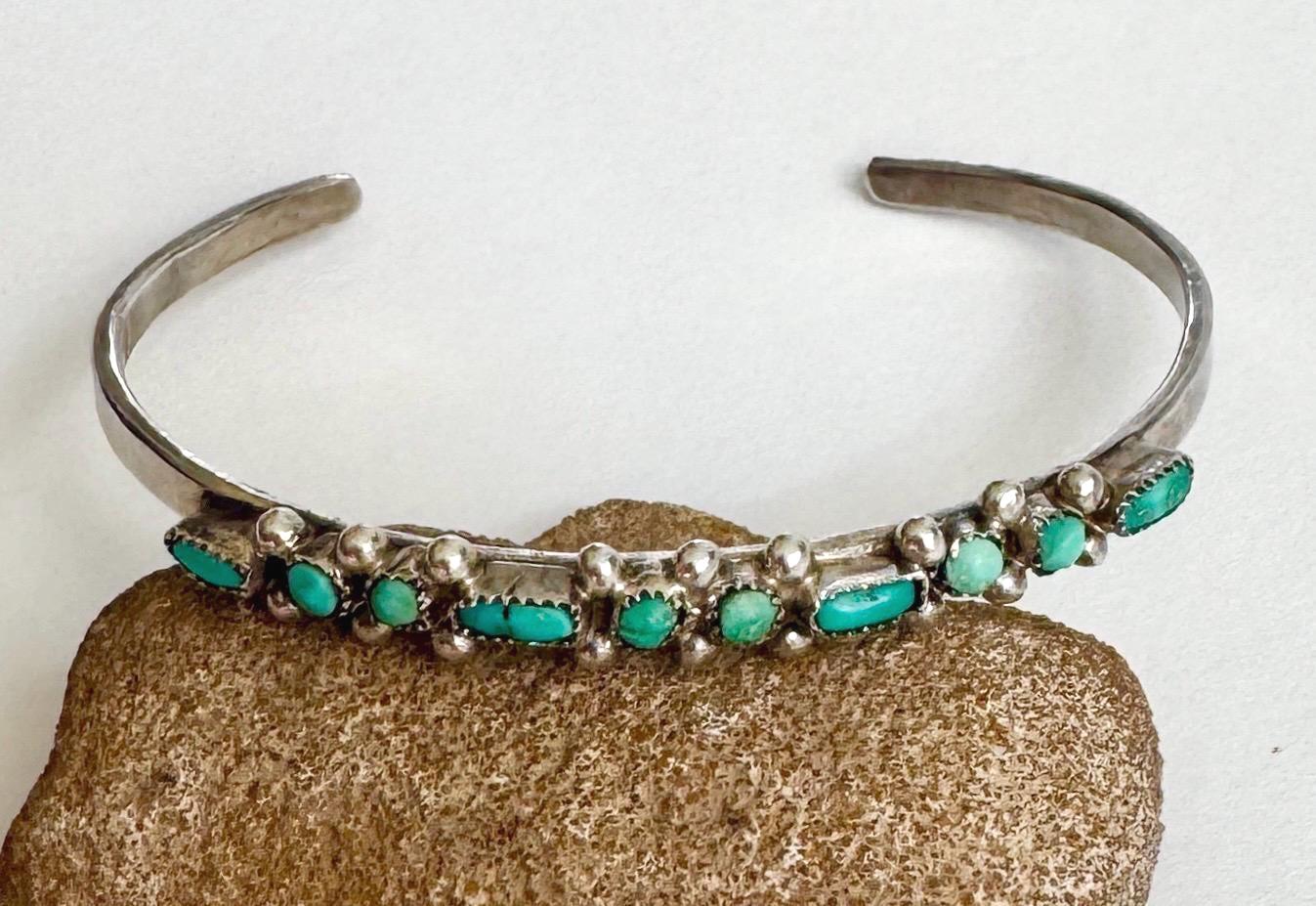 Delicate vintage old pawn Native American Zuni cuff bracelets with snake eye set natural turquoise stones