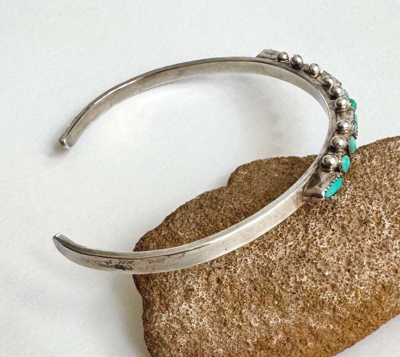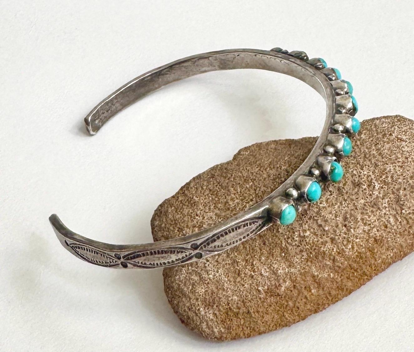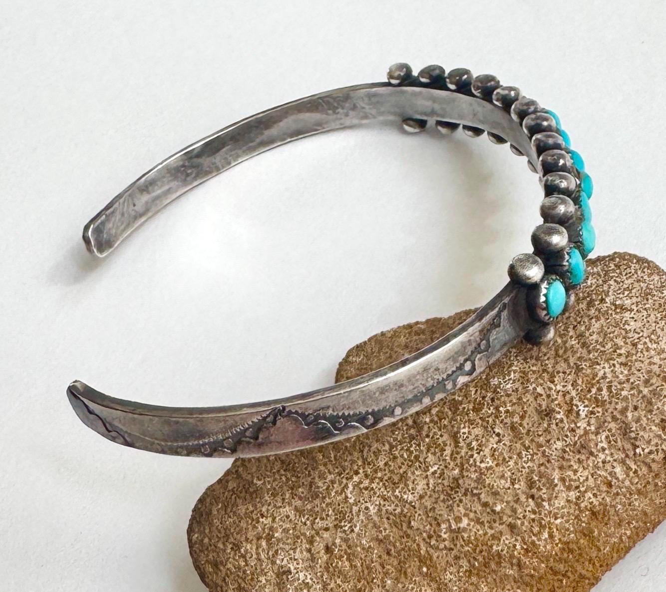 STYLE #3: Rustic sterling silver band with two rows of alternating needlepoint and snake eye set turquoise stones. Measures 5-1/8" long with an opening of 1-1/2". Total interior circumference is 6-5/8". Good vintage condition