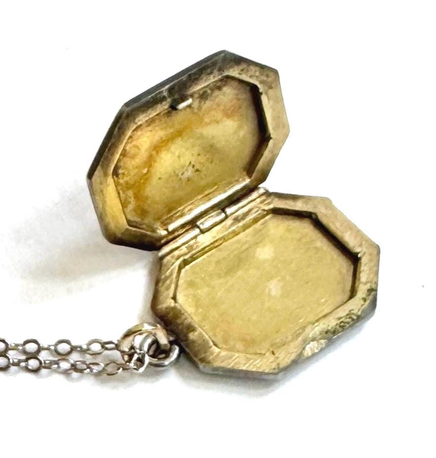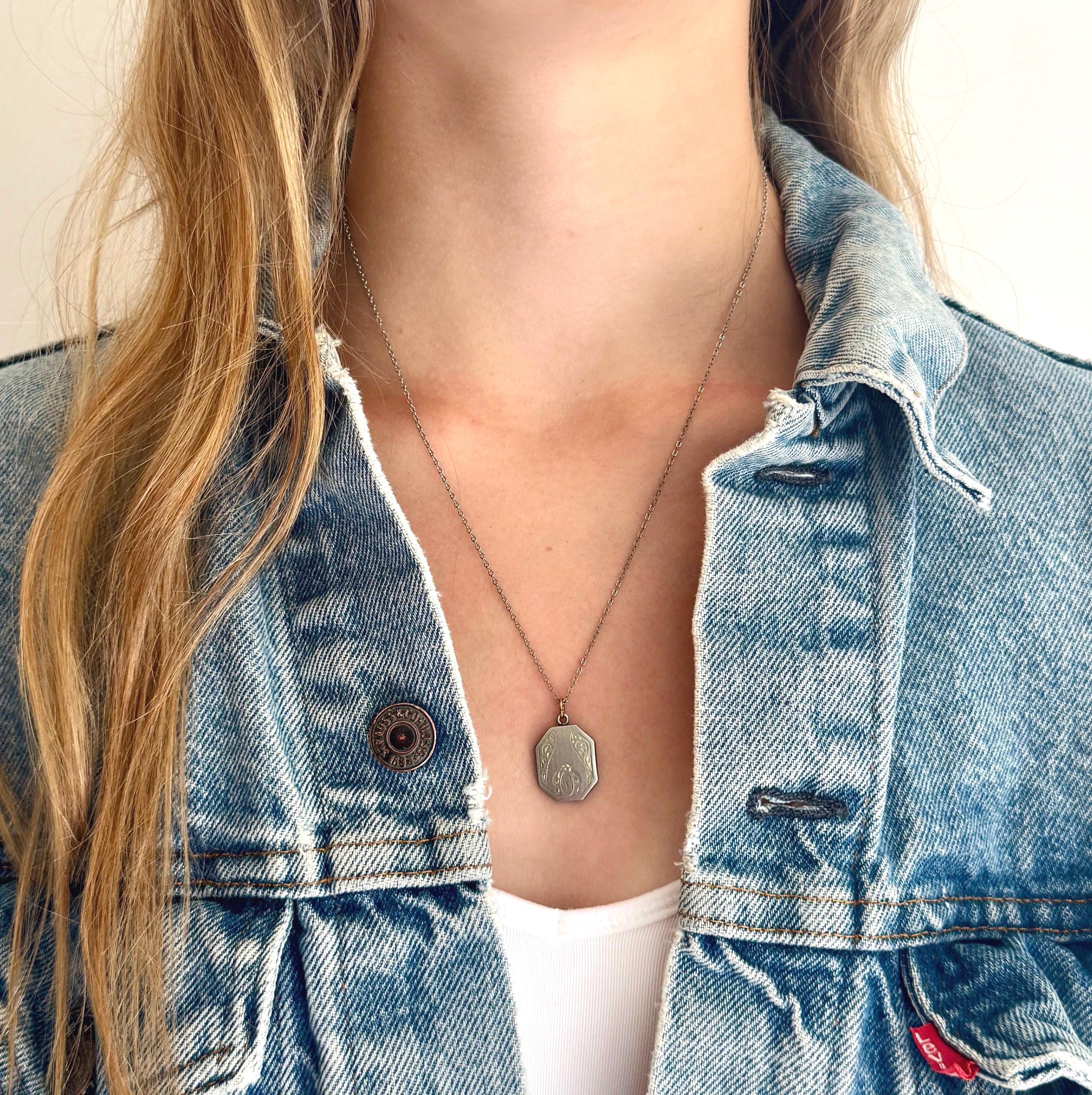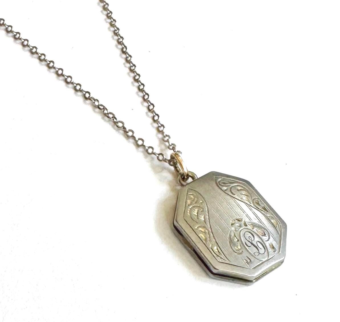 Antique Victorian monogrammed locket strung on a delicate silver tone 14K gold fill chain