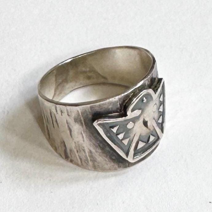 Handsome vintage Native American Navajo sterling silver cigar band with thunderbird appliqué