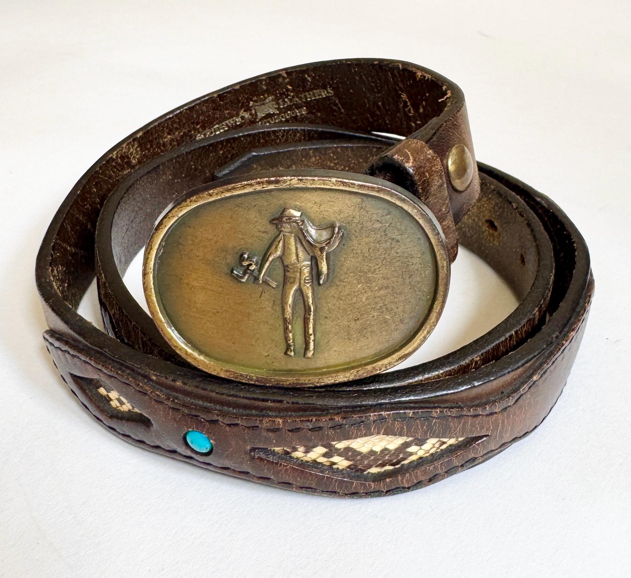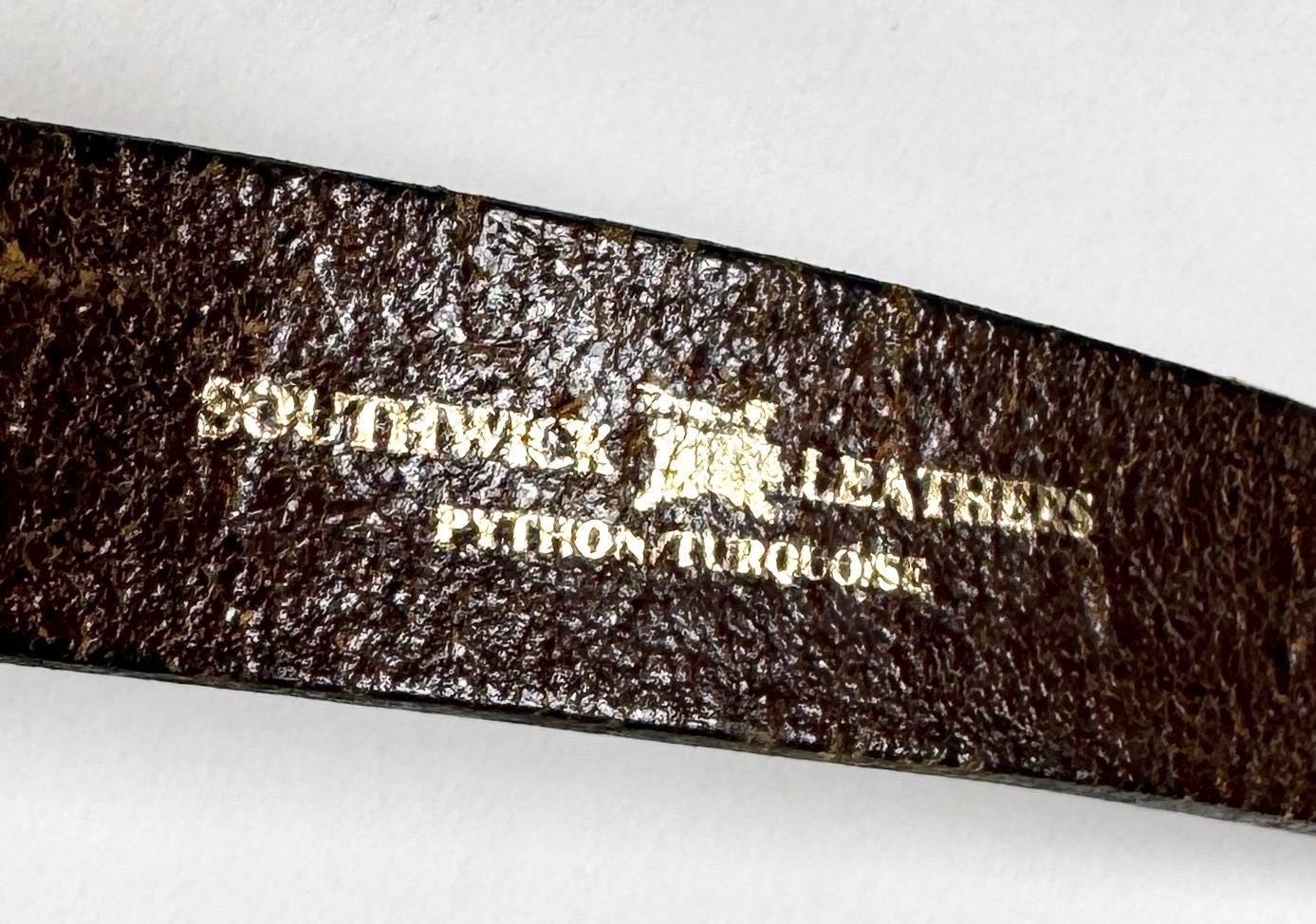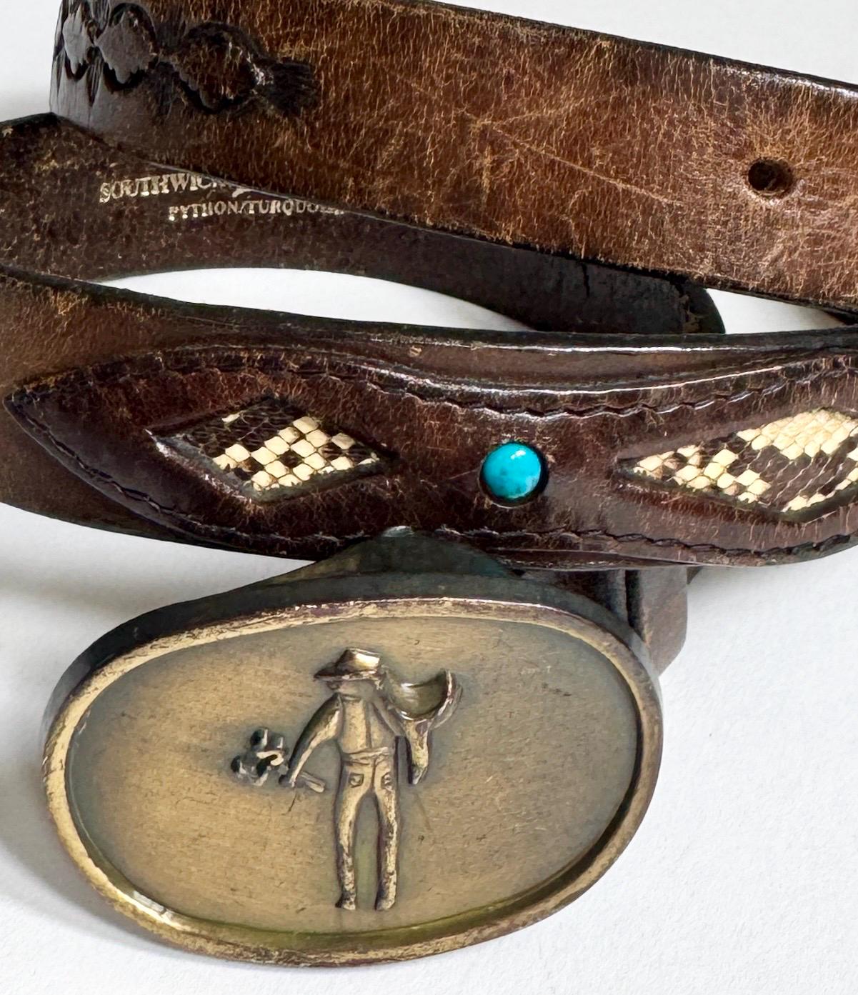 Vintage Levi Strauss & Co cowboy brass buckle mounted on a handsome Southwick Leathers Western belt strap inset Python and turquoise stone details