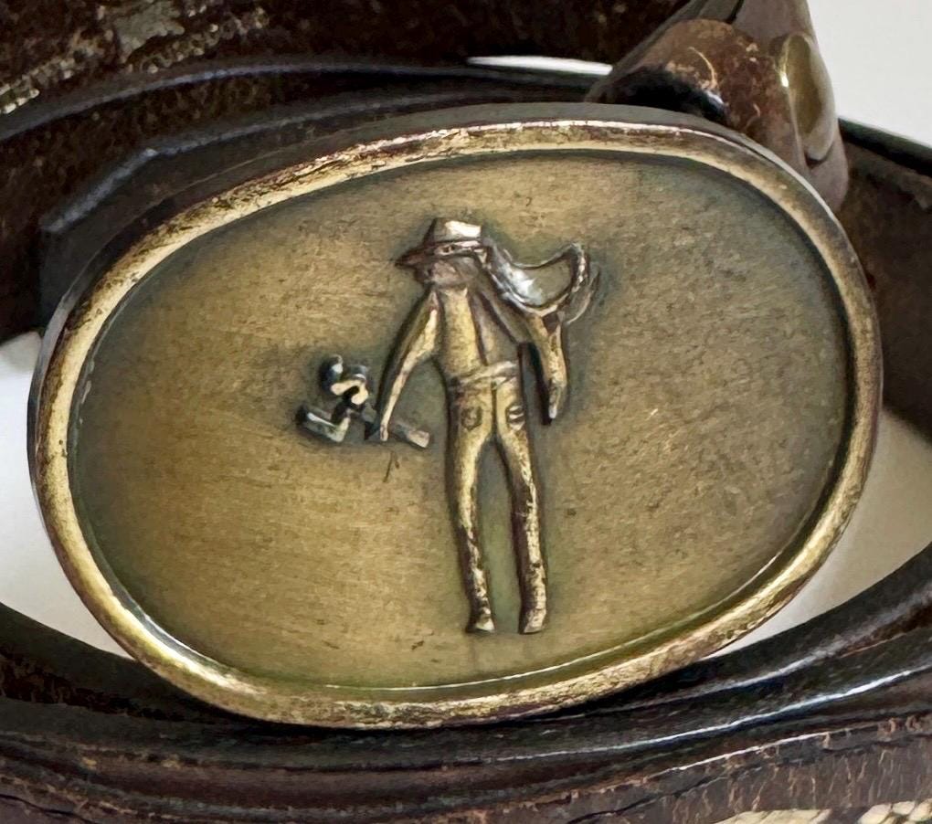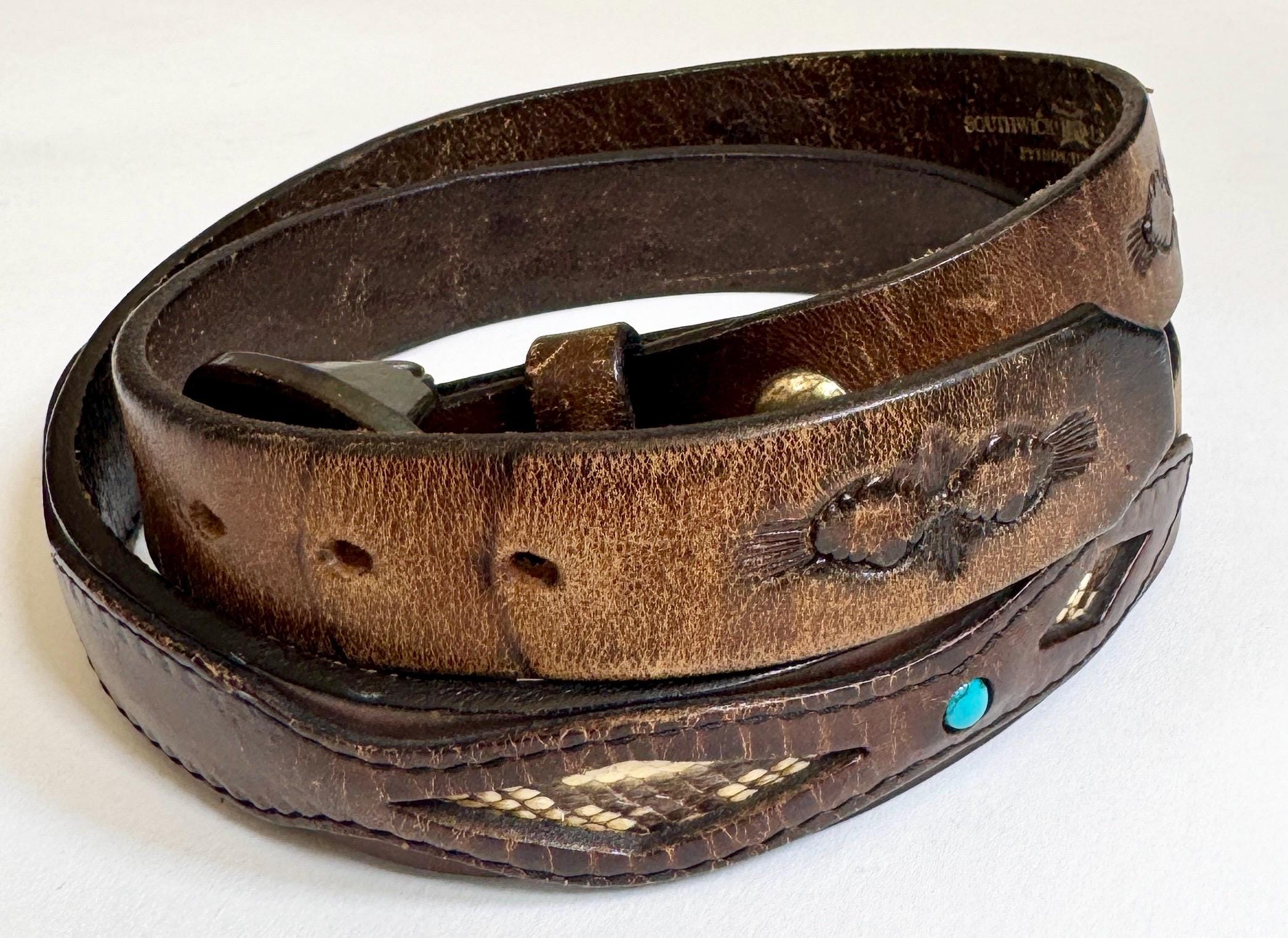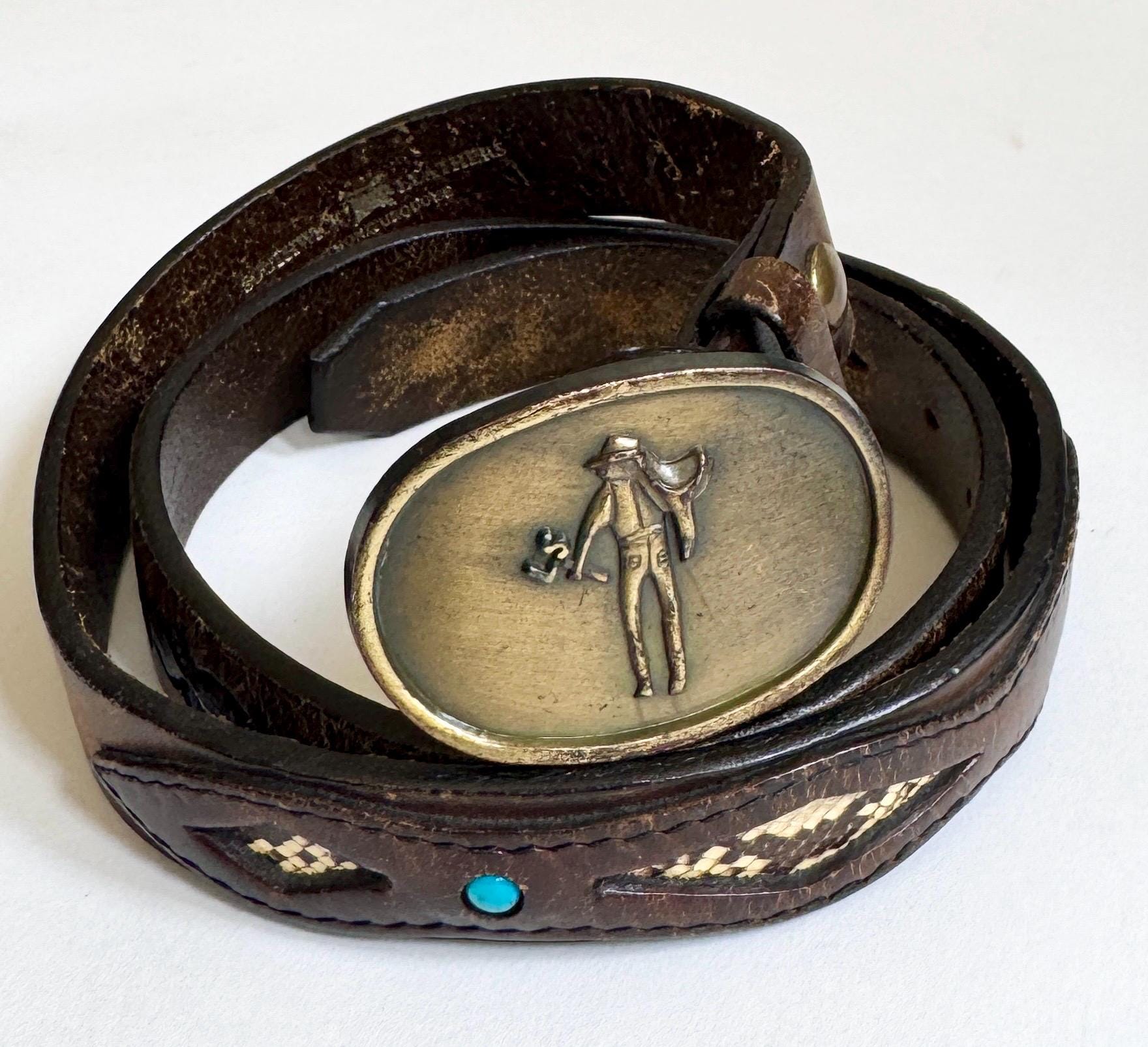 Vintage Levi Strauss & Co cowboy brass buckle mounted on a handsome Southwick Leathers Western belt strap inset Python and turquoise stone details