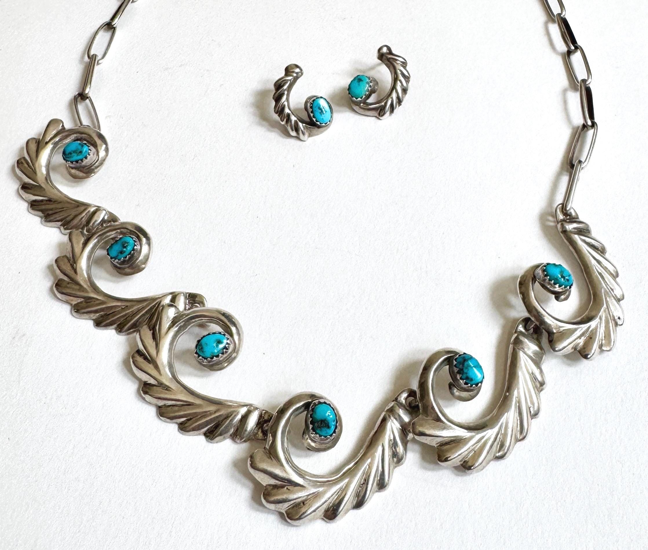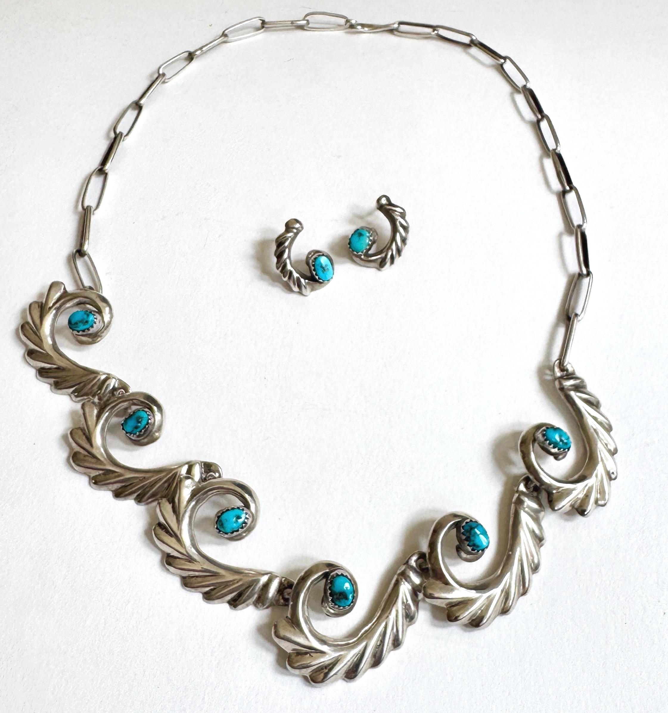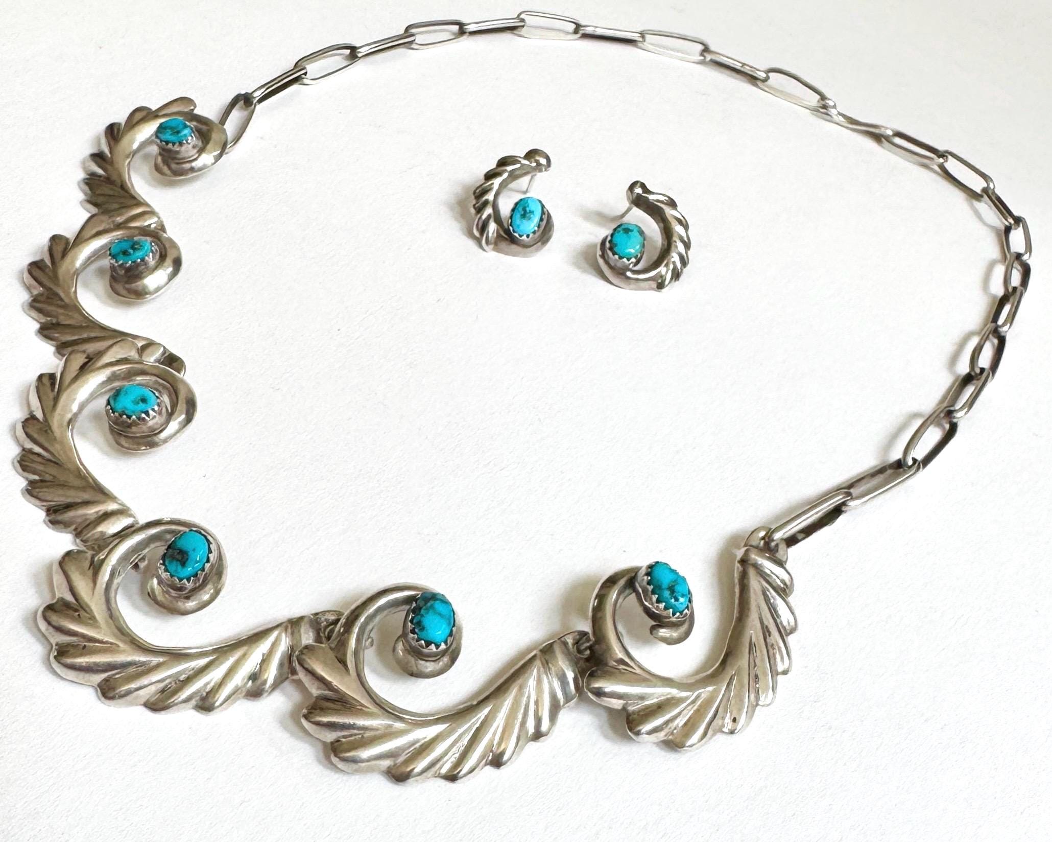 Early mid century vintage Native American Navajo handcrafted cast sterling silver and turquoise jewelry set