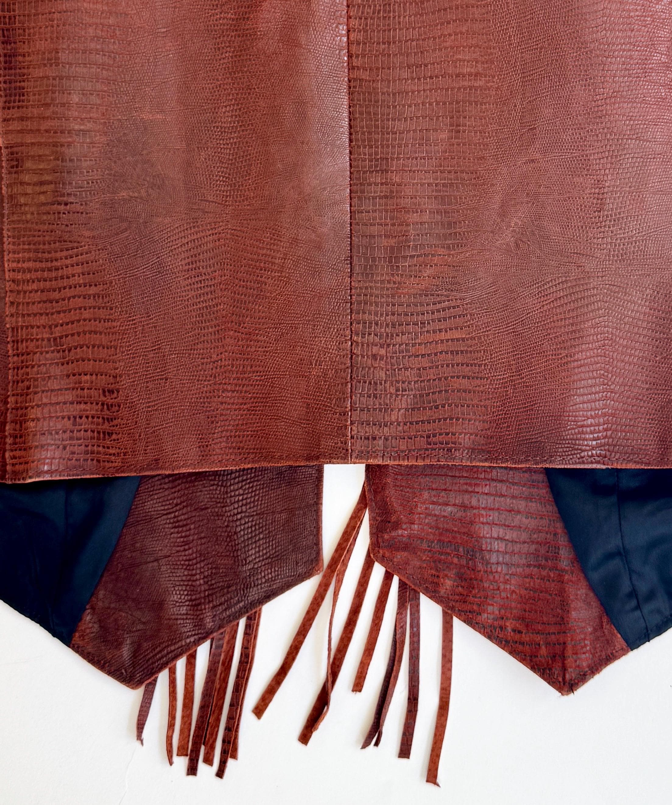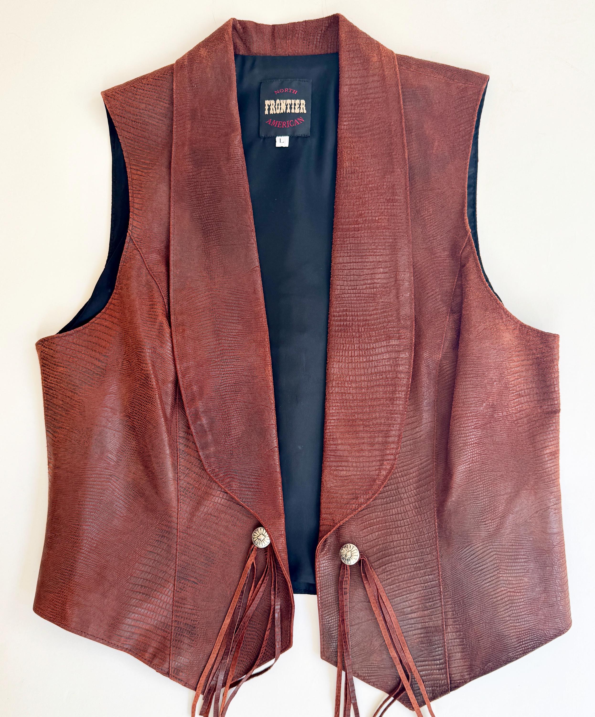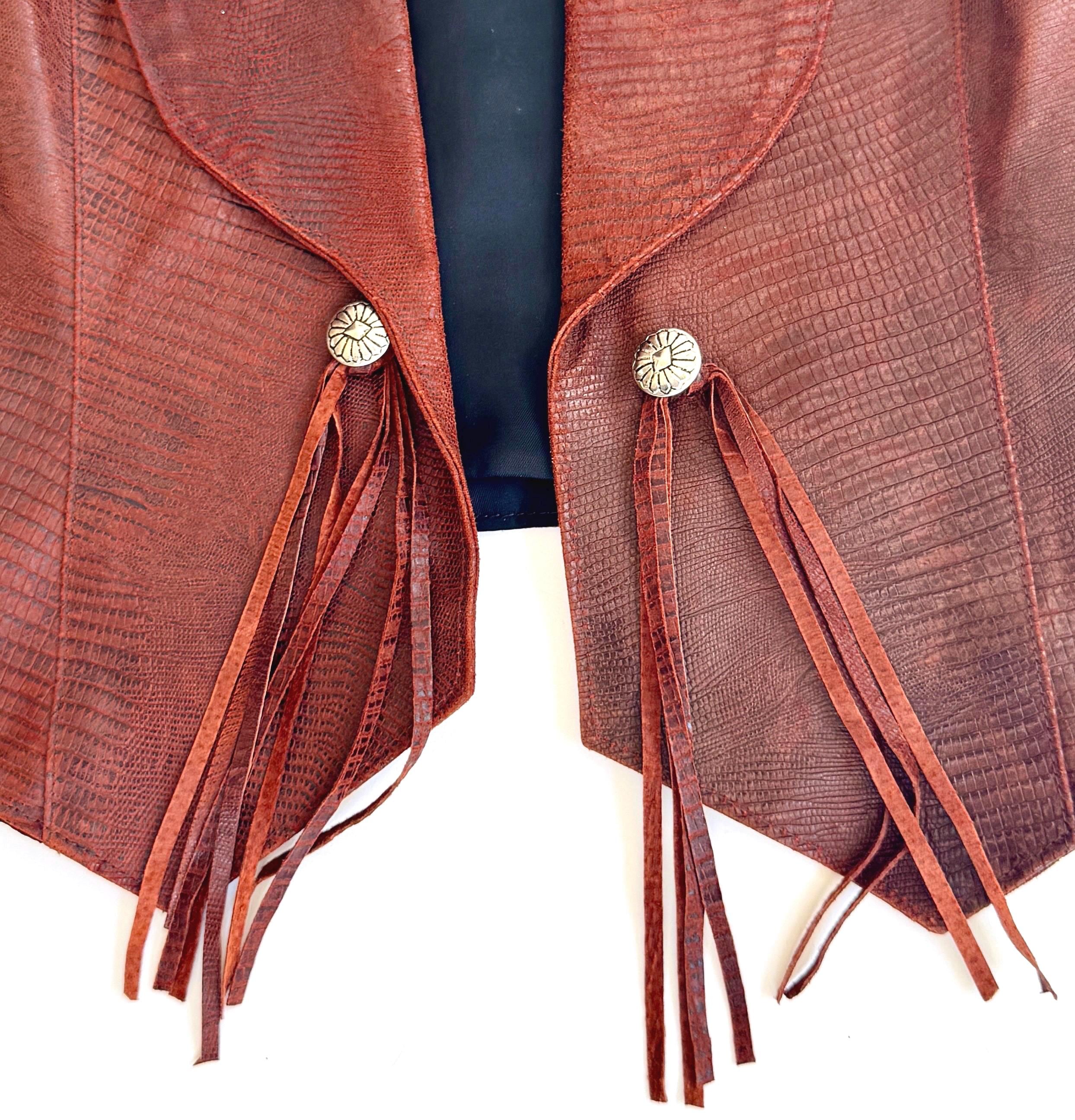 Vintage Western reptile embossed pig leather vest with fringe trim and concho details
