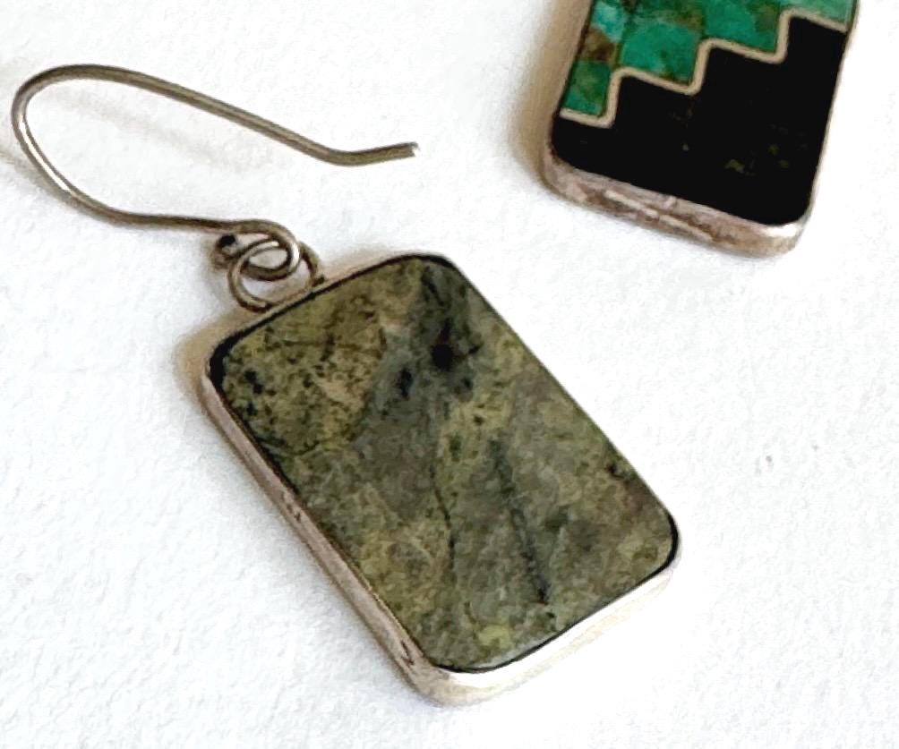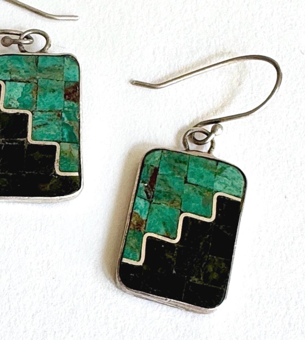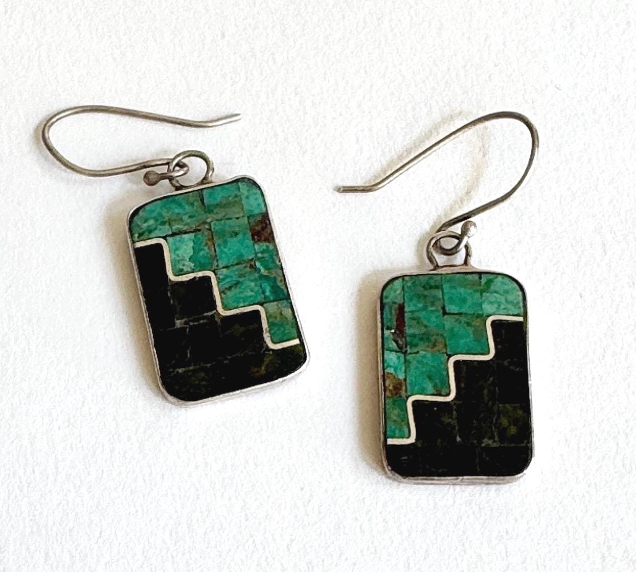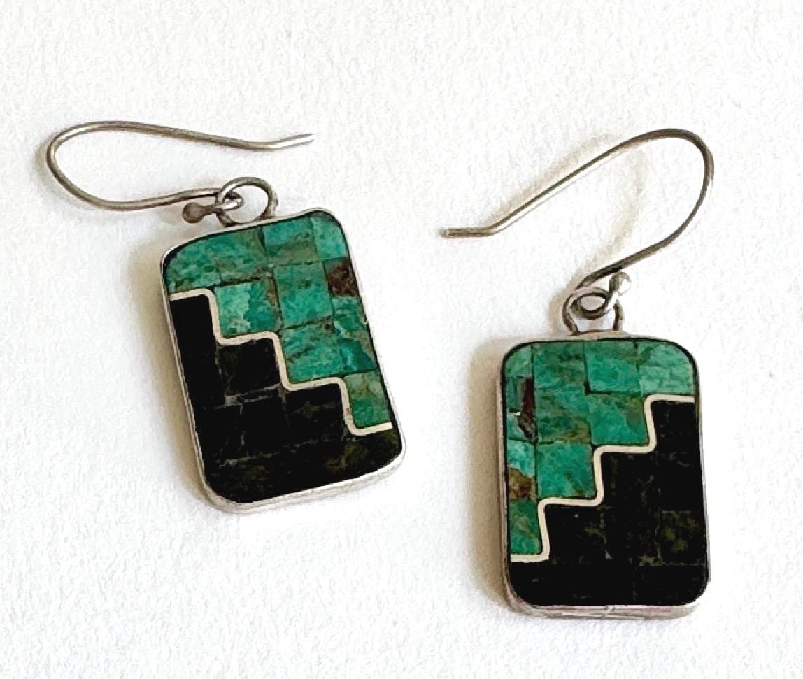 Older Native American Zuni sterling silver drop earrings with flush turquoise mosaic inlay