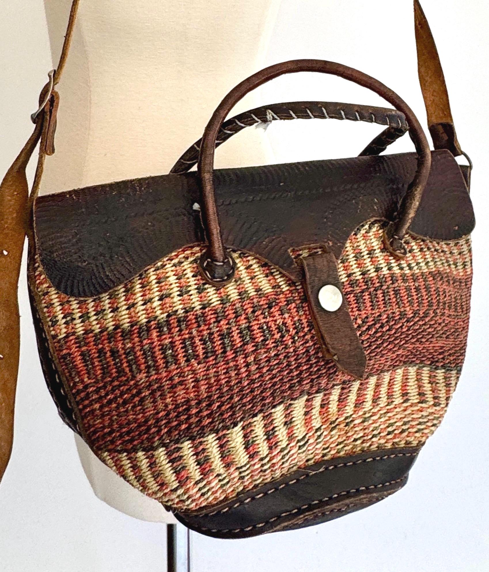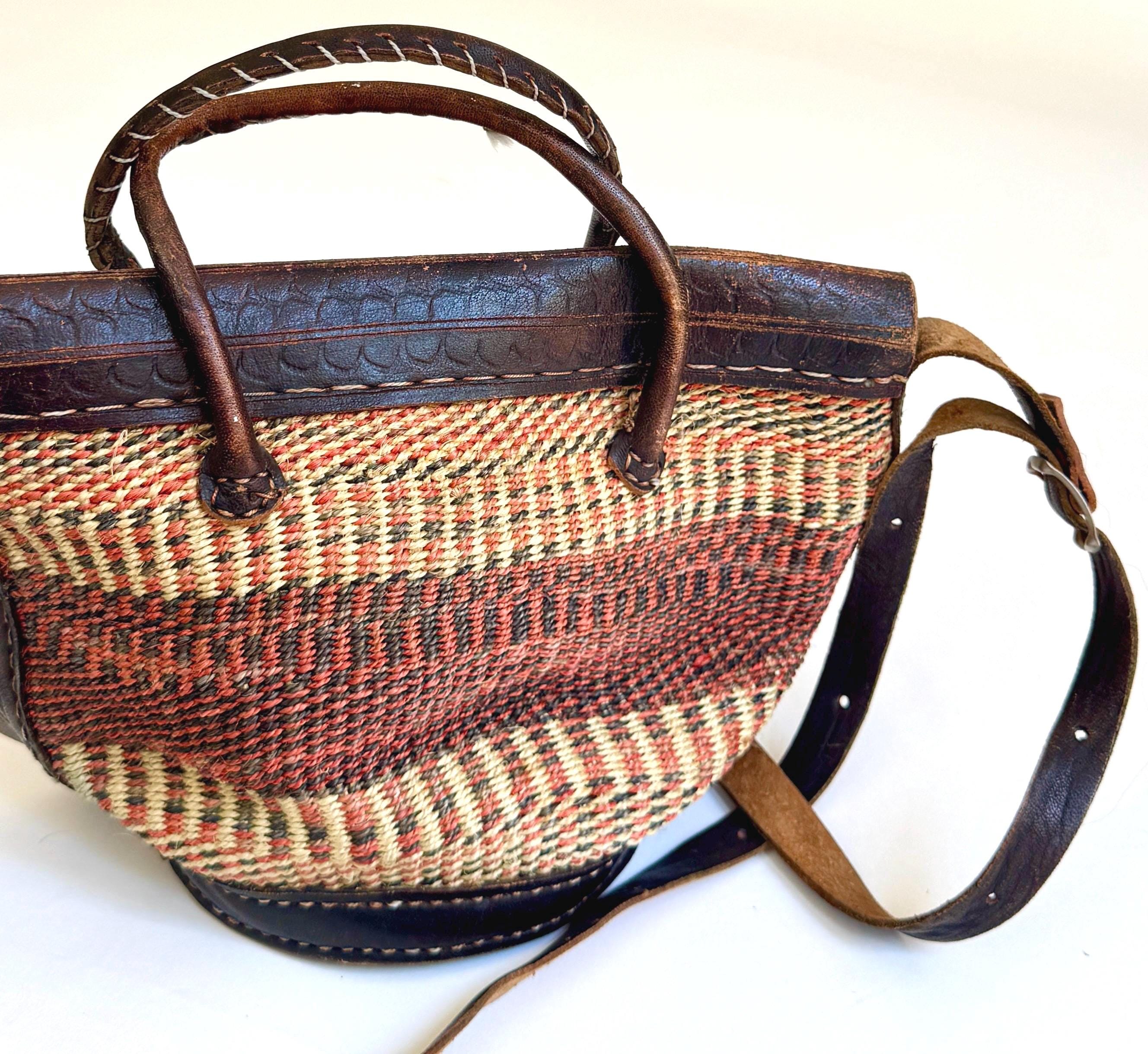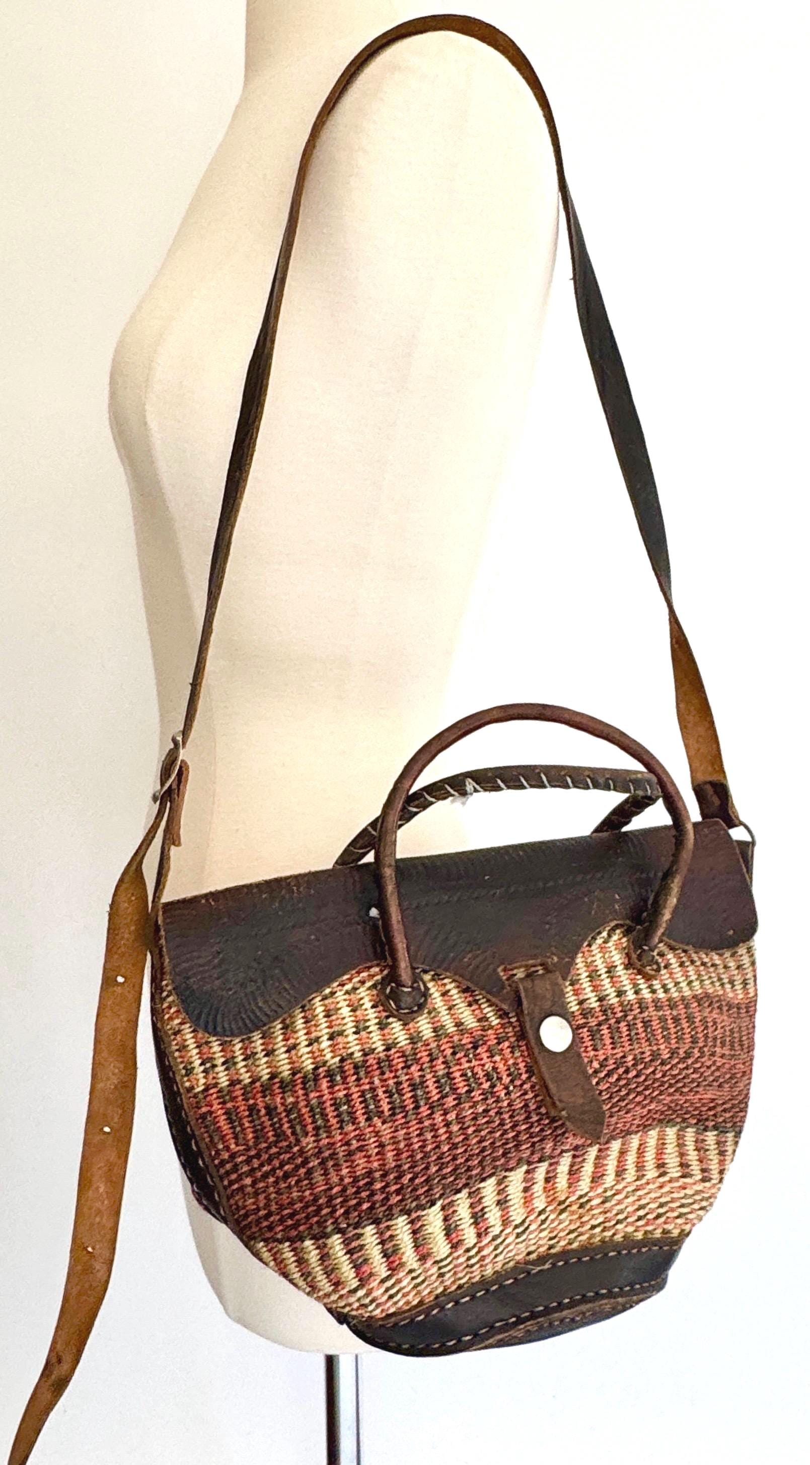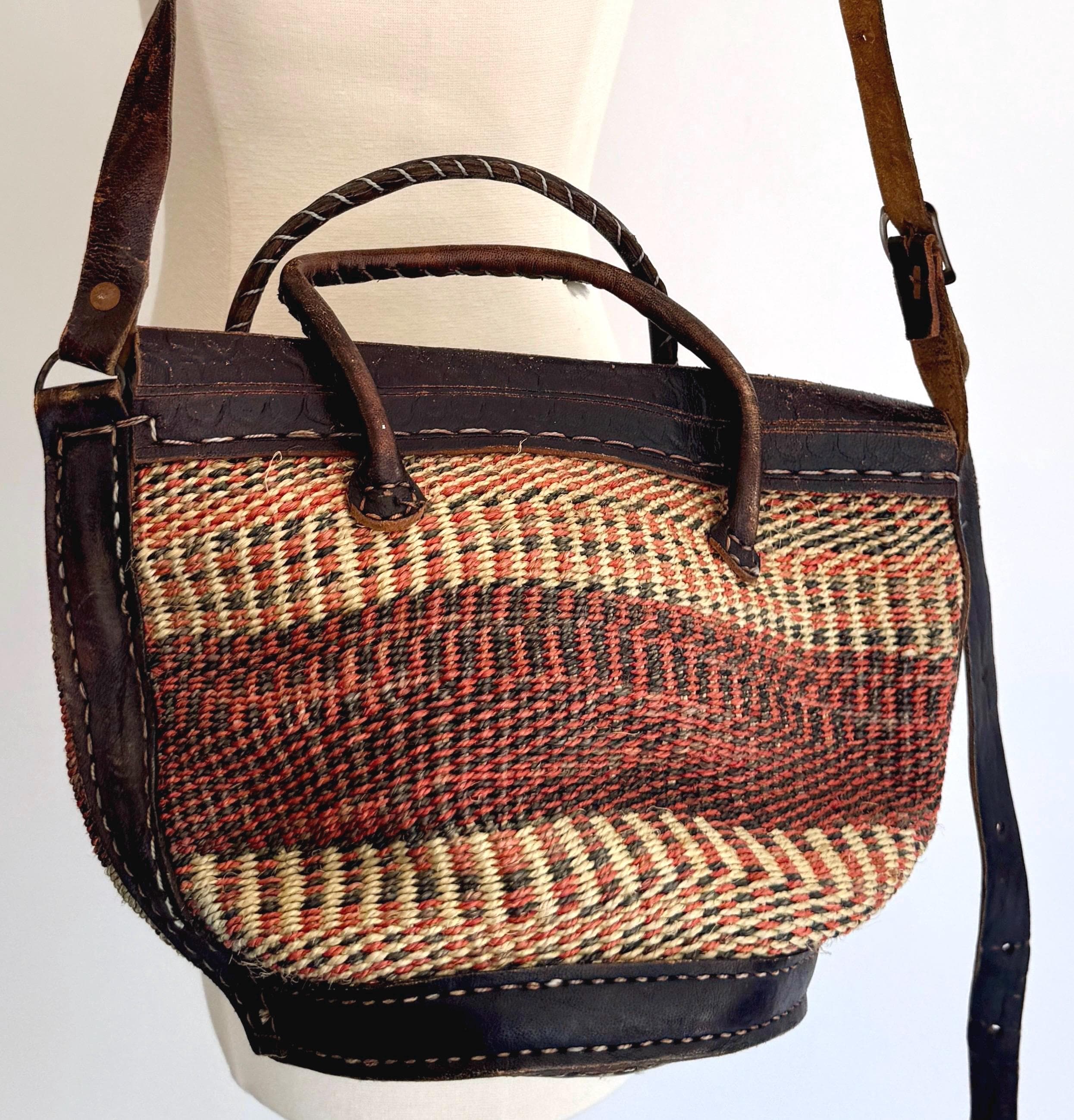 Vintage 80's/90's desert tone woven sisal bag with leather trim and straps