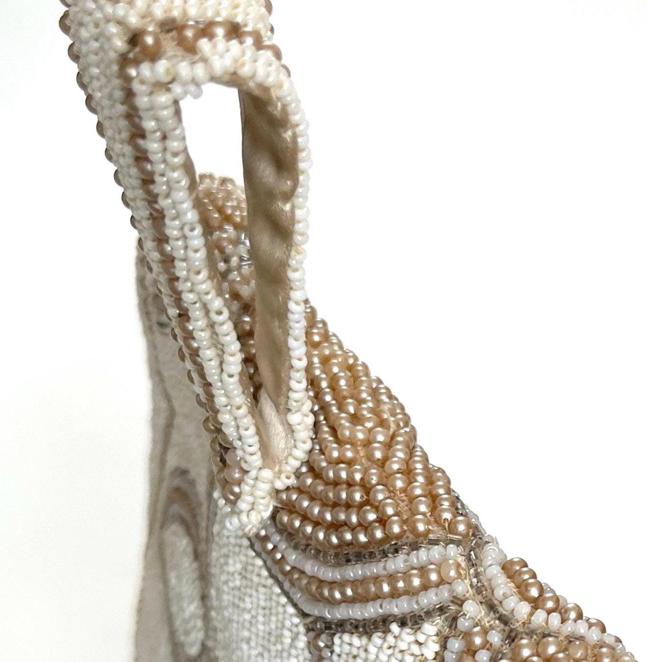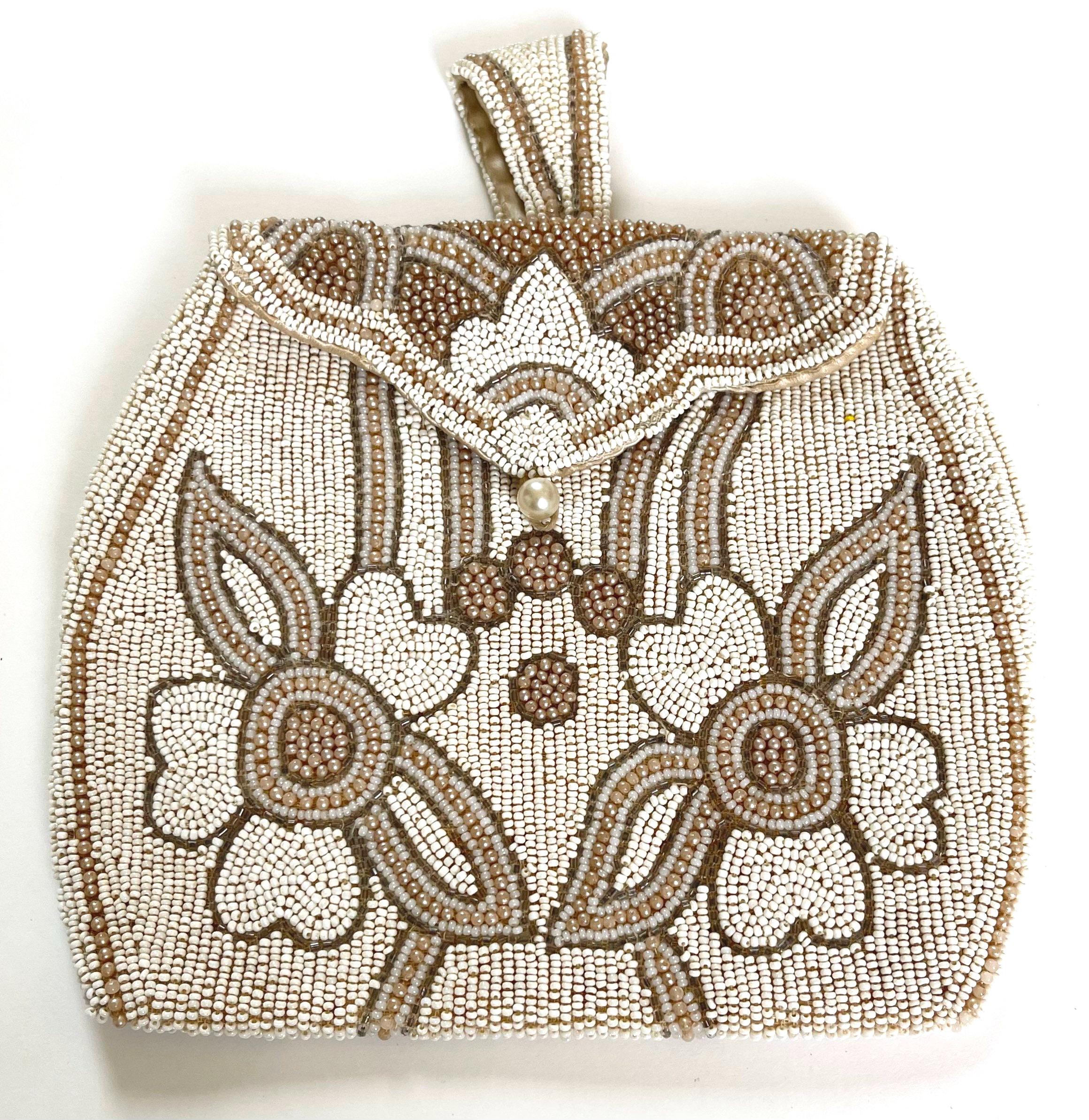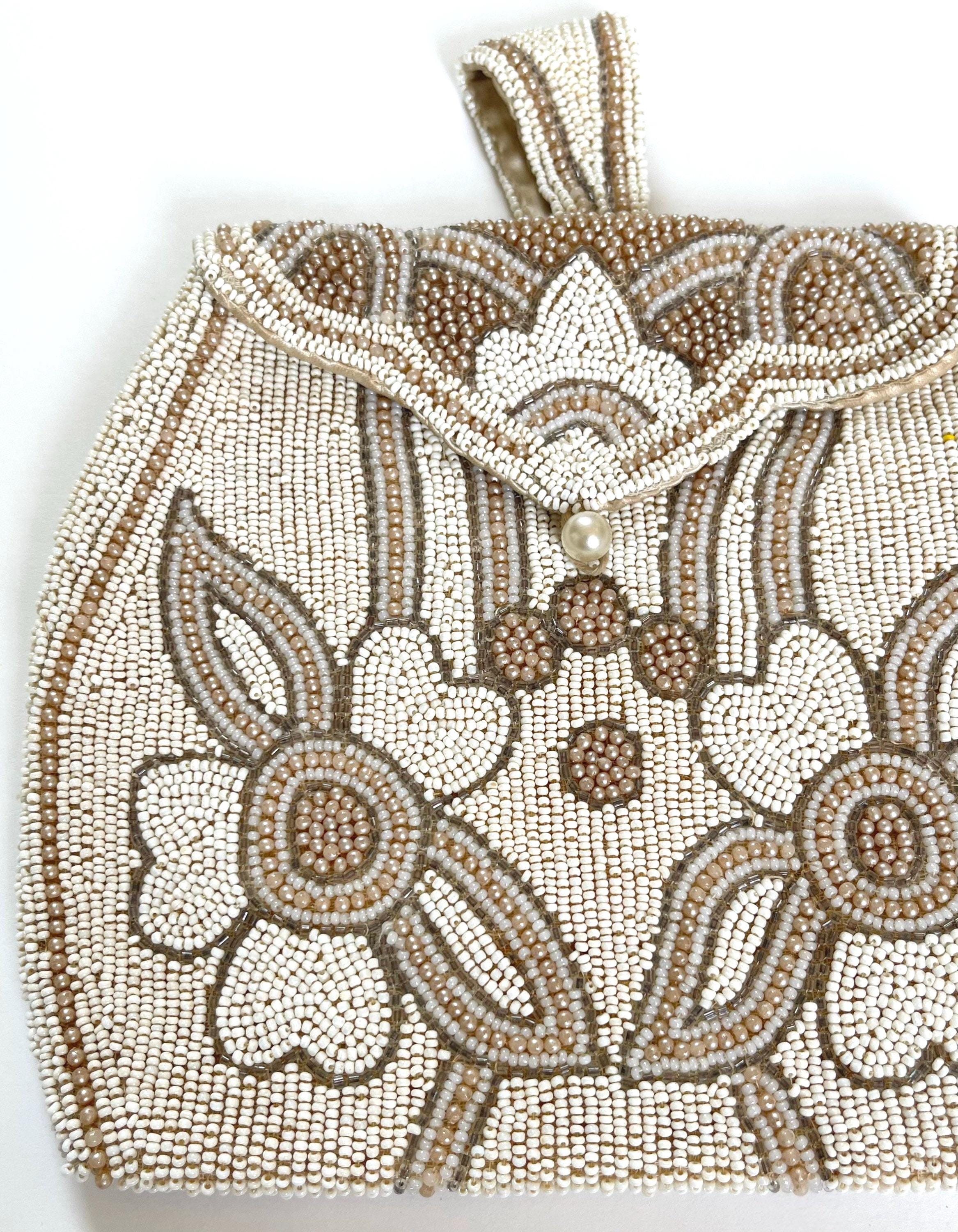 Adorable handmade antique floral beaded finger purse with pearl button closure