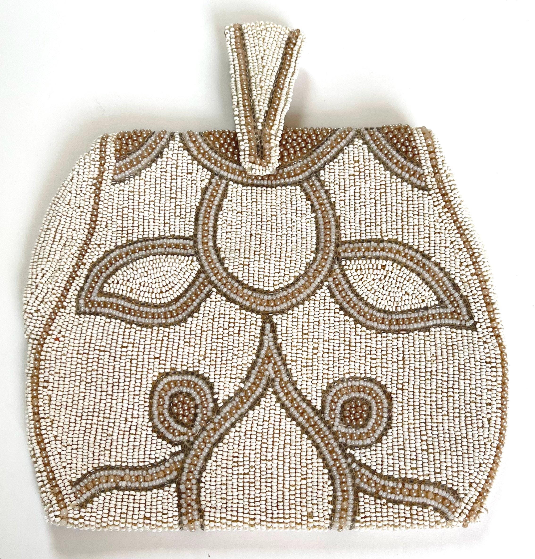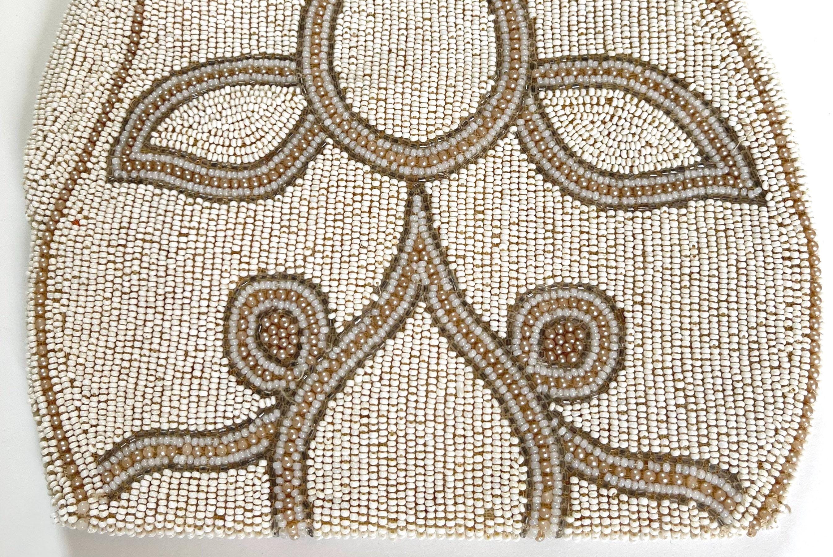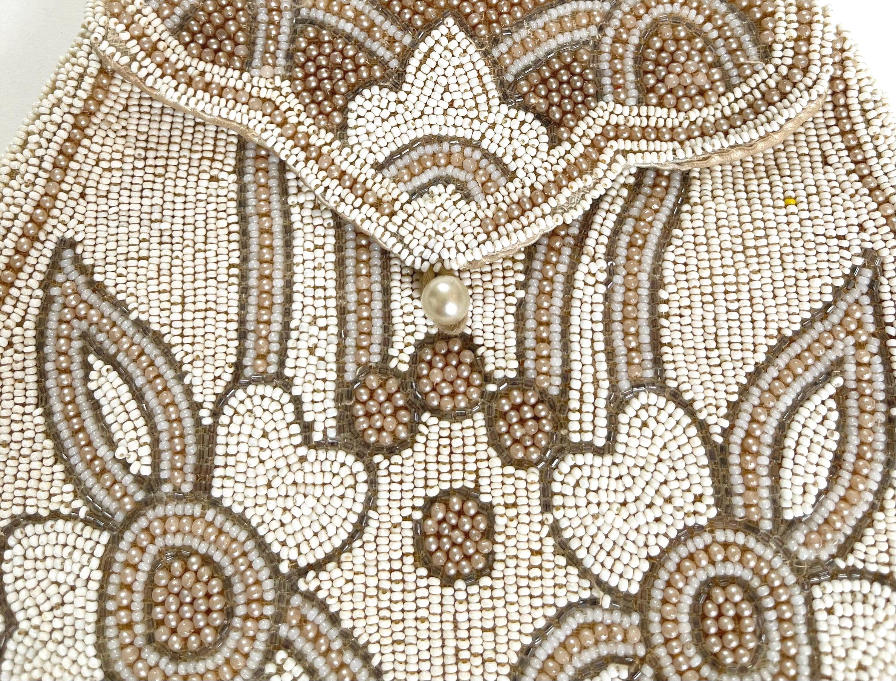 Good vintage condition given its 100 year age. Missing a bead here and there is some light discoloration and red marks on flap interior lining.