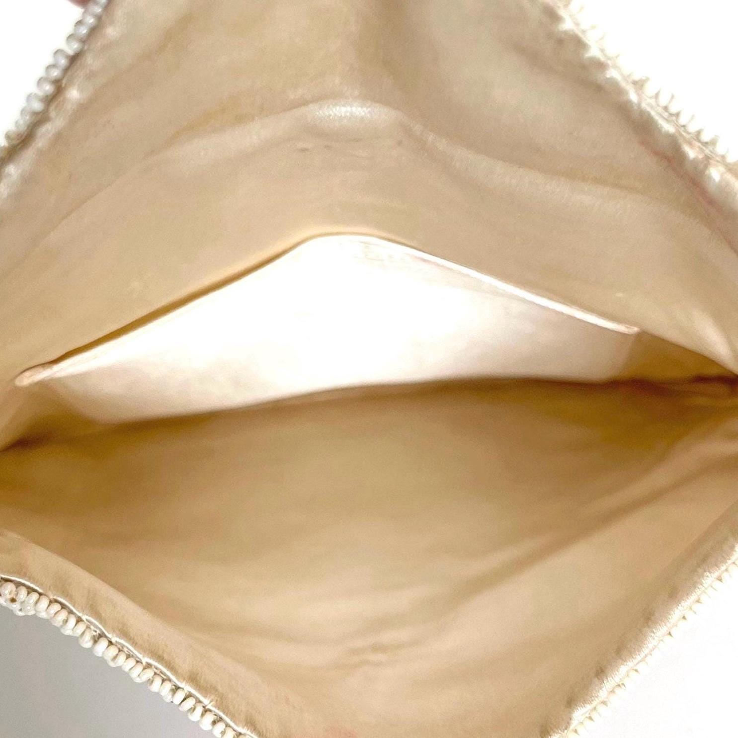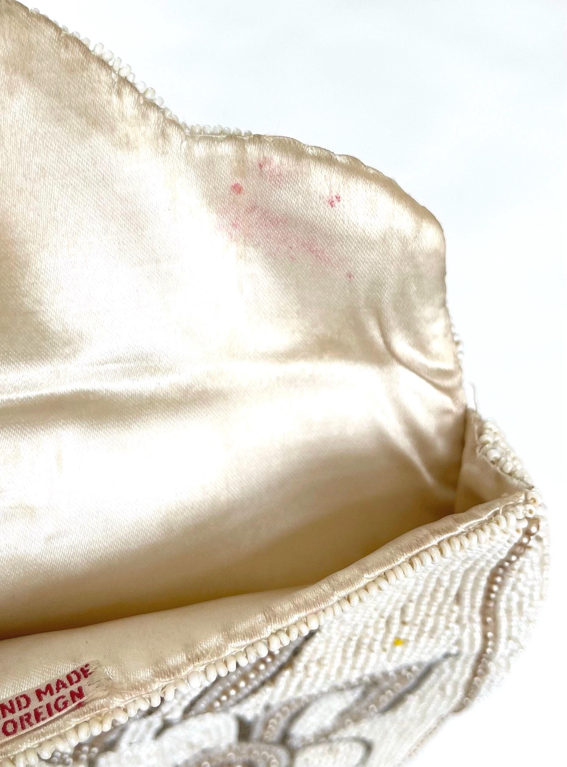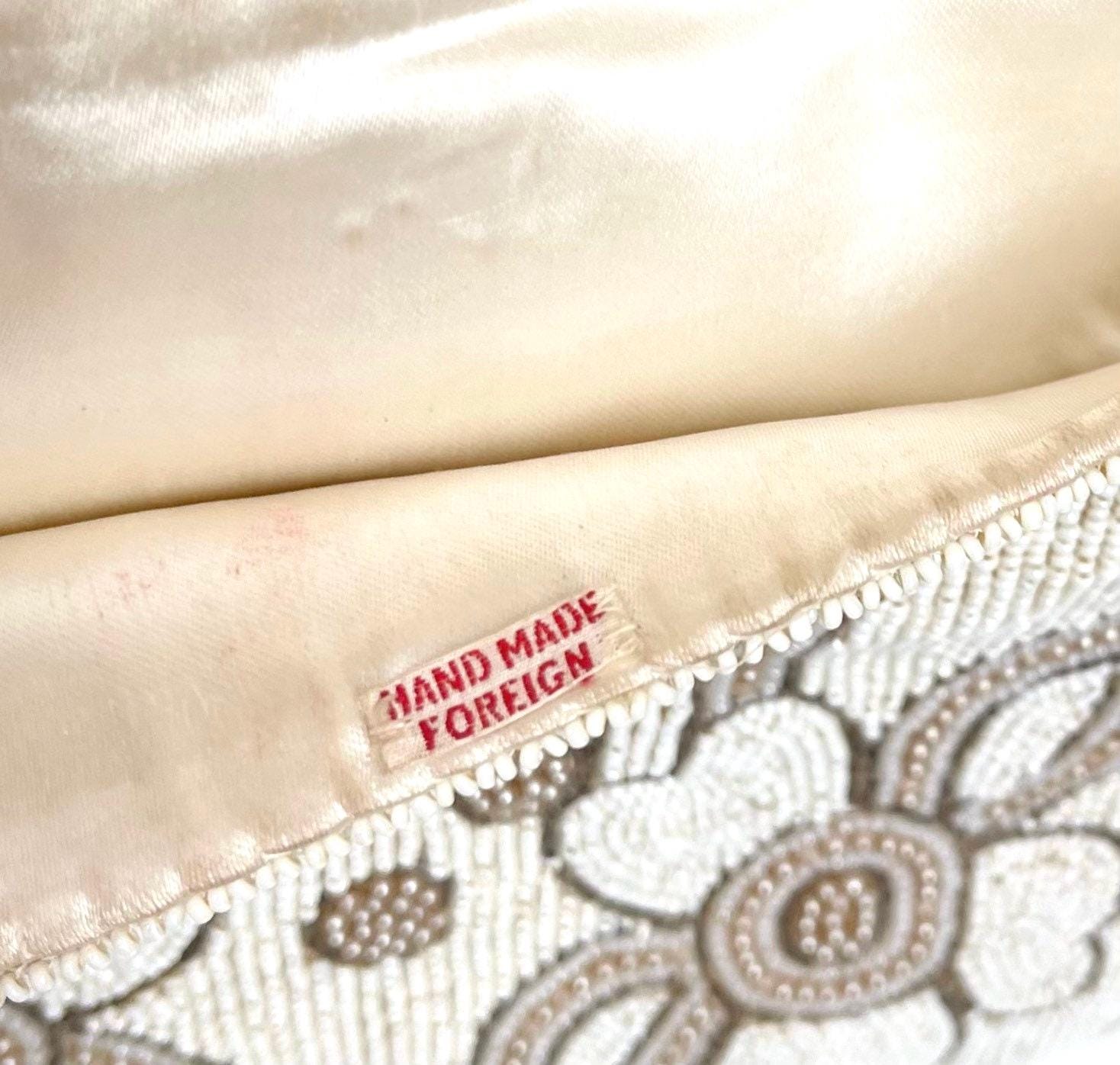 Good vintage condition given its 100 year age. Missing a bead here and there is some light discoloration and red marks on flap interior lining.