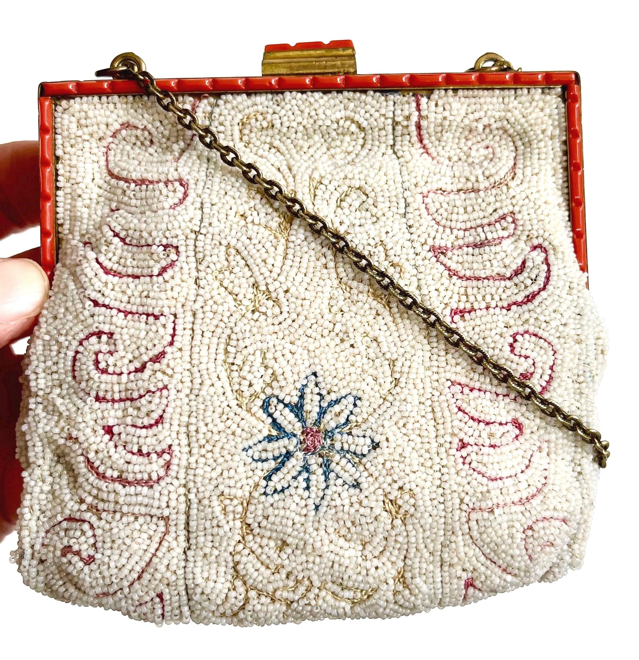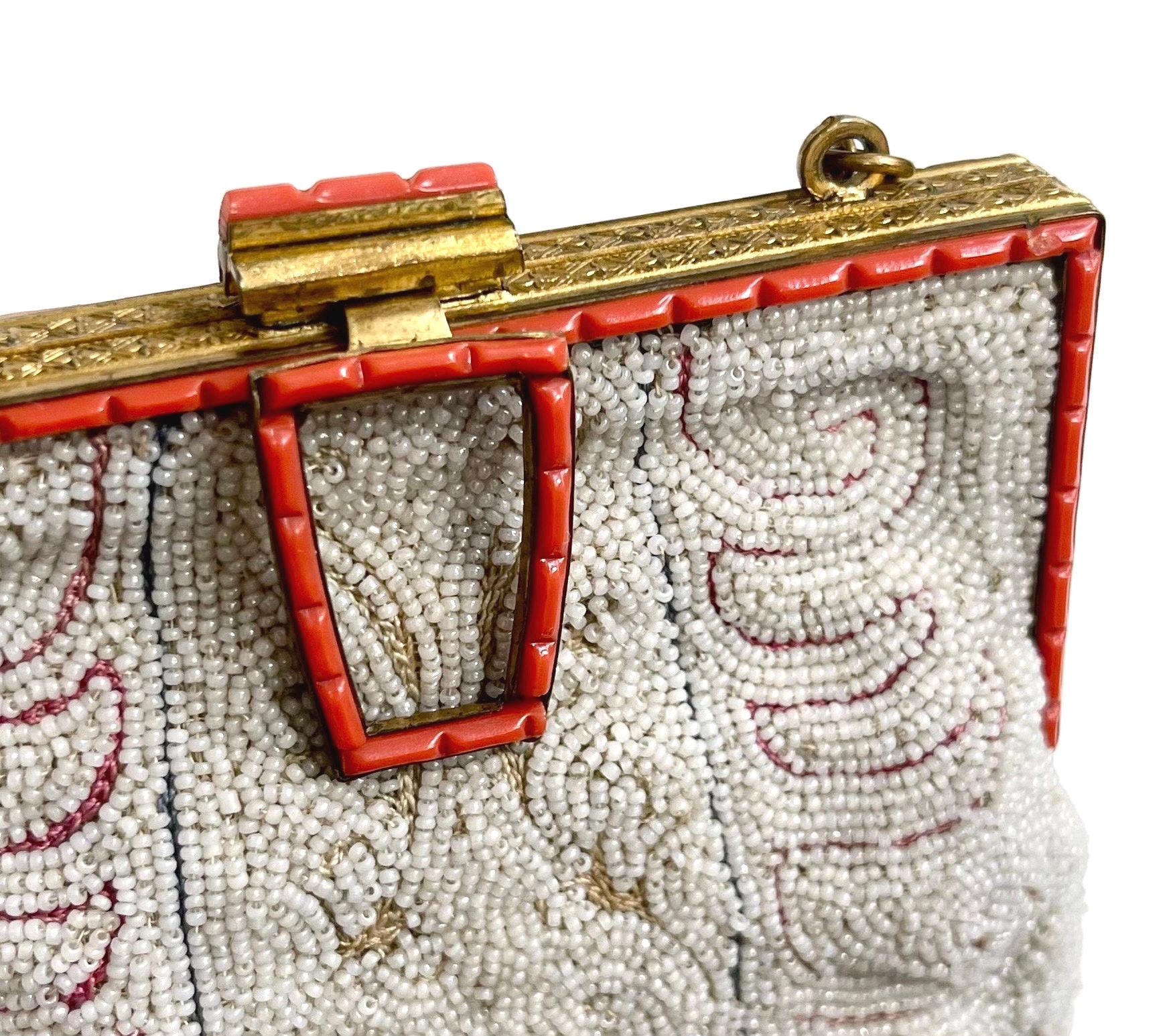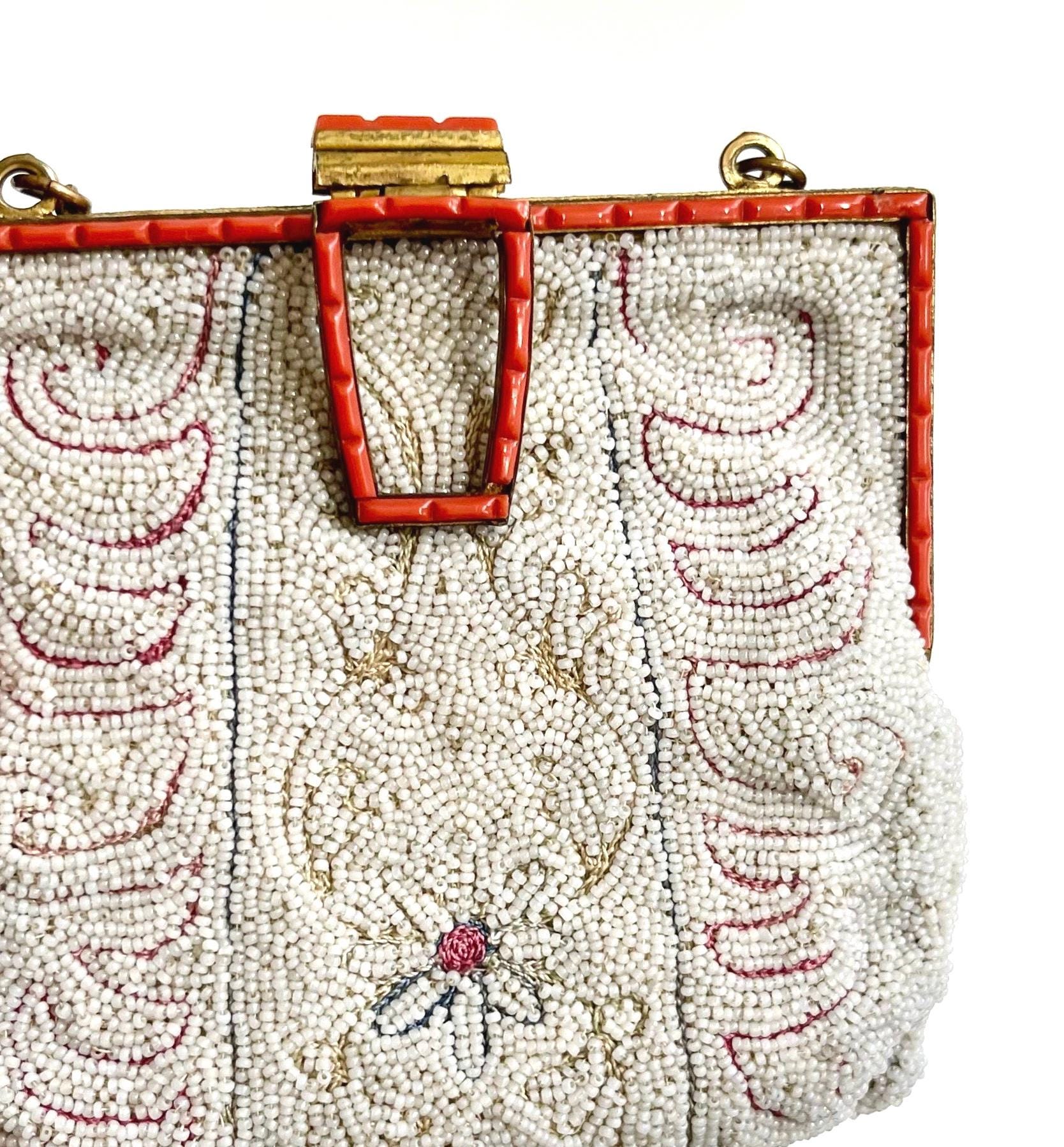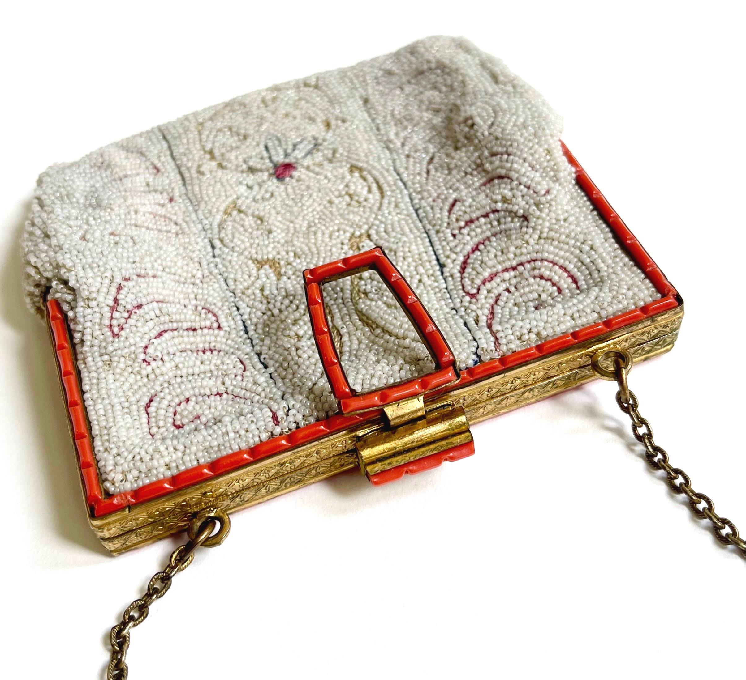Exquisite antique Victorian-era micro glass beaded purse with carved coral accents and dainty brass chain strap