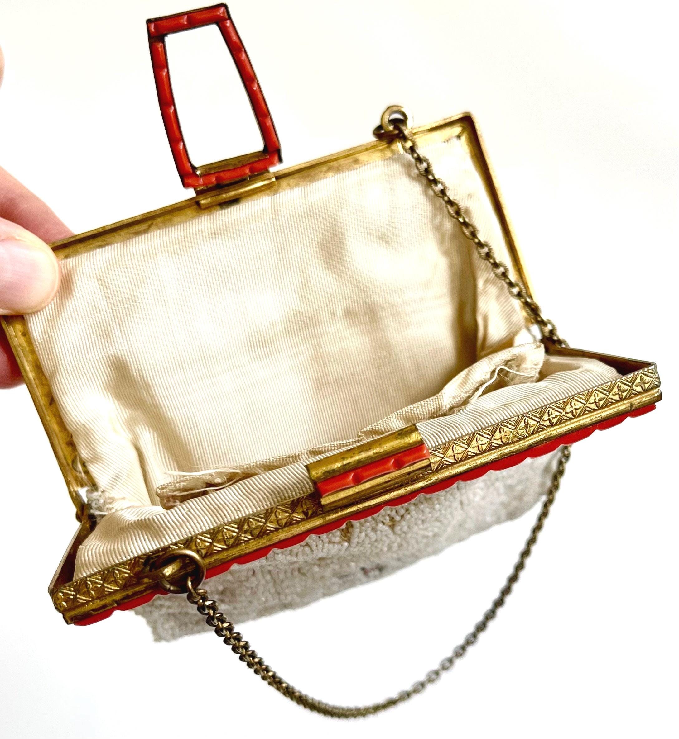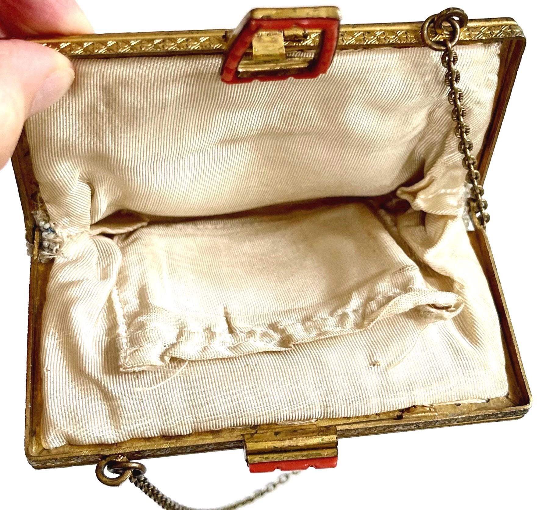 Good vintage condition and beadwork is still in great shape. Silk lining has an aged & discolored patina and the stitching of the interior pocket that that holds the mirror is loose