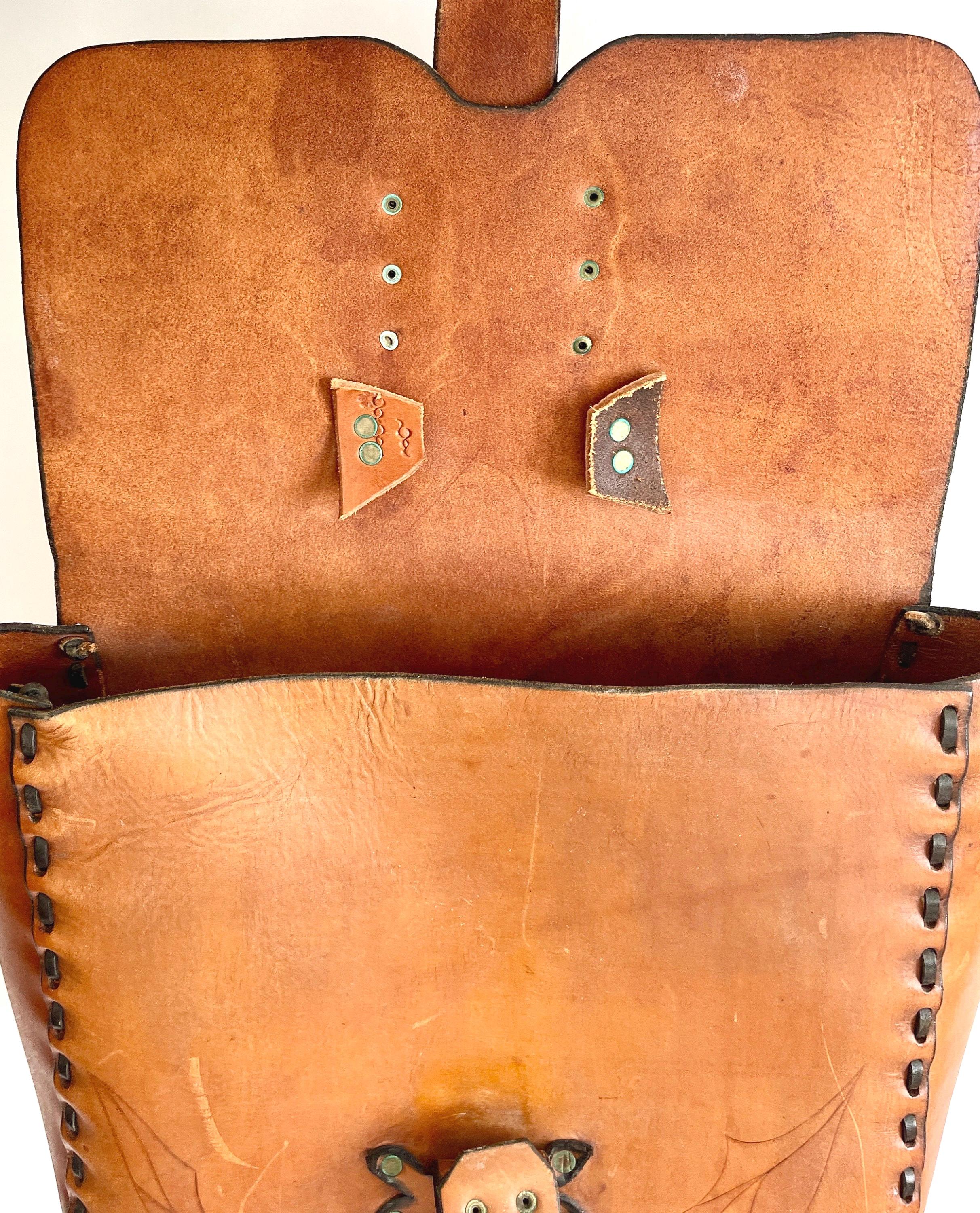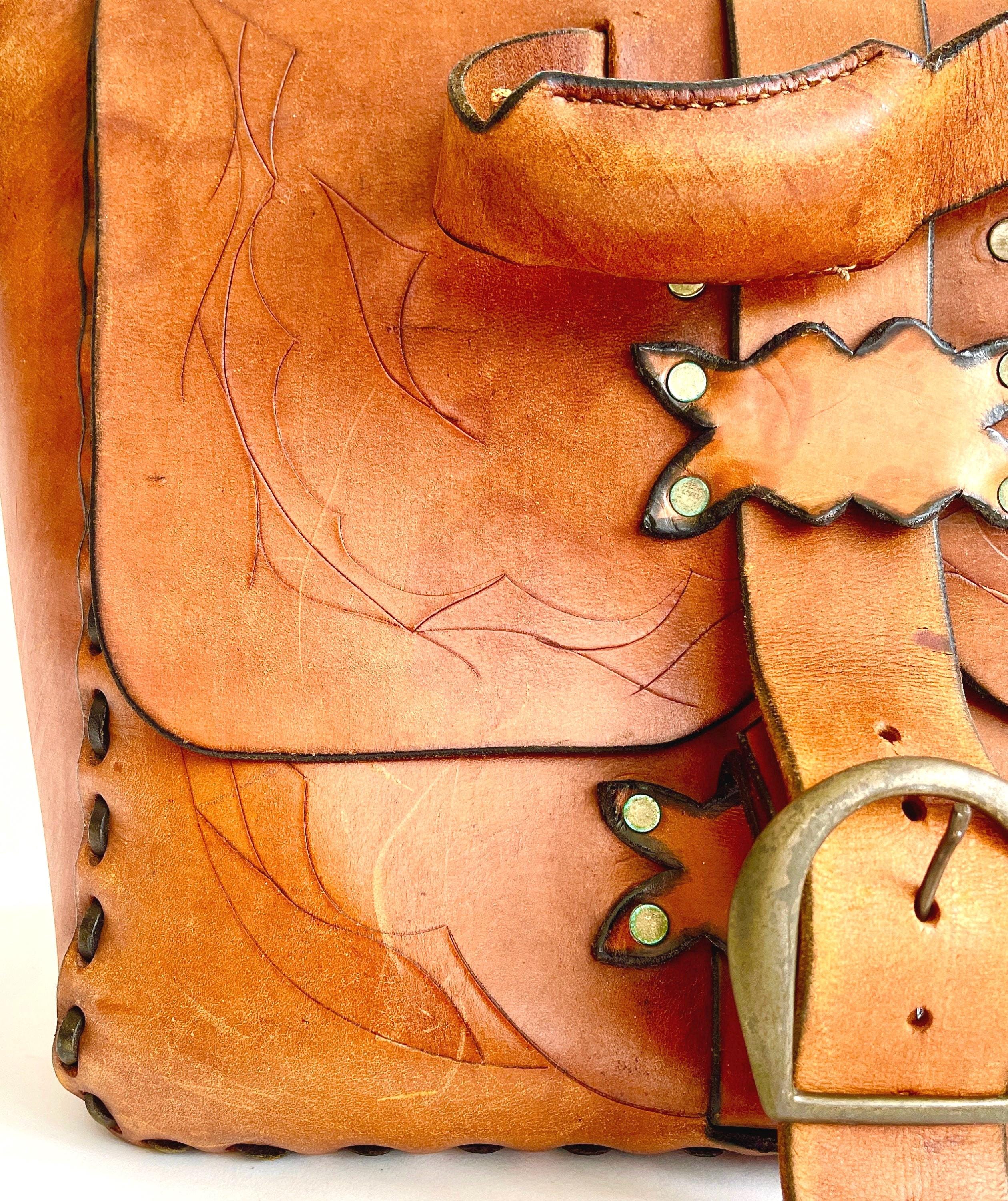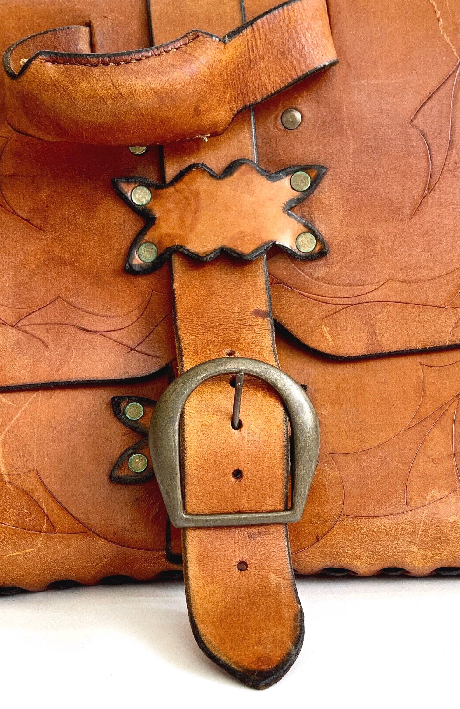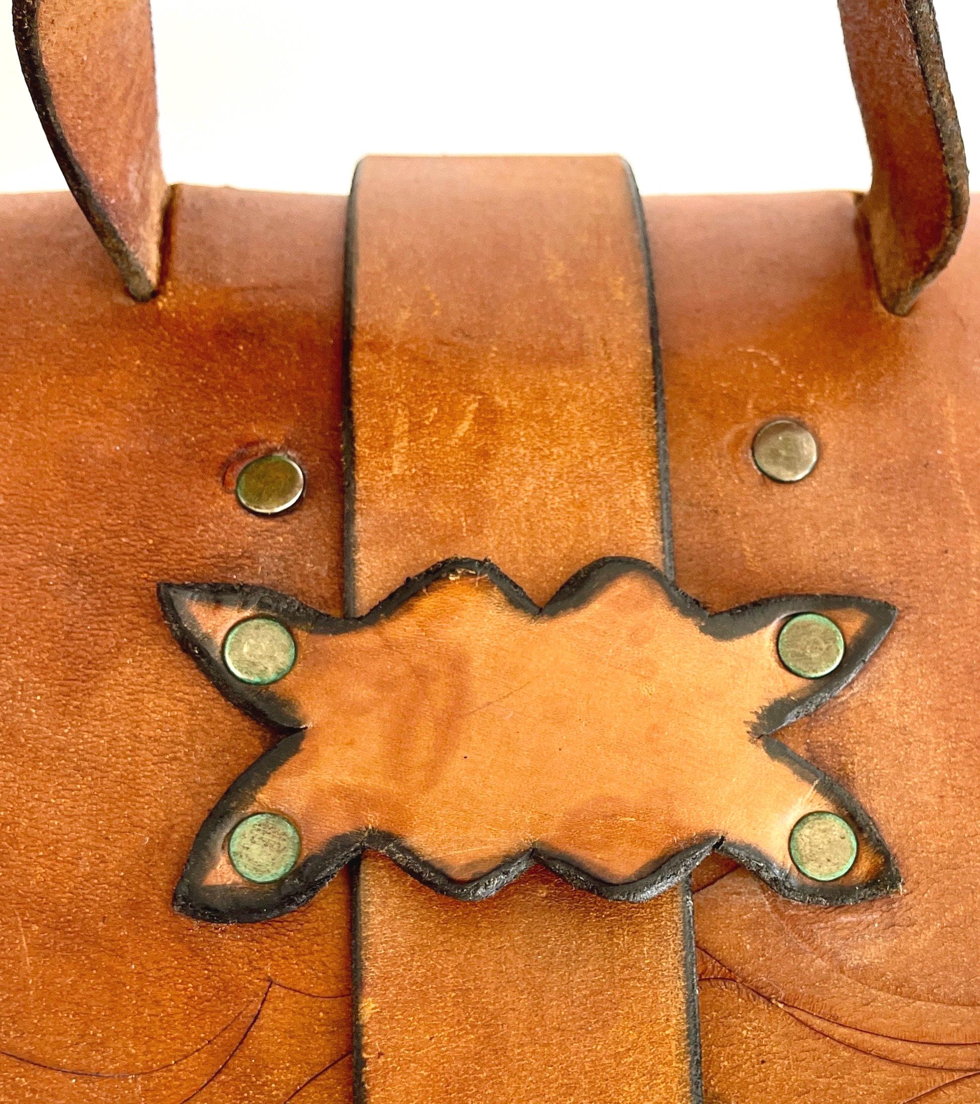 Handsome vintage 70's hand tooled leather top handle bag