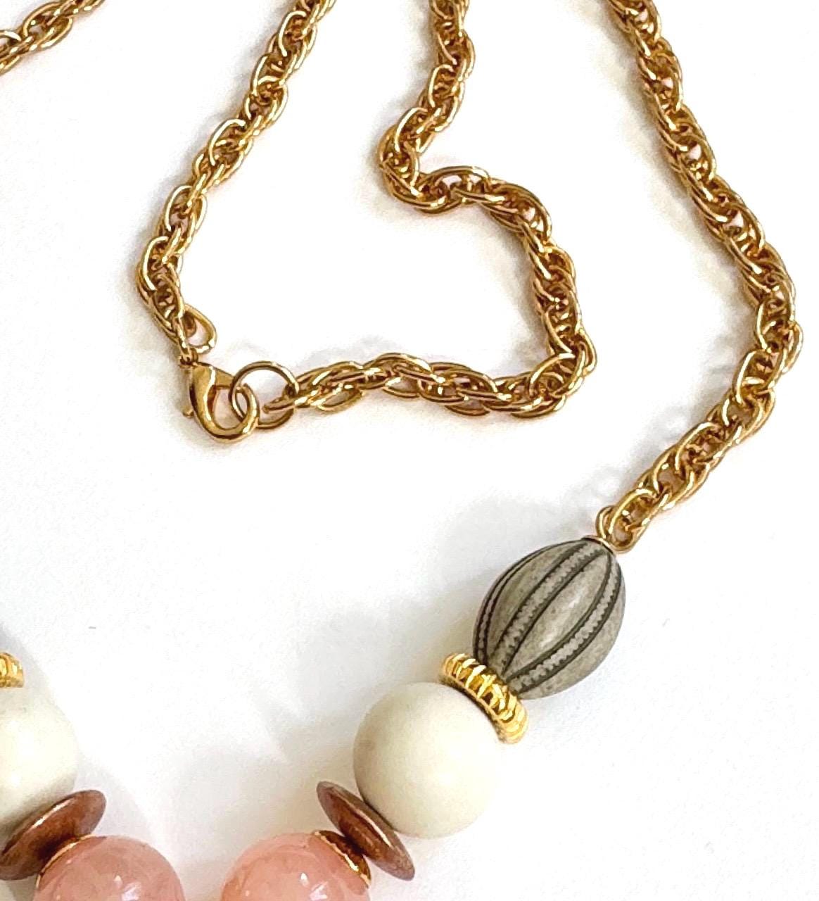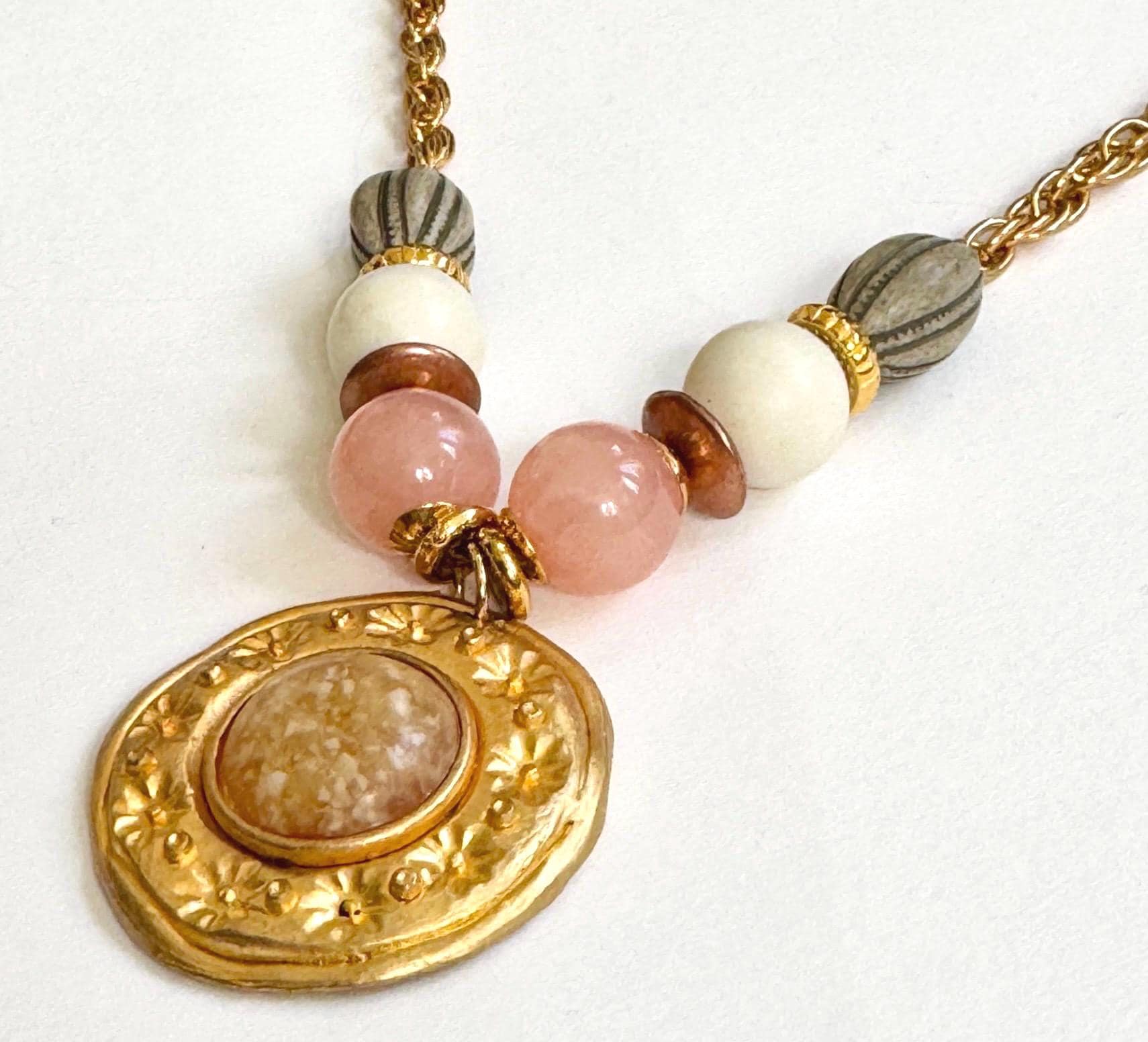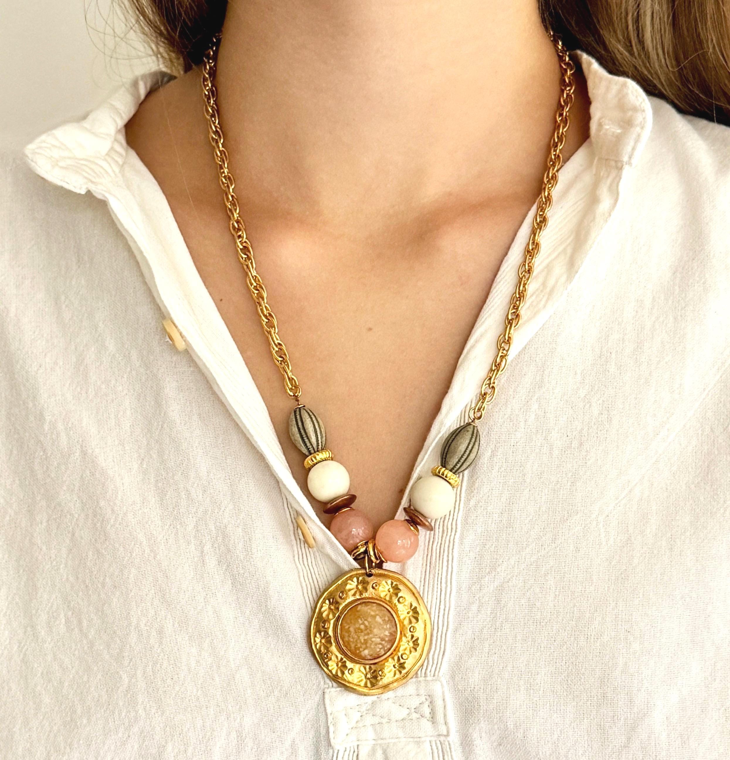 Boho vintage 70's/80's gold star-embossed medallion necklace with pastel tone bead accents