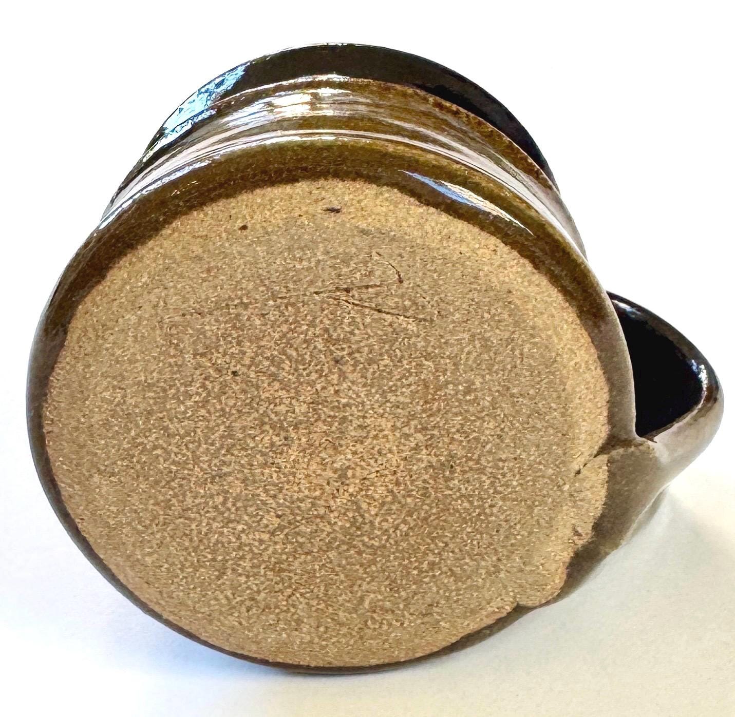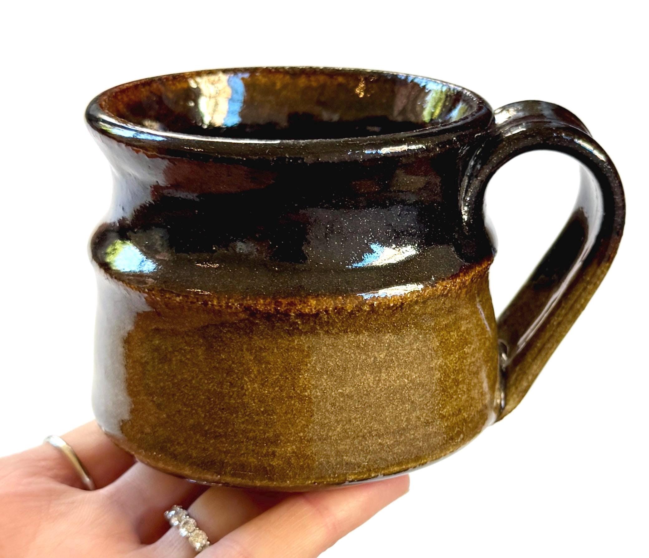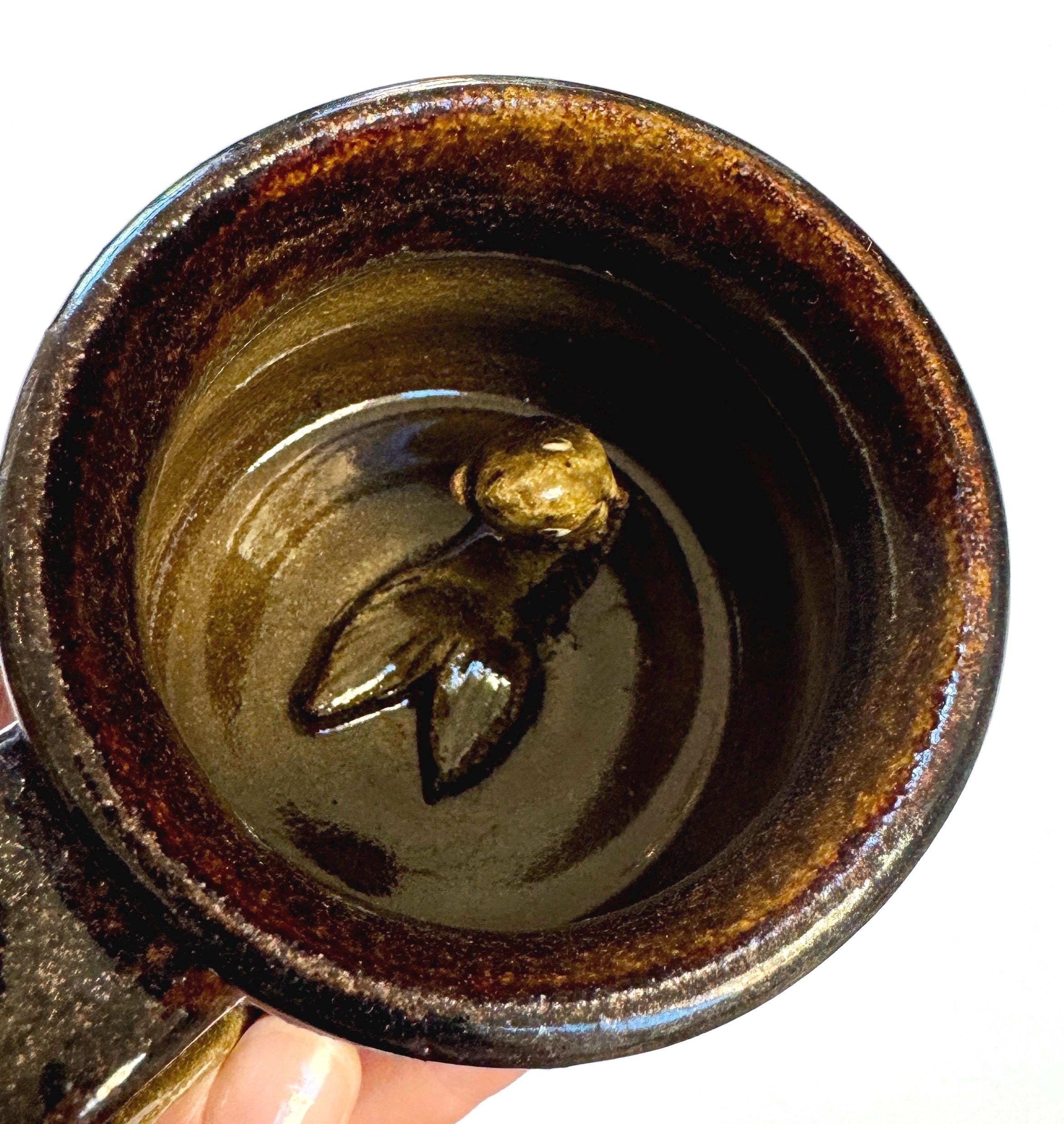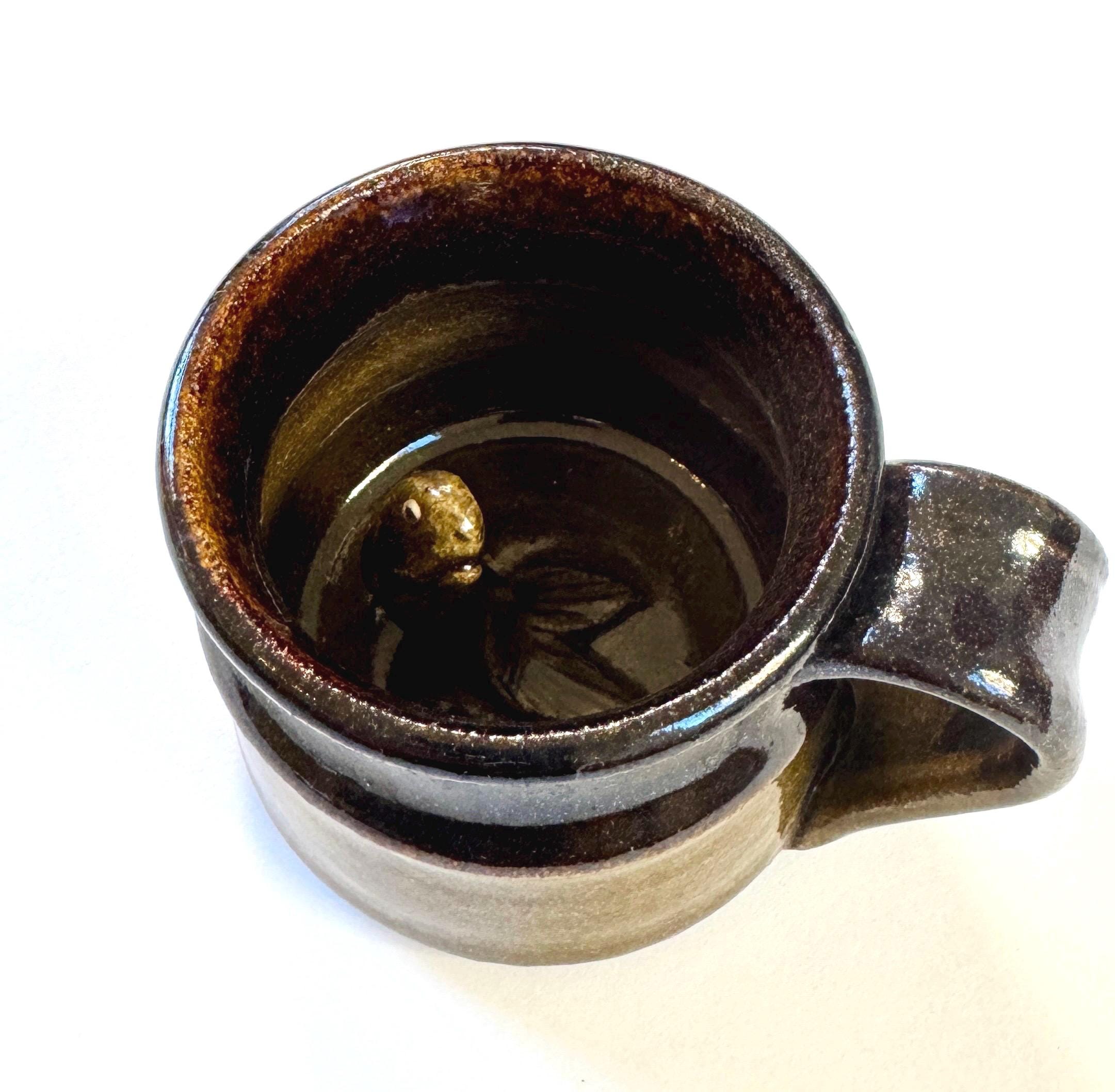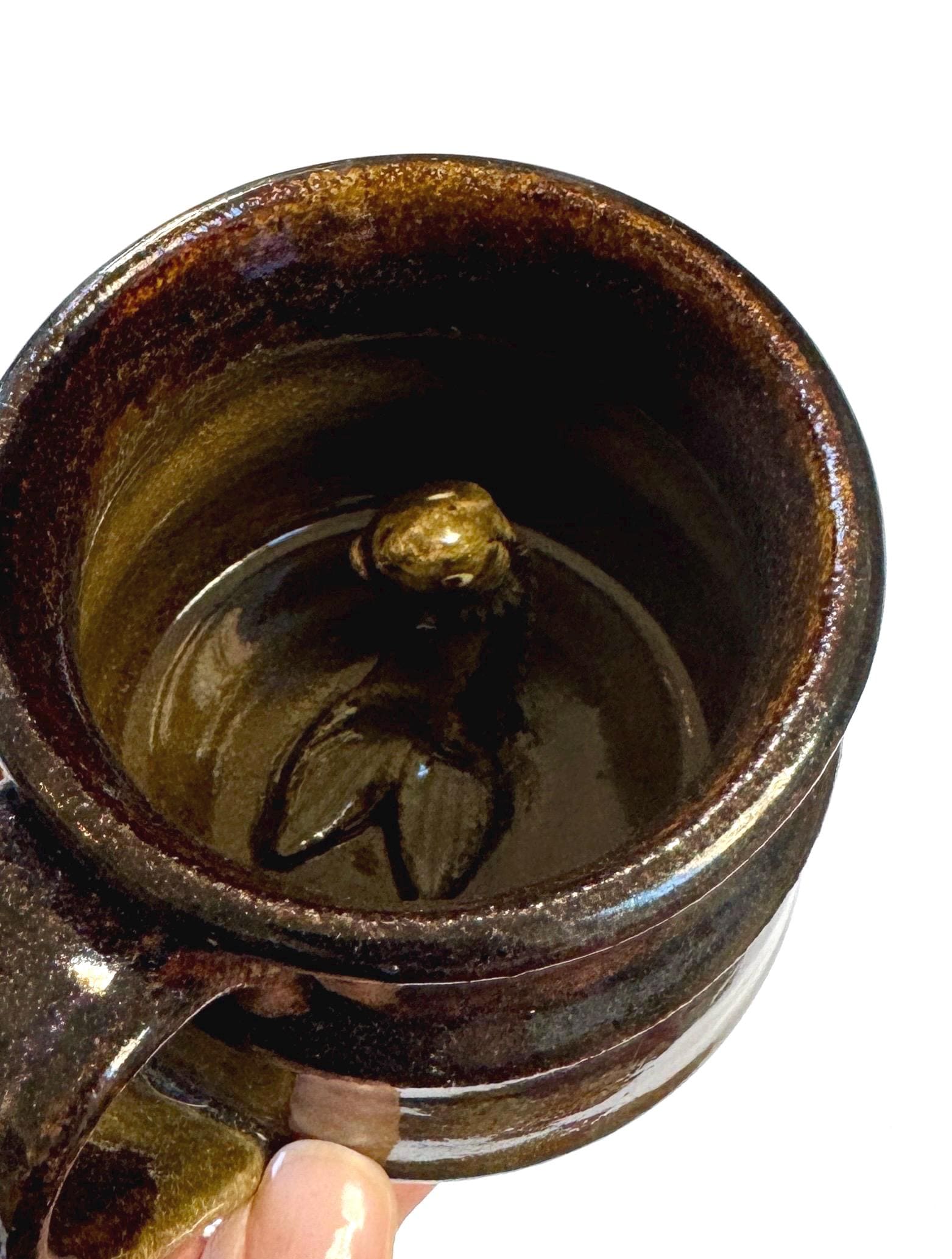 Vintage handmade pottery mug with a little 3D fish sculpture in the middle of the vessel