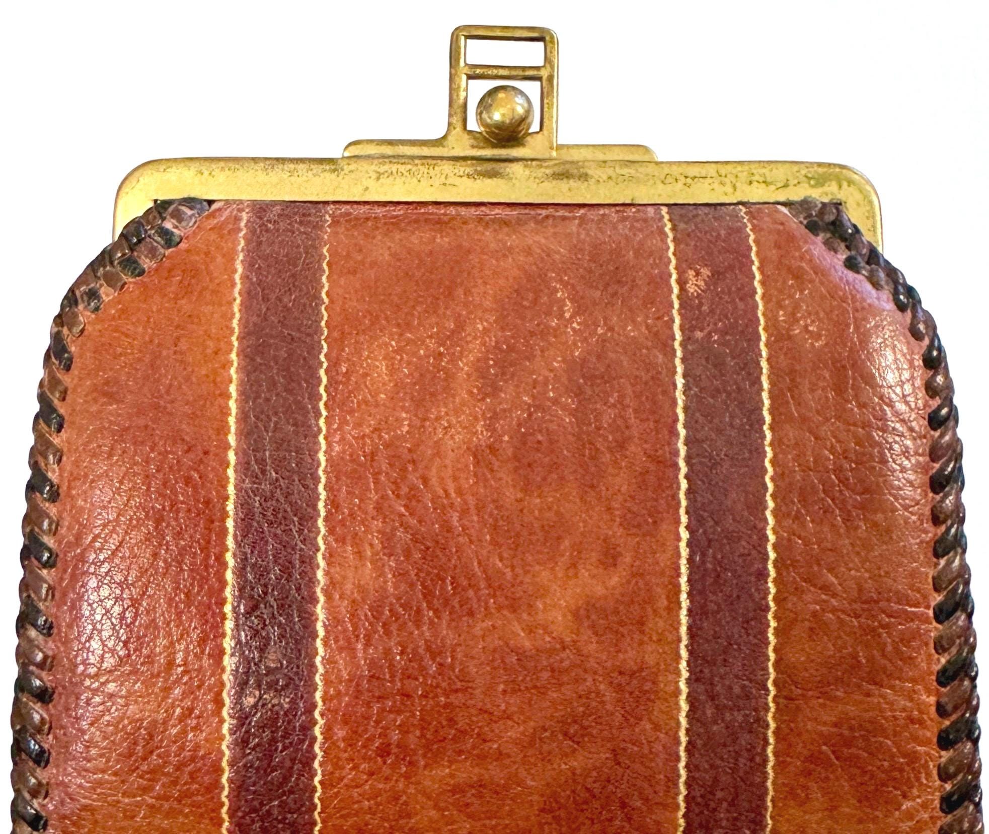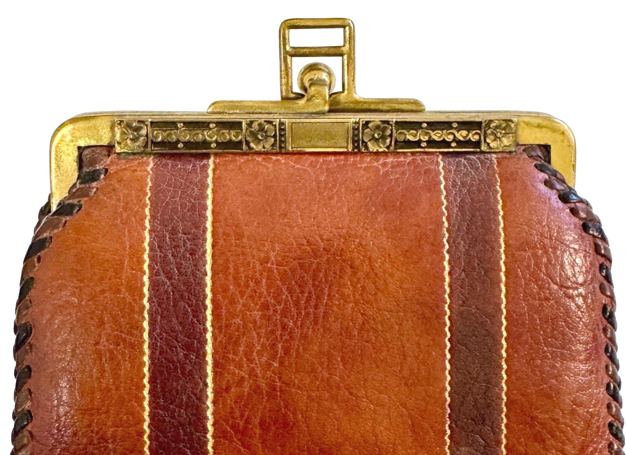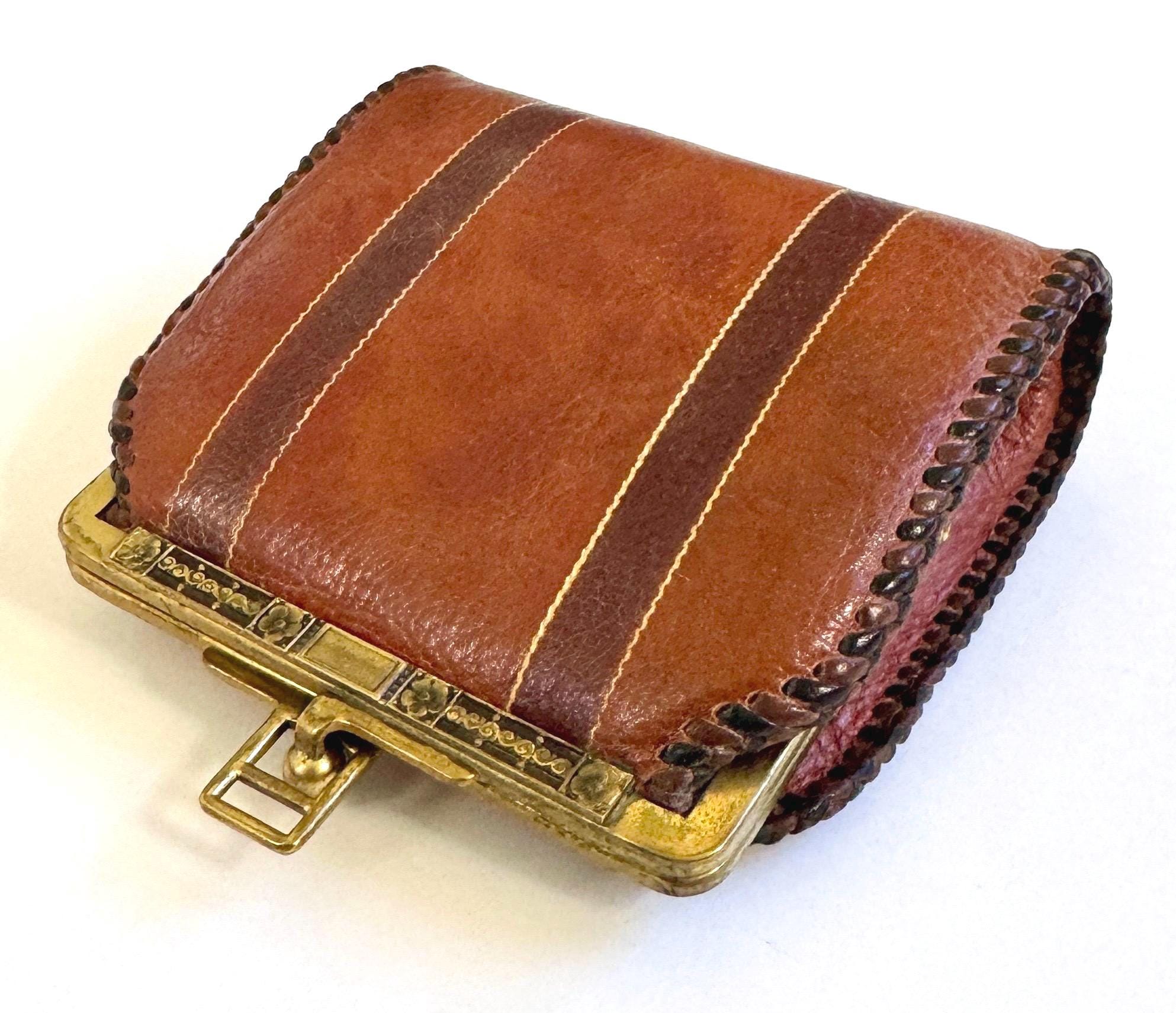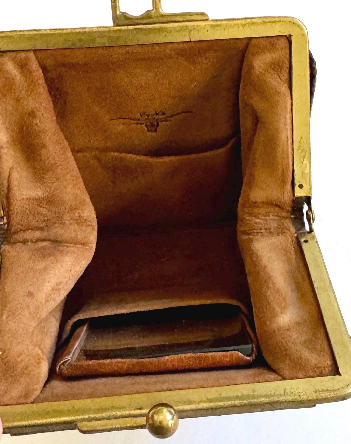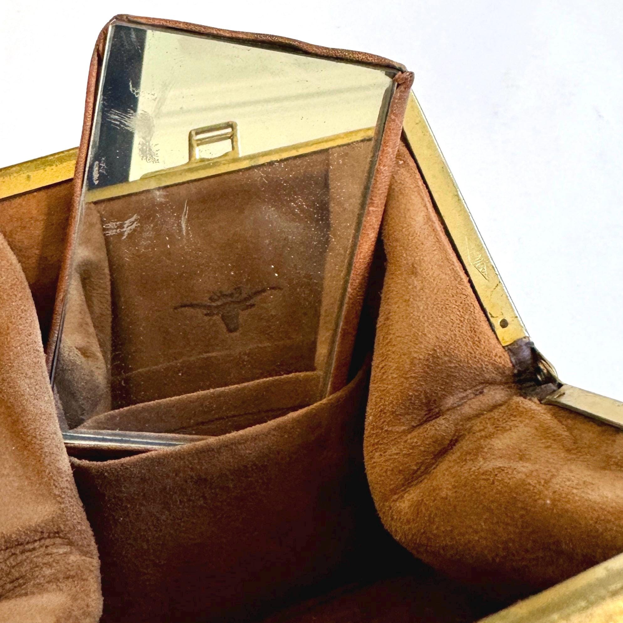 Charming little antique JEMCO leather bag with floral embossed frame & clasp and matching pocket mirror tucked in the inside pocket