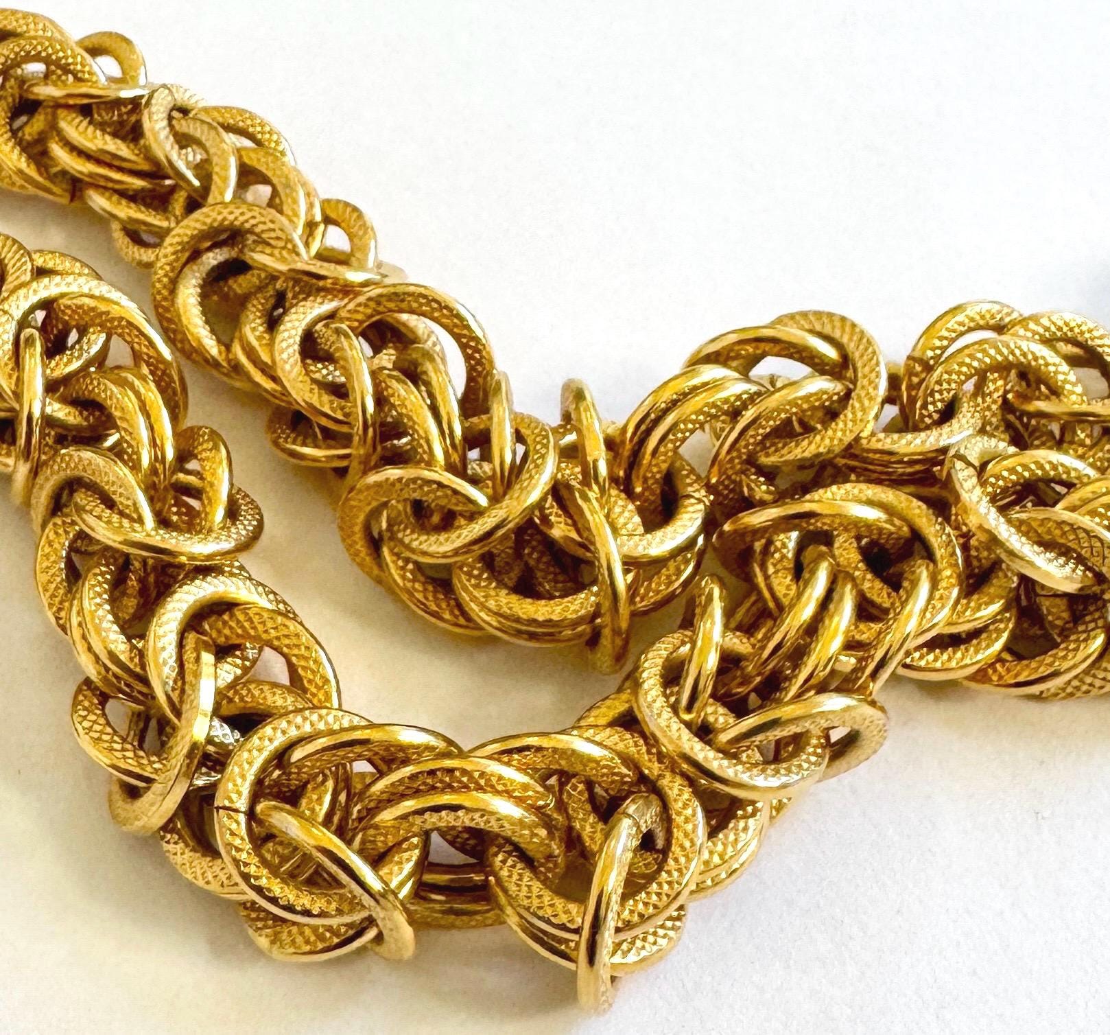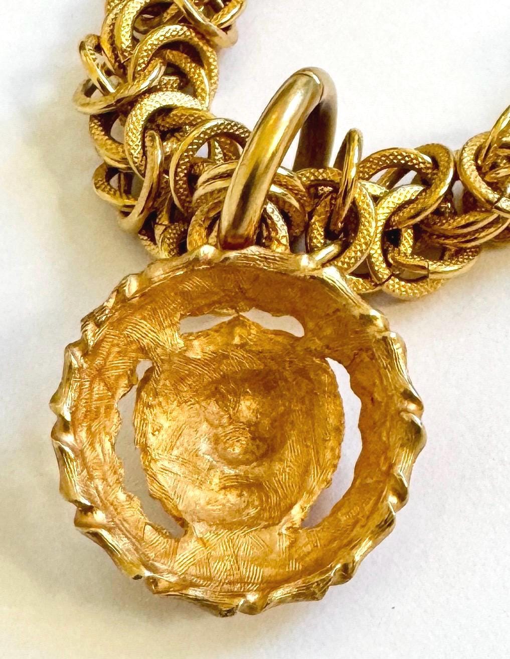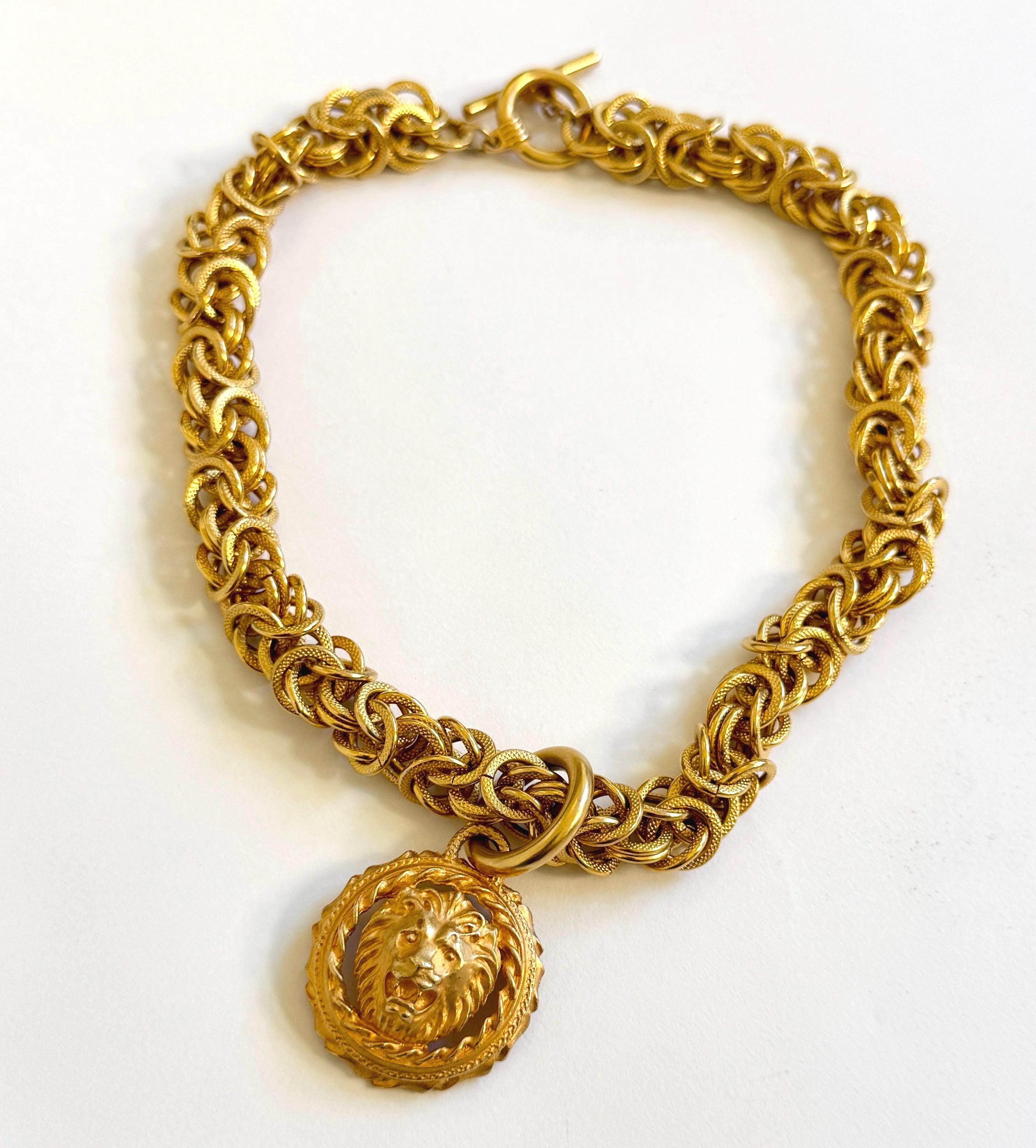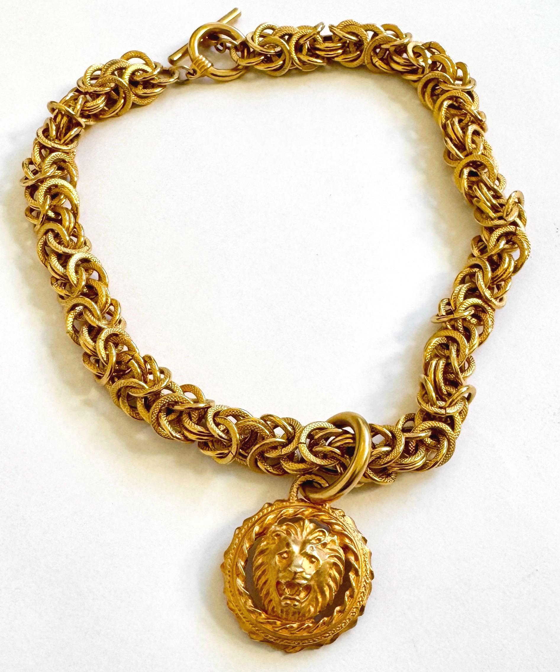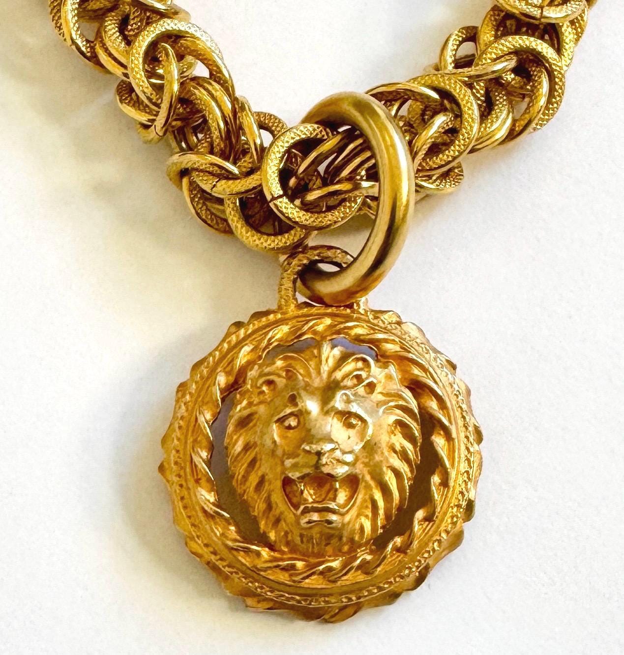 Chunky vintage gold tone chain link necklace with large lion head medallion pendant