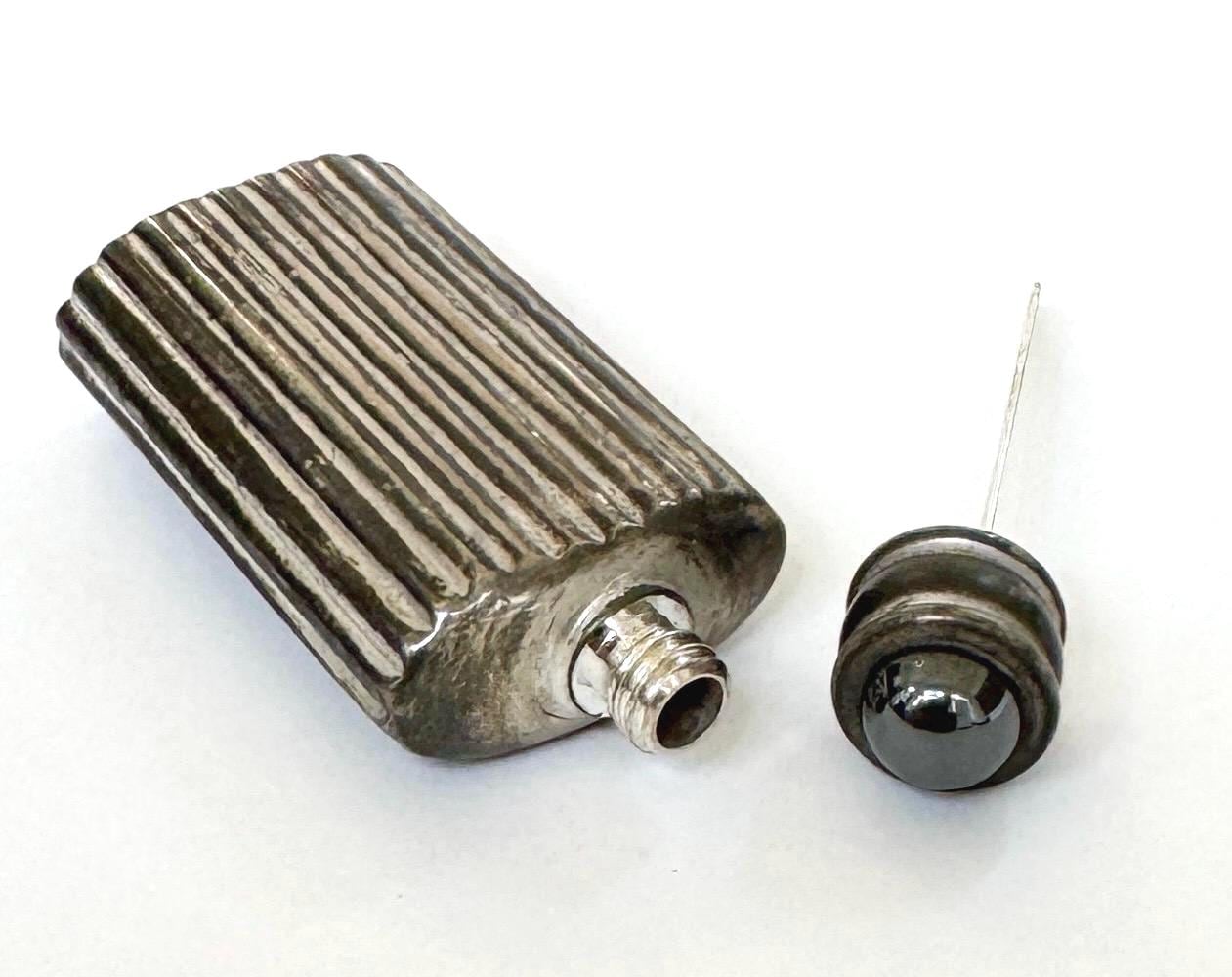 STYLE #2: Vintage ribbed silver plate perfume vial. Screw top dauber with polished hematite accent. Height (including lid): 1-5/8"