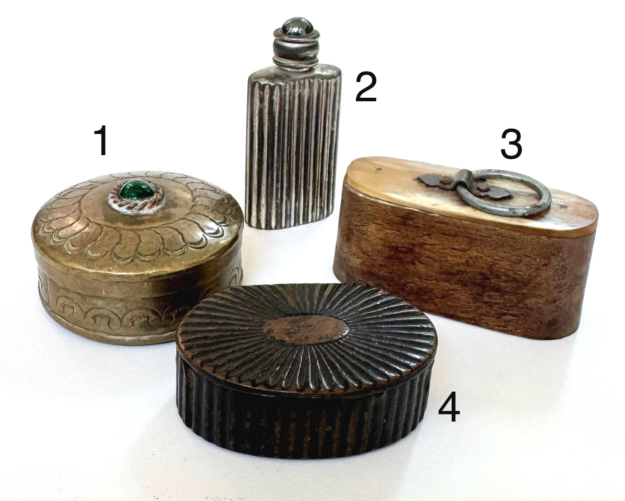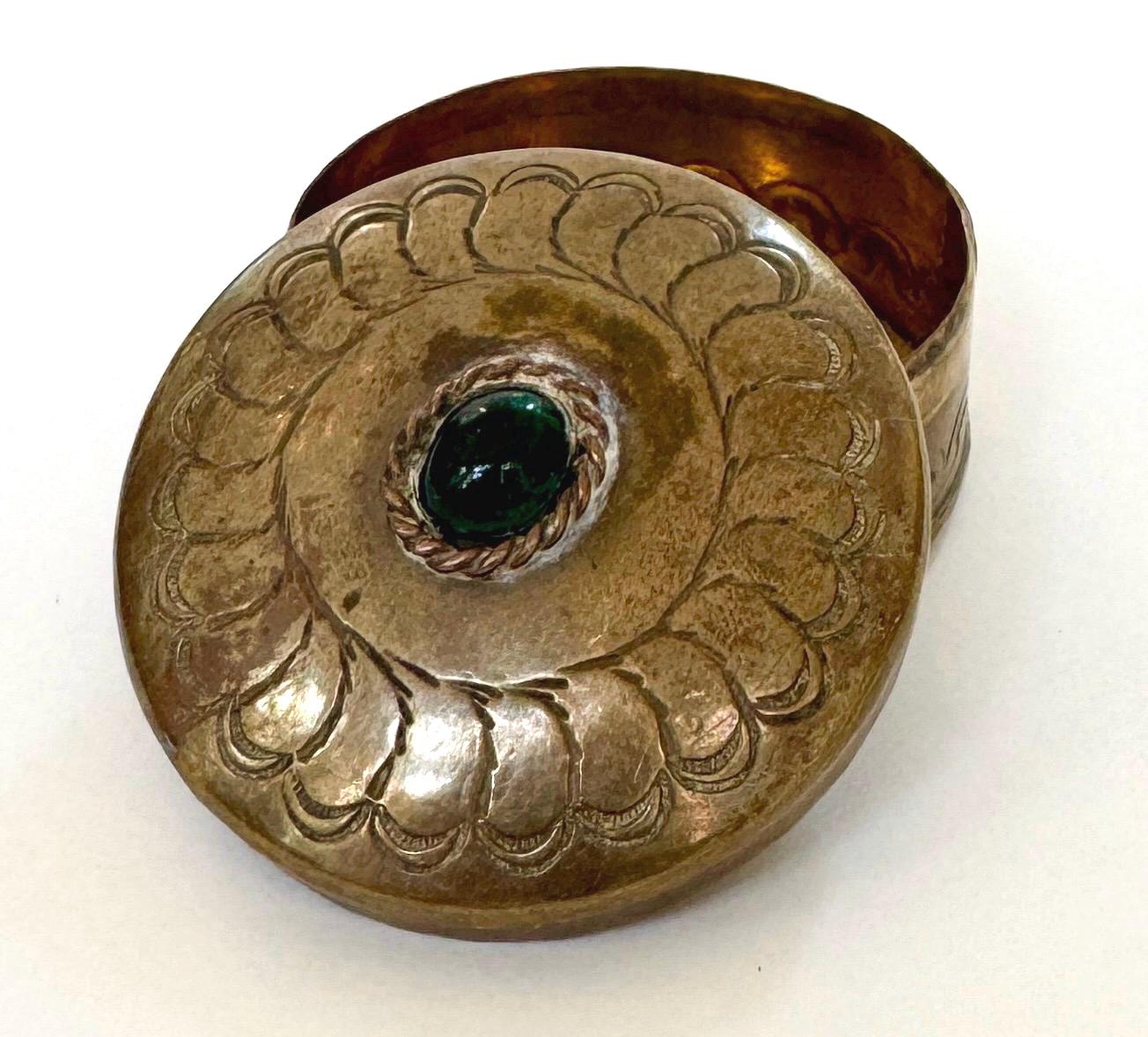 STYLE #1: Round engraved brass box with green glass cabochon detail on the lid. Diameter: 2-3/16"