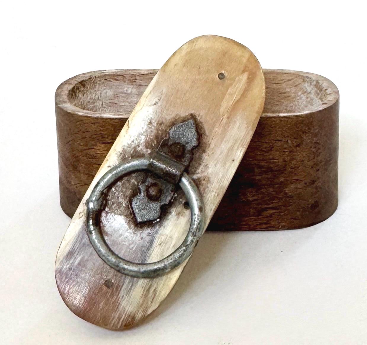 STYLE #3: Oblong wood box with bovine bone lid and ring handle. Length: 1-5/8" / Width: 1-1/8"/ Height (including lid): 1-1/4"