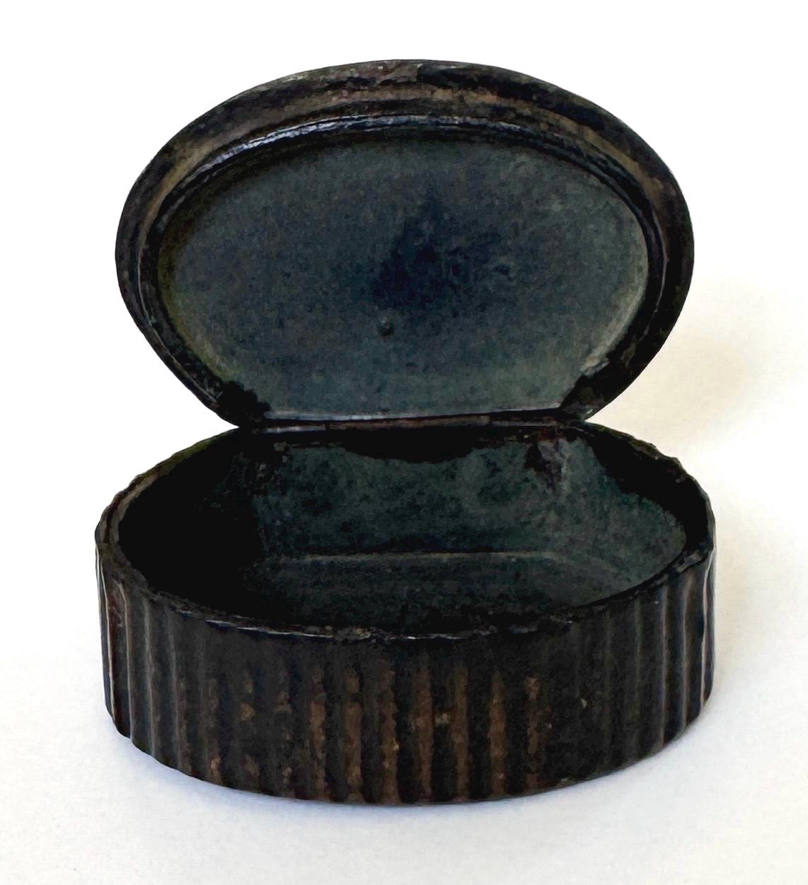 STYLE #4: Napoleonic era paper mâché hinged snuff box. Length: 2-1/4" / Width: 1-7/16" / Height: 3/4"