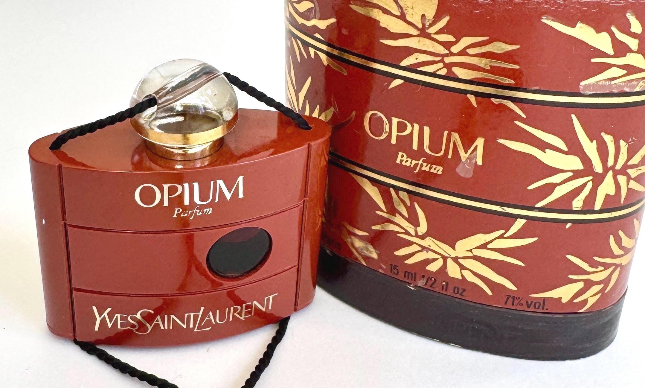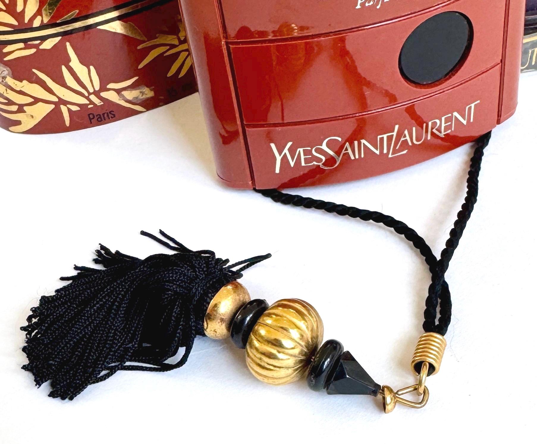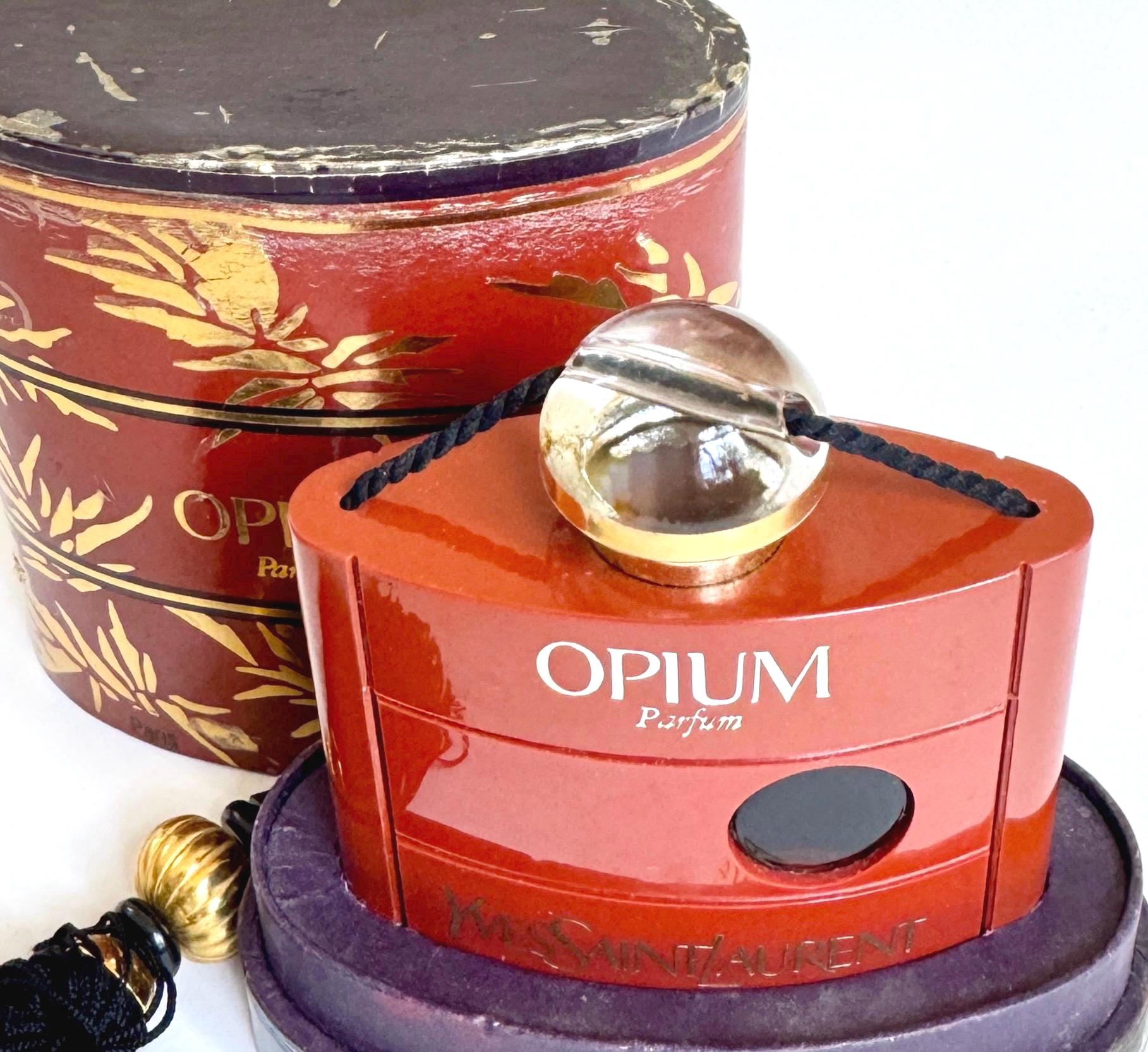 Vintage Yves Saint Laurent Opium parfum housed in a hard red plastic case with gold bead and black satin cord tassel