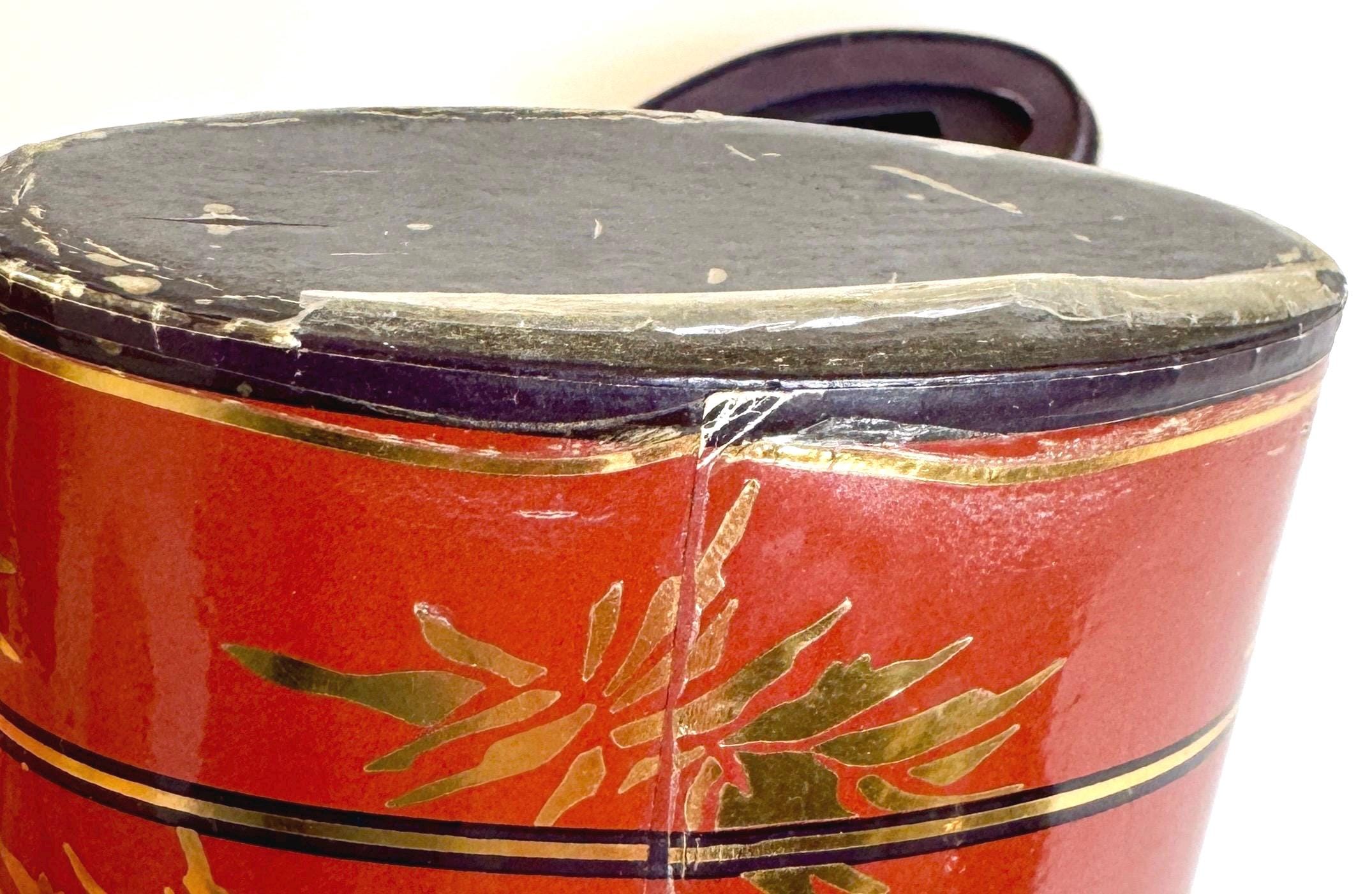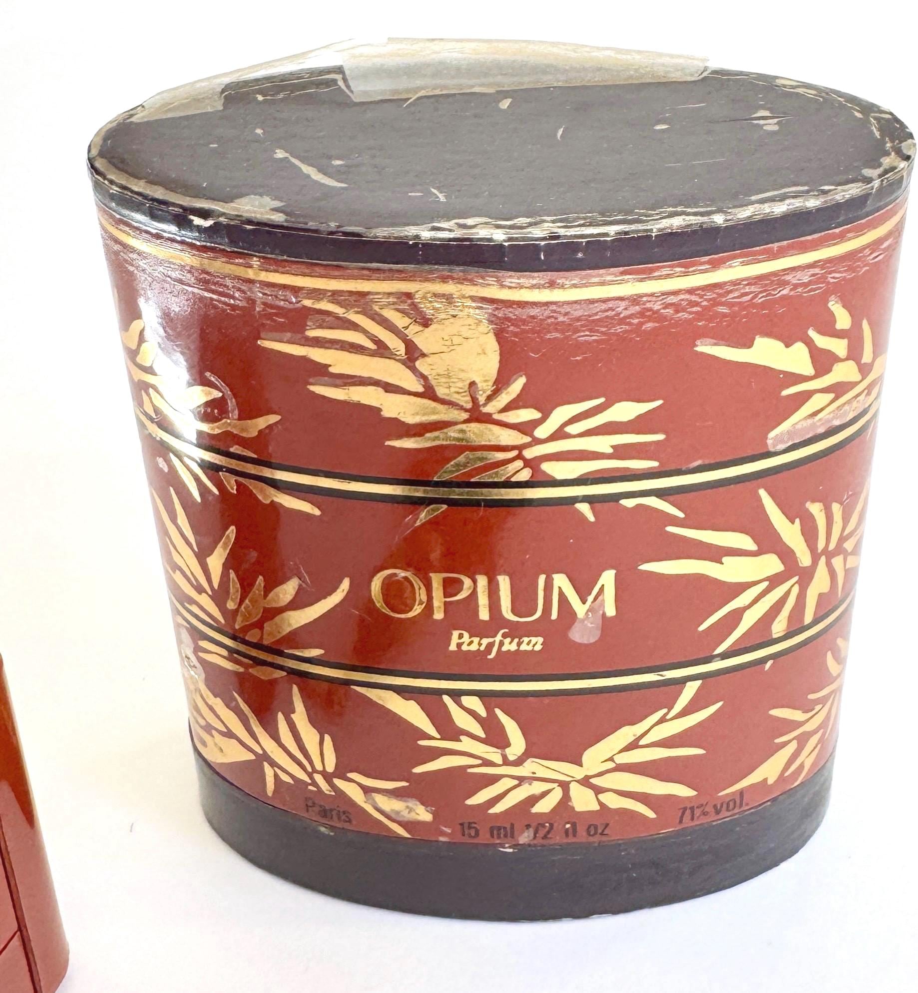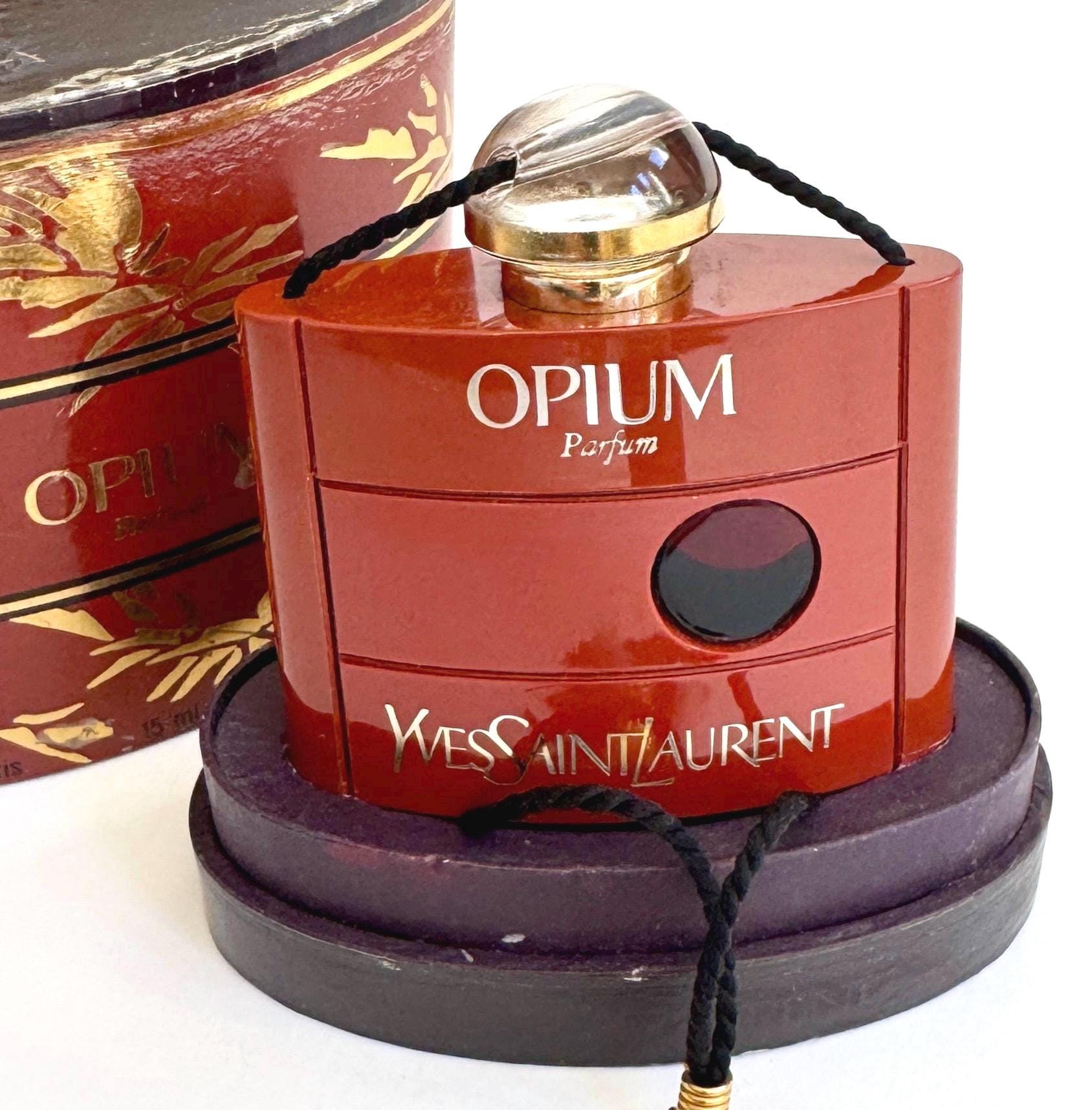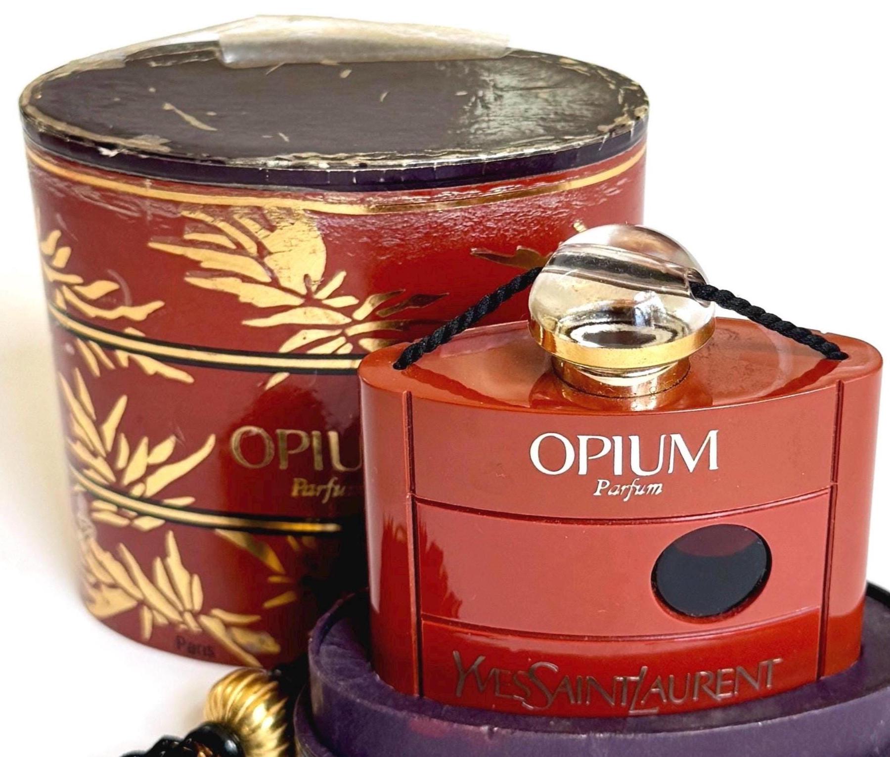 Vintage Yves Saint Laurent Opium parfum housed in a hard red plastic case with gold bead and black satin cord tassel